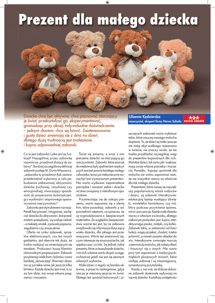 Prezent dla małego dziecka Dziecko chce być aktywne, chce poznawać otaczający je świat, przekształcać go, eksperymentować, gromadząc przy okazji indywidualne doświadczenia – jednym słowem: chce się bawić. Zainteresowania i gusta dzieci zmieniają się z dnia na dzień, dlatego dużą trudnością jest znalezienie i kupno odpowiedniej zabawki. Co to jest zabawka i jaka jest jej funkcja? Najogólniej przez zabawkę rozumie się „przedmiot służący do zabawy”. Bardziej szczegółową definicję zabawki podaje M. Dunin-Wąsowicz: „zabawka to przedmiot (lub zestaw przedmiotów) wykonany w celu pobudzenia zabawowej akty wności dziecka (ruchowej, umysłowej czy emocjonalnej), stwarzający sposobność do poszerzania doświadczeń, gry wyobraźni i stopniowego opanowy wania rzeczy wistości”. Zabawka jest stymulatorem rozwoju. Potrafi fascynować, intrygować, zachęcać dziecko do aktywności. Jest przedmiotem pożądania, wywołuje radość – a niekiedy smutek, z powodu popsucia, zagubienia czy zniszczenia. Oferta na rynku zabawek, sprzętów elektronicznych, czy też innych gadżetów, jest obecnie tak duża, że trudno nadążyć za zmieniającymi się trendami. Producenci kuszą klientów różnorodnymi propozycjami. Zabawki przybierają wiele form i kolorów, coraz bardziej „dziwaczeją”. Również i dzieci nie są już takie same jak jeszcze kilka lat temu. Każde dziecko jest inne, a co za tym idzie, ma swoje własne pragnienia i marzenia. Świat się zmienia, a wraz z nim patrzenie dziecka na otaczającą go rzeczywistość. Zabawki, które jeszcze do niedawna były spełnieniem najskrytszych marzeń prawie każdego małego człowieka, teraz już niekoniecznie muszą być tym wymarzonym prezentem. Nie warto wydawać niepotrzebnie pieniądze i narażać siebie i dziecko na stres związany z nietrafionym upominkiem. Przymierzając się do zakupu prezentu, warto zapoznać się z ofertą firm, które posiadają zabawki z odpowiednimi atestami, co oznacza, że są wyprodukowane z bezpiecznych materiałów. Ze względów bezpieczeństwa ważne też jest, by na zabawce znajdowała się informacja dotycząca wieku dziecka, dla jakiego jest przeznaczona. Warto te¿ zastanowić się, czym interesuje się nasza pociecha, jak spędza czas i co lubi. Są jednak i takie prezenty, które ucieszą każde dziecko, i na nich właśnie warto skupić uwagę, zwłaszcza jeżeli nie jest się pewnym własnych wyborów. Małe dzieci z reguły są bardzo aktywne, a przez to roztargnione, gdyż otacza je nieznany jeszcze im świat. Dlatego też spośród kolorowych i pi- Lilianna Kędzierska nauczyciel, ekspert firmy Nowa Szkoła szczących zabawek warto wybierać takie, które nauczą naszego malucha skupienia. To, że dzieci są małe i jeszcze nie mają zbyt wielkiego rozeznania w świecie, nie znaczy wcale, że nie trzeba przykładać szczególnej wagi do prezentów kupowanych dla nich. Malutkie dzieci, tak samo jak i większe, mają swoje własne potrzeby i marzenia. Ponadto, kupując upominek dla malucha nie wolno zapominać nam, że nie wszystkie rzeczy są właściwe dla tak małego dziecka. Prezentami, które cieszą się największą popularnością wśród rodziców i dzieci, są zabawki interakty wne: edukacyjny laptop wydający dźwięki, minitelefon komórkowy, czy miś, który podczas przytulania śpiewa, mówi i porusza się. Każde małe dziecko marzy o własnym zwierzaku, dlatego ciekawym pomysłem jest kupno interaktywnego pieska, małpki, czy kotka. Zabawki takie, w zależności od ilości funkcji, mogą szczekać, chodzić, trzeba je karmić, a nawet czasami układać do snu. Interaktywne zwierzęta nauczą z pewnością malucha, jak należy dbać i troszczyć się o innych. Nie warto przy tym zapominać o tradycyjnych, miękkich pluszowych misiach, które umilają zabawę i są niezastąpioną, sympatyczną przytulanką. Każdy z nas wie, że dobrze dobrane zabawki doskonale wpływają na rozwój dziecka. Kształtują umiejętności i sprawności, rozwijają zmysły, niektóre uczą kolorów, kształtów, jeszcze inne pobudzają wyobraźnię czy wspomagają rozwój ruchowy dziecka. Badania wskazują, że są zabawki, które wpły wają na rozwój dziecka szybciej, inne zaś wolniej. Zabawka nie musi być droga ani też firmowa, aby mogła w odpowiedni sposób edukować dziecko. Na uwagę zasługują zabawki dydaktyczne, które wpływają na rozwój pamięci, uwagi i myślenia (poprzez dokony wanie takich operacji, jak: porówny wanie, wnioskowanie itp.), rozszerzają zakres wiadomości oraz przyczyniają się do rozwoju mowy. Wśród zabawek wykorzystywanych do zabaw dydaktycznych jako pierwsze wyróżnić należy te, za pomocą których można wpływać na rozwój pojęć, zasób słownictwa, inspirować i kształtować sposób wypowiedzi dziecka. Pomocne tu będą książeczki, które jak każda zabawka, muszą być dostosowane do wieku dziecka. Dużym zainteresowaniem wśród dzieci cieszą się klocki różnych rozmiarów, drewniane bądź z plastiku, które nie tylko rozwijają wyobraźnię, ale pozwalają tworzyć indywidualne konstrukcje poprzez szeregowanie i budowanie. Godne polecenia są różne sortery z klockami w kształcie brył geometrycznych, które wkłada się do pojemniczka poprzez pasujące kształtem otwory. Ciekawym pomysłem okażą się labirynty manipulacyjne o różnym stopniu trudności, rozwijające wyobraźnię, koordynację wzrokowo-ruchową i usprawniające motorykę rąk. Spora grupa dzieci lubi zabawę układankami oraz puzzlami, które swoją kolorystyką i tematyką zachęcają do zabawy. Wraz z wiekiem dziecka rośnie jego zainteresowanie środowiskiem, w którym przeby wa. Zabawy zmieniają swój charakter od prostych po coraz bardziej skomplikowane. Oczywiście, dzieci rozwijają się w swoim tempie i nie każdemu dziecku przypadnie do gustu zabawa puzzlami czy odpychanie się na jeździku, dlatego nie obdarowuj małego 