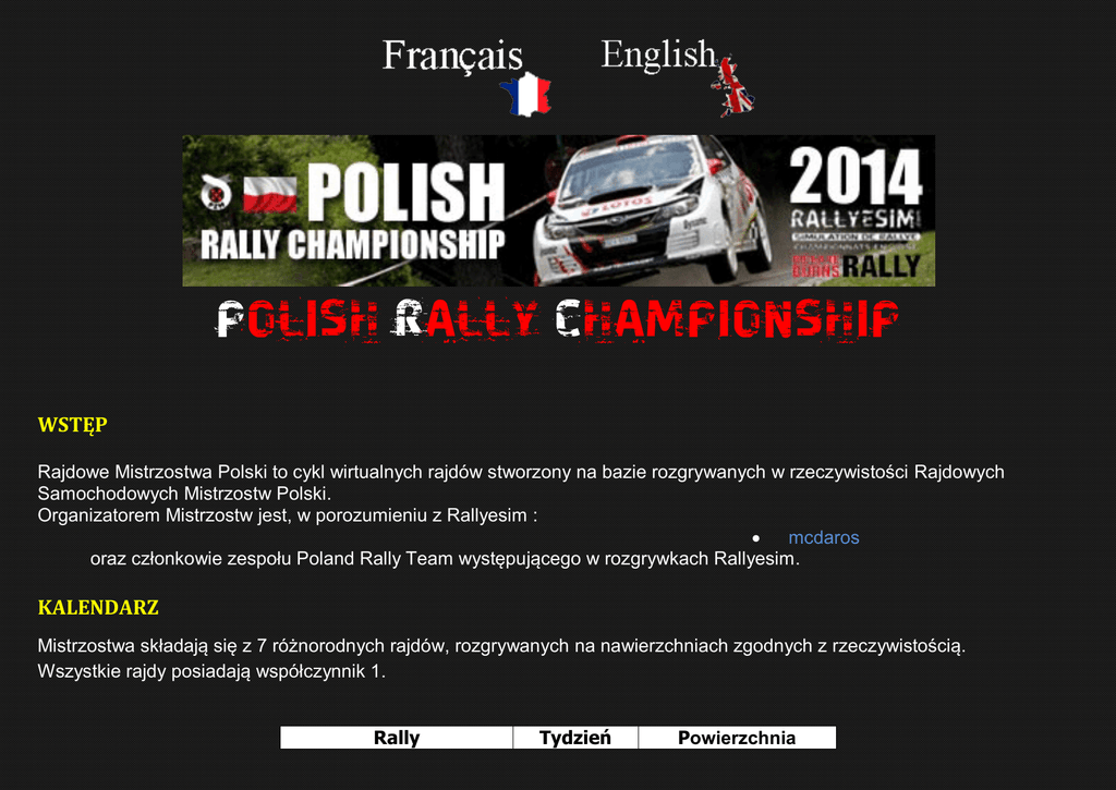 POLISH RALLY CHAMPIONSHIP WSTĘP Rajdowe Mistrzostwa Polski to cykl wirtualnych rajdów stworzony na bazie rozgrywanych w rzeczywistości Rajdowych Samochodowych Mistrzostw Polski. Organizatorem Mistrzostw jest, w porozumieniu z Rallyesim : mcdaros oraz członkowie zespołu Poland Rally Team występującego w rozgrywkach Rallyesim. KALENDARZ Mistrzostwa składają się z 7 różnorodnych rajdów, rozgrywanych na nawierzchniach zgodnych z rzeczywistością. Wszystkie rajdy posiadają współczynnik 1. Rally Tydzień Powierzchnia Rajd Arlamow Rajd Swidnicki Rajd Warminski Rajd Karkonoski Rajd Rzeszowski Rajd Wisly Rajd Nadwislanski Rajd Polski Rajd Dolnoslaski Rajd Cieszynska Barborka Week 7 Week 11 Week 16 Week 22 Week 32 Week 35 Week 38 Week 40 Week 42 Week 49 Snow Tarmac Gravel Tarmac Tarmac Tarmac Tarmac Gravel Tarmac Tarmac REJESTRACJA Nie jest wymagana żadna formalna rejestracja. Aby uczestniczyć w Mistrzostwach Polski należy wybrać odpowiedni samochód w swoim profilu kierowcy i rozpocząć rywalizację. PRZEPISY Ogolny regulamin Rallyesim (English version) SZCZEGÓŁY MISTRZOSTW Każdy z rajdów składa się z 2 dni. Nawierzchnie są zgodne z nawierzchniami odpowiednich rajdów rozgrywanych w rzeczywistości. Daty rozgrywania rajdów będą możliwie zbliżone do terminów rzeczywistych rajdów. Publikacja Książki Drogowej nastąpi tydzień przed planowanym rajdem. UPRAWNIONE SAMOCHODY Podział na 9 następujących klas i w ich obrębie uprawnione auta : Klasa 1 Klasa 2 Klasa 3 Klasa 4 Klasa 5 Klasa 6 Klasa 7 Klasa 8 N42000 & RRC / R4 N4 GT10 A7 / A6K / R3 A6 / R2 A5 / A5K N3 N2 / R1 N1 Klasa 9 DODATKOWY PUCHAR Kierowcy, którzy wybrali samochód z przednim napędem (spośród dopuszczonych do mistrzostw) automatycznie startują w pucharze "FWD Challenge". ZMIANY SAMOCHODU W TRAKCIE SEZONU Istnieje możliwość dwukrotnej zmiany samochodu w trakcie sezonu. Każda zmiana samochodu pomiędzy klasami, będzie się wiązać z zakończeniem kumulacji zdobytych punktów w danej klasie. Od chwili takiej zmiany, kierowca będzie gromadził punkty w nowej klasie. SYSTEM ZNISZCZEŃ Poziom zniszczeń samochodu podczas Mistrzostw ustalony jest jako "reduced". Za każdy nie ukończony lub pominięty odcinek specjalny, nakładana jest kara 3 minut liczona od najlepszego osiągnięcia w danej klasie. W Mistrzostwach można korzystać z zasady super-rally. KLASYFIKACJE Klasyfikacja generalna Dla wszystkich dopuszczonych aut. Klasyfikacja w poszczególnych klasach Klasy 1 / 2 / 3 / 4 / 5 / 6 / 7 / 8 / 9 Klasyfikacja w pucharze "FWD Challenge" Dla wszystkich dopuszczonych aut z przednim napędem. Miejsce 1 2 3 4 5 6 7 8 9 10 11 12 13 14 15 16 17 18 19 20 Klasyfikacja Polskich kierowców Punkty 30 25 20 18 16 15 14 13 12 11 10 9 8 7 6 5 4 3 2 1 Miejsce 1 2 3 4 5 6 7 8 9 10 Punkty 15 12 10 8 6 5 4 3 2 1