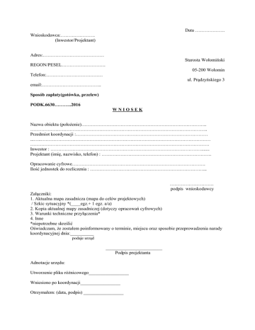 Data ………………. Wnioskodawca:…………………. (Inwestor/Projektant) Adres:………………………………… Starosta Wołomiński REGON/PESEL………………………. 05-200 Wołomin Telefon:……………………………… ul. Prądzyńskiego 3 email:……………………………….. Sposób zapłaty(gotówka, przelew) PODK.6630………..2016 WNIOSEK Nazwa obiektu (położenie)…………………………………………………………………….. ………………………………………………………………………………………………….. Przedmiot koordynacji :………………………………………………………………………… ...…..……………………………………………………………………………………………… …………………………………………………………………………………………………… Inwestor : ……………………………………………………………………………………....... Projektant (imię, nazwisko, telefon) : ……………………………………………………………. Opracowanie cyfrowe…………………………………………………………………………. Ilość jednostek do rozliczenia : ………………………………………………………………... ………………………. podpis wnioskodawcy Załączniki: 1. Aktualna mapa zasadnicza (mapa do celów projektowych) / Szkic sytuacyjny *(____egz.+ 1 egz. a/a) 2. Kopia aktualnej mapy zasadniczej (dotyczy opracowań cyfrowych) 3. Warunki techniczne przyłączenia* 4. Inne *niepotrzebne skreślić Oświadczam, że zostałem poinformowany o terminie, miejscu oraz sposobie przeprowadzenia narady koordynacyjnej dnia:__________ podaje urząd ________________________ Podpis projektanta Adnotacje urzędu: Utworzenie pliku różnicowego_________________ Wniesiono po koordynacji_________________ Otrzymałem: (data, podpis) _________________