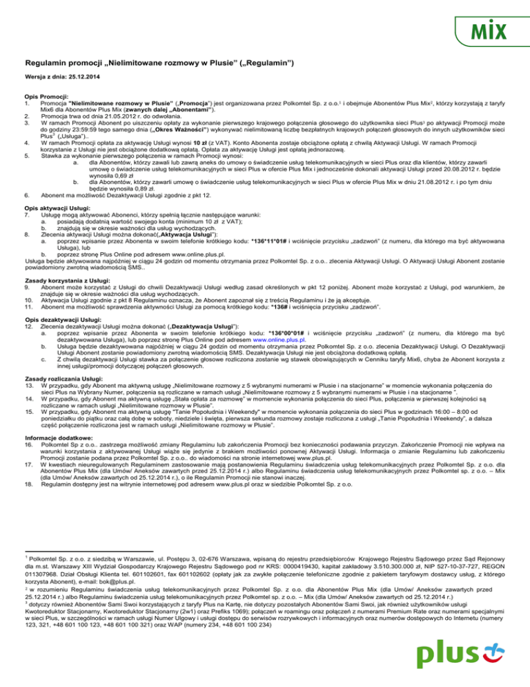 Regulamin promocji „Nielimitowane rozmowy w Plusie” („Regulamin”) Wersja z dnia: 25.12.2014 Opis Promocji: 1. Promocja "Nielimitowane rozmowy w Plusie” („Promocja”) jest organizowana przez Polkomtel Sp. z o.o. 1 i obejmuje Abonentów Plus Mix2, którzy korzystają z taryfy Mix6 dla Abonentów Plus Mix (zwanych dalej „Abonentami”). 2. Promocja trwa od dnia 21.05.2012 r. do odwołania. 3. W ramach Promocji Abonent po uiszczeniu opłaty za wykonanie pierwszego krajowego połączenia głosowego do użytkownika sieci Plus3 po aktywacji Promocji może do godziny 23:59:59 tego samego dnia („Okres Ważności”) wykonywać nielimitowaną liczbę bezpłatnych krajowych połączeń głosowych do innych użytkowników sieci 3 Plus („Usługa”).. 4. W ramach Promocji opłata za aktywację Usługi wynosi 10 zł (z VAT). Konto Abonenta zostaje obciążone opłatą z chwilą Aktywacji Usługi. W ramach Promocji korzystanie z Usługi nie jest obciążone dodatkową opłatą. Opłata za aktywację Usługi jest opłatą jednorazową. 5. Stawka za wykonanie pierwszego połączenia w ramach Promocji wynosi: a. dla Abonentów, którzy zawali lub zawrą aneks do umowy o świadczenie usług telekomunikacyjnych w sieci Plus oraz dla klientów, którzy zawarli umowę o świadczenie usług telekomunikacyjnych w sieci Plus w ofercie Plus Mix i jednocześnie dokonali aktywacji Usługi przed 20.08.2012 r. będzie wynosiła 0,69 zł b. dla Abonentów, którzy zawarli umowę o świadczenie usług telekomunikacyjnych w sieci Plus w ofercie Plus Mix w dniu 21.08.2012 r. i po tym dniu będzie wynosiła 0,89 zł. 6. Abonent ma możliwość Dezaktywacji Usługi zgodnie z pkt 12. Opis aktywacji Usługi: 7. Usługę mogą aktywować Abonenci, którzy spełnią łącznie następujące warunki: a. posiadają dodatnią wartość swojego konta (minimum 10 zł z VAT); b. znajdują się w okresie ważności dla usług wychodzących. 8. Zlecenia aktywacji Usługi można dokonać(„Aktywacja Usługi”): a. poprzez wpisanie przez Abonenta w swoim telefonie krótkiego kodu: *136*11*01# i wciśnięcie przycisku „zadzwoń” (z numeru, dla którego ma być aktywowana Usługa), lub b. poprzez stronę Plus Online pod adresem www.online.plus.pl. Usługa będzie aktywowana najpóźniej w ciągu 24 godzin od momentu otrzymania przez Polkomtel Sp. z o.o.. zlecenia Aktywacji Usługi. O Aktywacji Usługi Abonent zostanie powiadomiony zwrotną wiadomością SMS.. Zasady korzystania z Usługi: 9. Abonent może korzystać z Usługi do chwili Dezaktywacji Usługi według zasad określonych w pkt 12 poniżej. Abonent może korzystać z Usługi, pod warunkiem, że znajduje się w okresie ważności dla usług wychodzących. 10. Aktywacja Usługi zgodnie z pkt 8 Regulaminu oznacza, że Abonent zapoznał się z treścią Regulaminu i że ją akceptuje. 11. Abonent ma możliwość sprawdzenia aktywności Usługi za pomocą krótkiego kodu: *136# i wciśnięcia przycisku „zadzwoń”. Opis dezaktywacji Usługi: 12. Zlecenia dezaktywacji Usługi można dokonać („Dezaktywacja Usługi”): a. poprzez wpisanie przez Abonenta w swoim telefonie krótkiego kodu: *136*00*01# i wciśnięcie przycisku „zadzwoń” (z numeru, dla którego ma być dezaktywowana Usługa), lub poprzez stronę Plus Online pod adresem www.online.plus.pl. b. Usługa będzie dezaktywowana najpóźniej w ciągu 24 godzin od momentu otrzymania przez Polkomtel Sp. z o.o. zlecenia Dezaktywacji Usługi. O Dezaktywacji Usługi Abonent zostanie powiadomiony zwrotną wiadomością SMS. Dezaktywacja Usługi nie jest obciążona dodatkową opłatą. c. Z chwilą dezaktywacji Usługi stawka za połączenie głosowe rozliczona zostanie wg stawek obowiązujących w Cenniku taryfy Mix6, chyba że Abonent korzysta z innej usługi/promocji dotyczącej połączeń głosowych. Zasady rozliczania Usługi: 13. W przypadku, gdy Abonent ma aktywną usługę „Nielimitowane rozmowy z 5 wybranymi numerami w Plusie i na stacjonarne” w momencie wykonania połączenia do sieci Plus na Wybrany Numer, połączenia są rozliczane w ramach usługi „Nielimitowane rozmowy z 5 wybranymi numerami w Plusie i na stacjonarne ”. 14. W przypadku, gdy Abonent ma aktywną usługę „Stała opłata za rozmowę” w momencie wykonania połączenia do sieci Plus, połączenia w pierwszej kolejności są rozliczane w ramach usługi „Nielimitowane rozmowy w Plusie”. 15. W przypadku, gdy Abonent ma aktywną usługę "Tanie Popołudnia i Weekendy" w momencie wykonania połączenia do sieci Plus w godzinach 16:00 – 8:00 od poniedziałku do piątku oraz całą dobę w soboty, niedziele i święta, pierwsza sekunda rozmowy zostaje rozliczona z usługi „Tanie Popołudnia i Weekendy”, a dalsza część połączenie rozliczona jest w ramach usługi „Nielimitowane rozmowy w Plusie”. Informacje dodatkowe: 16. Polkomtel Sp z o.o.. zastrzega możliwość zmiany Regulaminu lub zakończenia Promocji bez konieczności podawania przyczyn. Zakończenie Promocji nie wpływa na warunki korzystania z aktywowanej Usługi wiąże się jedynie z brakiem możliwości ponownej Aktywacji Usługi. Informacja o zmianie Regulaminu lub zakończeniu Promocji zostanie podana przez Polkomtel Sp. z o.o.. do wiadomości na stronie internetowej www.plus.pl. 17. W kwestiach nieuregulowanych Regulaminem zastosowanie mają postanowienia Regulaminu świadczenia usług telekomunikacyjnych przez Polkomtel Sp. z o.o. dla Abonentów Plus Mix (dla Umów/ Aneksów zawartych przed 25.12.2014 r.) albo Regulaminu świadczenia usług telekomunikacyjnych przez Polkomtel sp. z o.o. – Mix (dla Umów/ Aneksów zawartych od 25.12.2014 r.), o ile Regulamin Promocji nie stanowi inaczej. 18. Regulamin dostępny jest na witrynie internetowej pod adresem www.plus.pl oraz w siedzibie Polkomtel Sp. z o.o. 1 Polkomtel Sp. z o.o. z siedzibą w Warszawie, ul. Postępu 3, 02-676 Warszawa, wpisaną do rejestru przedsiębiorców Krajowego Rejes