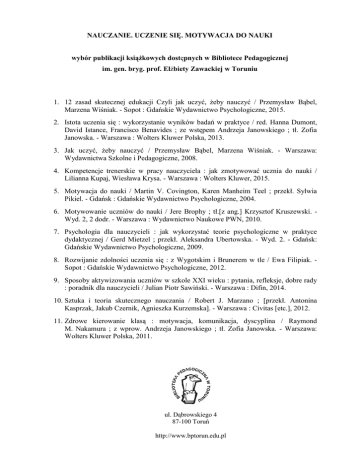 NAUCZANIE. UCZENIE SIĘ. MOTYWACJA DO NAUKI wybór publikacji ksiąŜkowych dostępnych w Bibliotece Pedagogicznej im. gen. bryg. prof. ElŜbiety Zawackiej w Toruniu 1. 12 zasad skutecznej edukacji Czyli jak uczyć, Ŝeby nauczyć / Przemysław Bąbel, Marzena Wiśniak. - Sopot : Gdańskie Wydawnictwo Psychologiczne, 2015. 2. Istota uczenia się : wykorzystanie wyników badań w praktyce / red. Hanna Dumont, David Istance, Francisco Benavides ; ze wstępem Andrzeja Janowskiego ; tł. Zofia Janowska. - Warszawa : Wolters Kluwer Polska, 2013. 3. Jak uczyć, Ŝeby nauczyć / Przemysław Bąbel, Marzena Wiśniak. - Warszawa: Wydawnictwa Szkolne i Pedagogiczne, 2008. 4. Kompetencje trenerskie w pracy nauczyciela : jak zmotywować ucznia do nauki / Lilianna Kupaj, Wiesława Krysa. - Warszawa : Wolters Kluwer, 2015. 5. Motywacja do nauki / Martin V. Covington, Karen Manheim Teel ; przekł. Sylwia Pikiel. - Gdańsk : Gdańskie Wydawnictwo Psychologiczne, 2004. 6. Motywowanie uczniów do nauki / Jere Brophy ; tł.[z ang.] Krzysztof Kruszewski. Wyd. 2, 2 dodr. - Warszawa : Wydawnictwo Naukowe PWN, 2010. 7. Psychologia dla nauczycieli : jak wykorzystać teorie psychologiczne w praktyce dydaktycznej / Gerd Mietzel ; przekł. Aleksandra Ubertowska. - Wyd. 2. - Gdańsk: Gdańskie Wydawnictwo Psychologiczne, 2009. 8. Rozwijanie zdolności uczenia się : z Wygotskim i Brunerem w tle / Ewa Filipiak. Sopot : Gdańskie Wydawnictwo Psychologiczne, 2012. 9. Sposoby aktywizowania uczniów w szkole XXI wieku : pytania, refleksje, dobre rady : poradnik dla nauczycieli / Julian Piotr Sawiński. - Warszawa : Difin, 2014. 10. Sztuka i teoria skutecznego nauczania / Robert J. Marzano ; [przekł. Antonina Kasprzak, Jakub Czernik, Agnieszka Kurzemska]. - Warszawa : Civitas [etc.], 2012. 11. Zdrowe kierowanie klasą : motywacja, komunikacja, dyscyplina / Raymond M. Nakamura ; z wprow. Andrzeja Janowskiego ; tł. Zofia Janowska. - Warszawa: Wolters Kluwer Polska, 2011. ul. Dąbrowskiego 4 87-100 Toruń http://www.bptorun.edu.pl