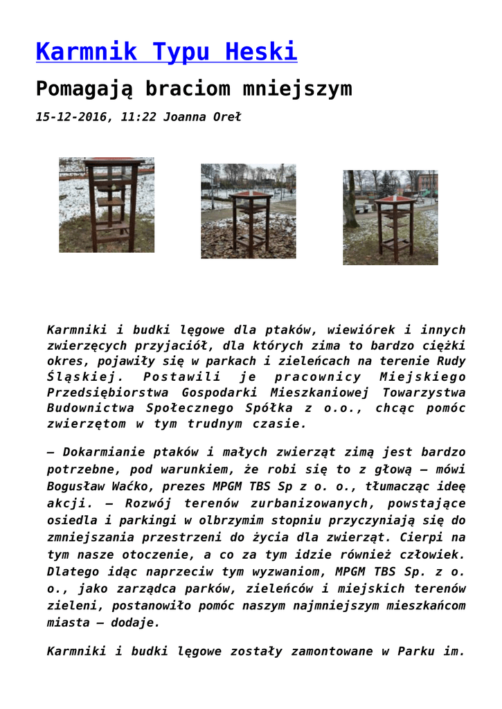 Karmnik Typu Heski Pomagają braciom mniejszym 15-12-2016, 11:22 Joanna Oreł Karmniki i budki lęgowe dla ptaków, wiewiórek i innych zwierzęcych przyjaciół, dla których zima to bardzo ciężki okres, pojawiły się w parkach i zieleńcach na terenie Rudy Śląskiej. Postawili je pracownicy Miejskiego Przedsiębiorstwa Gospodarki Mieszkaniowej Towarzystwa Budownictwa Społecznego Spółka z o.o., chcąc pomóc zwierzętom w tym trudnym czasie. – Dokarmianie ptaków i małych zwierząt zimą jest bardzo potrzebne, pod warunkiem, że robi się to z głową – mówi Bogusław Waćko, prezes MPGM TBS Sp z o. o., tłumacząc ideę akcji. – Rozwój terenów zurbanizowanych, powstające osiedla i parkingi w olbrzymim stopniu przyczyniają się do zmniejszania przestrzeni do życia dla zwierząt. Cierpi na tym nasze otoczenie, a co za tym idzie również człowiek. Dlatego idąc naprzeciw tym wyzwaniom, MPGM TBS Sp. z o. o., jako zarządca parków, zieleńców i miejskich terenów zieleni, postanowiło pomóc naszym najmniejszym mieszkańcom miasta – dodaje. Karmniki i budki lęgowe zostały zamontowane w Parku im. Augustyna Kozioła przy ul. Ballestremów/Piastowskiej w Rudzie, Parku Strzelnica w Bielszowicach, Parku Młodzieży przy ul. Podlas/Bytomskiej w Orzegowie, Parku im. Adama Mickiewicza przy ul. Karola Goduli na Goduli, parku przy ul. Parkowej w dzielnicy Nowy Bytom, przy skwerze na Placu Szkolnym w Chebziu, na kochłowickich plantach (obok dworca PKP) oraz na zieleńcach przy ul. Ks. Niedzieli (przy kościele) i przy ul. Kokota/Cynkowa (naprzeciwko kościoła) na Czarnym Lesie. Warto wspomnieć, że zwierząt nie wolno karmić, czym popadnie, bo to dla nich niezdrowe. Dla ptaków najlepszą karmą są ziarna zbóż, słonecznik, słonina, orzechy i niektóre owoce. W wielu sklepach możemy zaopatrzyć się w gotowe mieszanki, które z pewnością sprawdzą się najlepiej. Należy pamiętać, aby nie karmić zwierząt pieczywem na przykład nie zjedzoną kanapką szkolną czy solonym pokarmem. Dokarmianie chlebem może powodować poważne choroby, a nawet śmierć ptaków. Dokarmianie ptaków w towarzystwie dzieci ma jeszcze jedną nieocenioną wartość wychowawczą – kształtuje wrażliwość najmłodszych na przyrodę, skłania do zdobywania wiedzy i uczy pożytecznego działania. Zachęcamy więc do zabierania ze sobą garści ziaren dla skrzydlatych przyjaciół wybierając się na spacer po zielonych terenach naszego miasta jesienno-zimową porą. Aby nasze parki i zieleńce stały się bardziej przyjazne dla mieszkańców miasta i okolic, na wiosnę MPGM TBS Sp. z o. o. również szykuje sporą niespodziankę, ale o tym wkrótce.