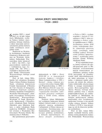 WSPOMNIENIE ADAM JERZY MI¸OB¢DZKI 1924 - 2003 6 grudnia 2003 r. zmar∏ prof. zw. dr hab. Adam Jerzy Mi∏ob´dzki, wybitny badacz kultury staropolskiej, którego dzie∏om, a tak˝e nauczaniu uniwersyteckiemu polska historia sztuki zawdzi´cza szczególnie wiele. Studiowa∏ na Wydziale Architektury Akademii Górniczej w Krakowie, póêniej na Wydziale Architektury Politechniki Warszawskiej, który ukoƒczy∏ w 1949 r. Od 1955 r. by∏ pracownikiem naukowym i wyk∏adowcà tego wydzia∏u PW. Od 1974 r. wyk∏ada∏ w Instytucie Historii Sztuki Uniwersytetu Warszawskiego, którego zosta∏ profesorem. Prof. dr hab. Adam Mi∏ob´dzki by∏ cz∏onkiem Komitetu Nauk o Sztuce Polskiej Akademii Nauk, cz∏onkiem honorowym Comité International d’Histoire de l’Art i Society of Antiquaries, cz∏onkiem krajowym czynnym Polskiej Akademii Umiej´tnoÊci, Wydzia∏u Filozoficznego, cz∏onkiem zwyczajnym Towarzystwa Naukowego Warszawskiego, Wydzia∏u II Nauk Historycznych, Spo∏ecznych i Filozoficznych, cz∏onkiem Rady Ochrony Zabytków przy Ministrze Kultury, a tak˝e cz∏onkiem Rady naukowej KOBiDZ. Zwiàzany by∏ równie˝ z Wydzia∏em Historycznym Wy˝szej Szko∏y Humanistycznej w Pu∏tusku. By∏ promotorem przewodów 236 w Polsce z 1962 r., wydany wspólnie z Jerzym Z. ¸oziƒskim w 1967 r. Atlas architektury w Polsce, a tak˝e opublikowana w 1980 r. Architektura polska XVII wieku, wiekopomne dzie∏o, stanowiàce pierwszà cz´Êç czwartego tomu wielkiej syntezy Dziejów sztuki polskiej opracowywanej i wydawanej przez Instytut Sztuki Polskiej Akademii Nauk. W tej wspania∏ej ksià˝ce, której wartoÊci nie sposób przeceniç, prof. A. MiFot. M. Krysiak. ∏ob´dzki wszechstronnie ukaza∏ ró˝norodnoÊç architektury polskiej wieku doktorskich: w 1989 r. Dwór XVII, poczynajàc od przedstaXVII-XX w. w koncepcjach wienia dzie∏ najwybitniejszych, twórców, badaczy i krytyków, ale tak˝e pokazujàc te orygiMarty LeÊniakowskiej; w 1991 r. nalne, o mniejszej randze artysKaruzel – forma i funkcja urotycznej, ale istotne dla zobrazoczystoÊci dworskiej, Joanny Hıbwania ca∏okszta∏tu artystycznego ner-Wojciechowskiej; w 2002 r. Polski w zasi´gu terytorialnym Brat Mateusz Osiecki i jego mogranic Rzeczypospolitej tego delowy projekt nowego wystroju okresu. Procesy rozwoju archi-wyposa˝enia koÊcio∏ów refortektury polskiej wraz z innymi mackich prowincji wielkopolpodporzàdkowanymi jej sztukaskiej w XVIII wieku, Adama mi odniós∏ A. Mi∏ob´dzki do B∏achuta. dziejów politycznych, kultury Profesor Adam Mi∏ob´dzki materialnej oraz ÊwiadomoÊci by∏ wybitnym badaczem historii spo∏ecznej, tworzàc w ten sposób kultury i historii sztuki, a w szczewielkà syntez´ dziejów kultury gólnoÊci znawcà architektury w Polsce w XVII w. oraz prezeni urbanistyki w Polsce okresu notujàc na ich tle kluczowe problewo˝ytnego. Zawdzi´czamy mu my architektury. fundamentalne opracowania doProf. dr hab. Adam Mi∏otyczàce polskiej architektury, b´dzki wyk∏ada∏ histori´ archiz których najwa˝niejsze to: tektury wielu pokoleniom studenZarys dziejów architektury tów Politechniki Warszawskiej autor nieocenionych dla historii architektury publikacji, zawsze elegancki, nieskazitelnie szarmancki Pan, o którym opowiadamy – a nie jest to powszechne – naszym dzieciom i wnukom. i Uniwersytetu Warszawskiego. Forma jego wyk∏adów, sposób egzaminowania, a tak˝e stosunek do studentów w sytuacjach mniej oficjalnych, pozwoli∏ tym, których uczy∏ – a jestem jednà z jego uczenic – zachowaç w pami´ci prof. Mi∏ob´dzkiego jako naszego nauczyciela, wspania∏ego wyk∏adowc´, erudyt´, wymagajàcego egzaminatora, ale tak˝e przyjacielskiego, pe∏nego humoru kompana studenckich spotkaƒ i zabaw. Odszed∏ od nas wielki uczony, wspania∏y Profesor, Maria So∏tysiak Profesor Adam Mi∏ob´dzki z czasów pracy na Wydziale Architektury Politechniki Warszawskiej. Fot. archiwum. POSTHUMOUS REMINISCENCES ABOUT PROF. ADAM JERZY MI¸OB¢DZKI P rof. Dr. hab. Adam Jerzy Mi∏ob´dzki, an outstanding scholar dealing with Old Polish culture, an historian of art and architecture, a member of the Committee of Sciences of Art at the Polish Academy of Sciences, an honorary member of Comité International d’Histoire de l’Art and the Society of Antiquaries, and an active member of the Polish Academy of Letters and Sciences and many other scientific societies, died on 6 December 2003. Prof. A. J. Mi∏ob´dzki was a great expert on Polish and European architecture, whose publications served several generations of researchers, and a preeminent academic teacher at Warsaw University and Polytechnic. 237
