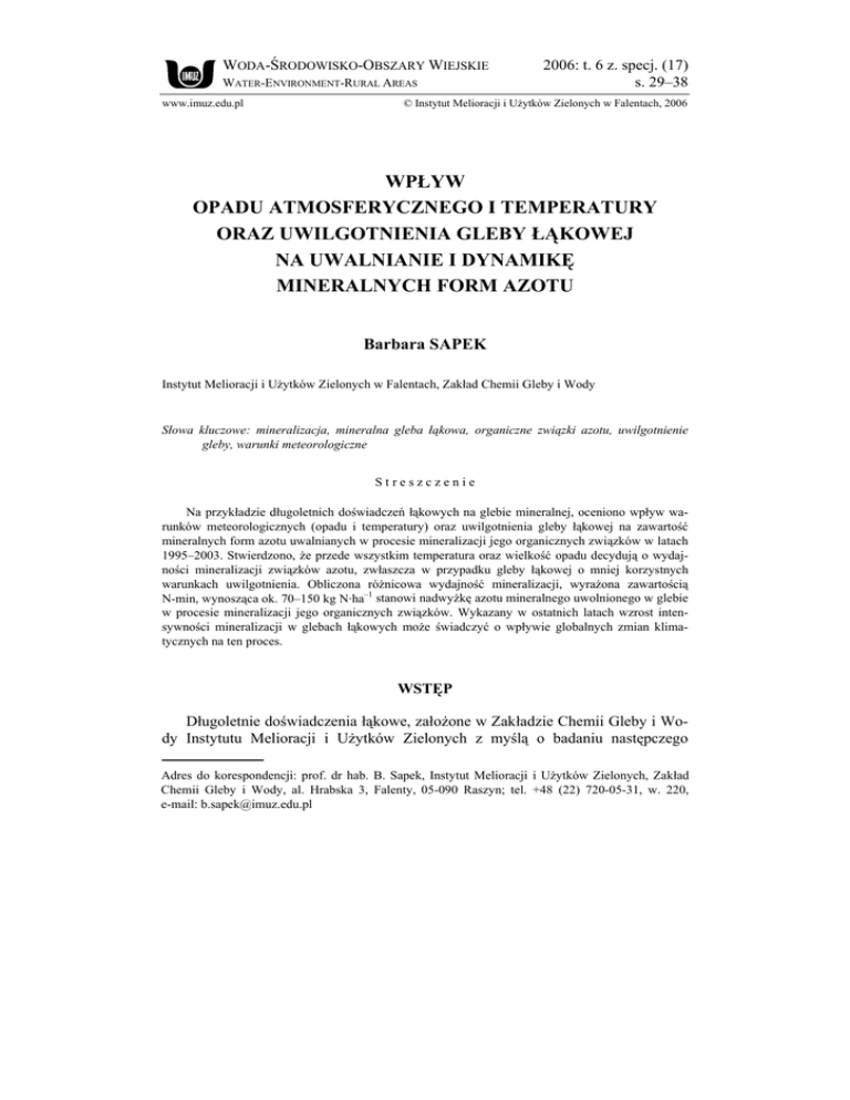 WODA-ŚRODOWISKO-OBSZARY WIEJSKIE WATER-ENVIRONMENT-RURAL AREAS www.imuz.edu.pl 2006: t. 6 z. specj. (17) s. 29–38 © Instytut Melioracji i Użytków Zielonych w Falentach, 2006 WPŁYW OPADU ATMOSFERYCZNEGO I TEMPERATURY ORAZ UWILGOTNIENIA GLEBY ŁĄKOWEJ NA UWALNIANIE I DYNAMIKĘ MINERALNYCH FORM AZOTU Barbara SAPEK Instytut Melioracji i Użytków Zielonych w Falentach, Zakład Chemii Gleby i Wody Słowa kluczowe: mineralizacja, mineralna gleba łąkowa, organiczne związki azotu, uwilgotnienie gleby, warunki meteorologiczne Streszczenie Na przykładzie długoletnich doświadczeń łąkowych na glebie mineralnej, oceniono wpływ warunków meteorologicznych (opadu i temperatury) oraz uwilgotnienia gleby łąkowej na zawartość mineralnych form azotu uwalnianych w procesie mineralizacji jego organicznych związków w latach 1995–2003. Stwierdzono, że przede wszystkim temperatura oraz wielkość opadu decydują o wydajności mineralizacji związków azotu, zwłaszcza w przypadku gleby łąkowej o mniej korzystnych warunkach uwilgotnienia. Obliczona różnicowa wydajność mineralizacji, wyrażona zawartością N-min, wynosząca ok. 70–150 kg N·ha–1 stanowi nadwyżkę azotu mineralnego uwolnionego w glebie w procesie mineralizacji jego organicznych związków. Wykazany w ostatnich latach wzrost intensywności mineralizacji w glebach łąkowych może świadczyć o wpływie globalnych zmian klimatycznych na ten proces. WSTĘP Długoletnie doświadczenia łąkowe, założone w Zakładzie Chemii Gleby i Wody Instytutu Melioracji i Użytków Zielonych z myślą o badaniu następczego Adres do korespondencji: prof. dr hab. B. Sapek, Instytut Melioracji i Użytków Zielonych, Zakład Chemii Gleby i Wody, al. Hrabska 3, Falenty, 05-090 Raszyn; tel. +48 (22) 720-05-31, w. 220, e-mail: [email protected] 30 Woda-Środowisko-Obszary Wiejskie t. 6 z. specj. (17) wpływu wapnowania łąki trwałej na tle zróżnicowanej dawki i postaci nawozu azotowego wykorzystano do badań procesu mineralizacji organicznych związków azotu w mineralnej glebie łąkowej [SAPEK, ESTAVILLO, CORRE, 2000; SAPEK, SAPEK, BARSZCZEWSKI, 2002, SAPEK, KALIŃSKA, 2004]. Wyniki badań wpływu dawki azotu i postaci nawozu oraz odczynu (jako efektu następczego działania wapna), a także terminu pobrania próbek na wydajność mineralizacji organicznych związków azotu omówiono w pracy SAPEK i KALIŃSKIEJ [2004] Celem niniejszej pracy jest ocena wpływu warunków meteorologicznych (opadu i temperatury) panujących w okresie wegetacyjnym oraz uwilgotnienia gleby łąkowej na zawartość mineralnych form azotu w glebie, uwalnianych w niej w procesie mineralizacji jego organicznych związków w ciągu dziewięciu lat badań. MATERIAŁ I METODY BADAŃ Wydajność mineralizacji organicznych związków azotu w glebie badano na przykładzie dwóch długoletnich doświadczeń łąkowych zlokalizowanych w miejscowościach Janki (J) i Laszczki (L) [SAPEK, 2006]. Badania wykonywano na wybranych obiektach nawozowych doświadczeń – niewapnowanych (Ca0) i wapnowanych podwojoną dawką wapna (Ca2), nawożonych 240 kg N·ha–1 w postaci saletry amonowej (AN), a począwszy od 1992 r. równolegle (na połowie poletka) w postaci saletry wapniowej (CN). Szczegółowy opis doświadczeń zawierają wcześniejsze prace [SAPEK, 1993; SAPEK, BARSZCZEWSKI, 2000]. W badaniach mineralizacji stosowano metodę inkubacji in situ, która umożliwia badanie tego procesu w warunkach zbliżonych do naturalnych. Obszerną literaturę zagraniczną dotyczącą wymienionej metody zacytowano w pracy SAPEK i KALIŃSKIEJ [2004]. Opis metody inkubacji in situ, stosowanej w niniejszych badaniach, zawierają prace SAPEK [1999] oraz SAPKA, SAPEK i BARSZCZEWSKIEGO [2002]. Metodą tą badano mineralizację w 0–10 cm warstwie gleby. Jednocześnie, z warstwy gleby o tej samej miąższości, pobierano próbki bezpośrednio spod roślinności, obok zainstalowanych rurek do inkubacji. Obydwa rodzaje próbek pobierano zawsze przed wysiewem nawozów: − wczesną wiosną przed ruszeniem wegetacji – termin I (próbki inkubowane pozostawiano w glebie w okresie od ostatniego pokosu do ruszenia wegetacji), − po kolejnych odrostach runi – terminy II–IV (próbki inkubowane pozostawały w glebie w czasie kolejnych odrostów runi). Zawartość mineralnych form azotu – amonowej (N-NH4) i azotanowej (N-NO3) w próbkach gleby po inkubacji in situ (R) oraz w próbkach pobranych spod roślinności (T) oznaczano w wyciągu z gleby 1% K2SO4, metodą spektrofotometryczną za pomocą automatycznego analizatora przepływowego SKALAR. Z sumy N-NH4 i N-NO3 obliczano całkowitą zawartość azotu mineralnego (N-min). Ponadto obliczano tzw. różnicową wydajność mineralizacji z różnicy B. Sapek: Wpływ opadu atmosferycznego i temperatury oraz uwilgotnienia… 31 zawartości azotu oznaczonej w próbce po inkubacji i w próbce spod roślinności (R – T) [SAPEK, SAPEK, BARSZCZEWSKI, 2002; SAPEK, KALIŃSKA, 2004]. Na pojedynczy wynik składały się oznaczenia w 16 próbkach gleby (4 próbki na każdym obiekcie nawozowym w 4 powtórzeniach). Oznaczenia wykonywano w świeżej masie gleby. Wyniki podano w przeliczeniu na kg N·ha–1. Wpływ badanych czynników, tj. opadów i temperatury, a także uwilgotnienia gleby w okresie wegetacyjnym na wydajność mineralizacji i uwalnianie się badanych form azotu mineralnego w kolejnych latach od 1995 do 2003 oceniono na podstawie ich średnich zawartości z obiektów nawozowych doświadczenia, na których wykonywano badania mineralizacji, wymienionych na wstępie rozdziału, z wszystkich czterech terminów pobierania próbek. Przebieg zmian oraz współzależność zawartości badanych form azotu w glebie i wielkości opadu, temperatury i uwilgotnienia gleby oceniono na podstawie współczynników korelacji liniowej Pearsona. WYNIKI I DYSKUSJA Jak wykazano we wcześniejszej pracy [SAPEK, KALIŃSKA, 2004], w glebie doświadczenia J, ub