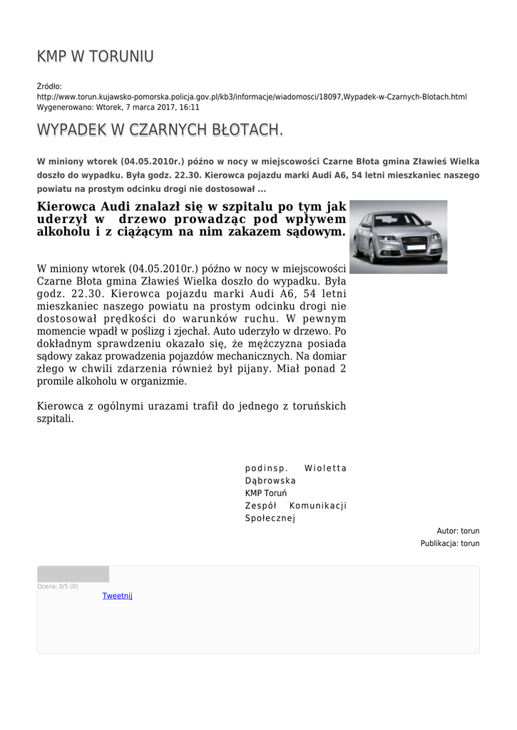 KMP W TORUNIU Źródło: http://www.torun.kujawsko-pomorska.policja.gov.pl/kb3/informacje/wiadomosci/18097,Wypadek-w-Czarnych-Blotach.html Wygenerowano: Wtorek, 7 marca 2017, 16:11 WYPADEK W CZARNYCH BŁOTACH. W miniony wtorek (04.05.2010r.) późno w nocy w miejscowości Czarne Błota gmina Zławieś Wielka doszło do wypadku. Była godz. 22.30. Kierowca pojazdu marki Audi A6, 54 letni mieszkaniec naszego powiatu na prostym odcinku drogi nie dostosował ... Kierowca Audi znalazł się w szpitalu po tym jak uderzył w drzewo prowadząc pod wpływem alkoholu i z ciążącym na nim zakazem sądowym. W miniony wtorek (04.05.2010r.) późno w nocy w miejscowości Czarne Błota gmina Zławieś Wielka doszło do wypadku. Była godz. 22.30. Kierowca pojazdu marki Audi A6, 54 letni mieszkaniec naszego powiatu na prostym odcinku drogi nie dostosował prędkości do warunków ruchu. W pewnym momencie wpadł w poślizg i zjechał. Auto uderzyło w drzewo. Po dokładnym sprawdzeniu okazało się, że mężczyzna posiada sądowy zakaz prowadzenia pojazdów mechanicznych. Na domiar złego w chwili zdarzenia również był pijany. Miał ponad 2 promile alkoholu w organizmie. Kierowca z ogólnymi urazami trafił do jednego z toruńskich szpitali. podinsp. Wioletta Dąbrowska KMP Toruń Zespół Komunikacji Społecznej Autor: torun Publikacja: torun Ocena: 0/5 (0) Tweetnij