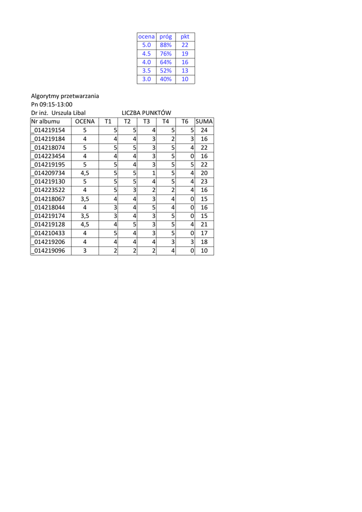 ocena 5.0 4.5 4.0 3.5 3.0 próg 88% 76% 64% 52% 40% Algorytmy przetwarzania Pn 09:15-13:00 Dr inż. Urszula Libal LICZBA PUNKTÓW Nr albumu OCENA T1 T2 T3 T4 _014219154 5 5 5 4 5 _014219184 4 4 4 3 2 _014218074 5 5 5 3 5 _014223454 4 4 4 3 5 _014219195 5 5 4 3 5 _014209734 4,5 5 5 1 5 _014219130 5 5 5 4 5 _014223522 4 5 3 2 2 _014218067 3,5 4 4 3 4 _014218044 4 3 4 5 4 _014219174 3,5 3 4 3 5 _014219128 4,5 4 5 3 5 _014210433 4 5 4 3 5 _014219206 4 4 4 4 3 _014219096 3 2 2 2 4 pkt 22 19 16 13 10 T6 SUMA 5 24 3 16 4 22 0 16 5 22 4 20 4 23 4 16 0 15 0 16 0 15 4 21 0 17 3 18 0 10