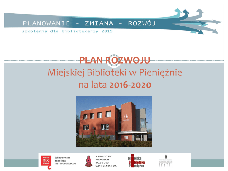 PLAN ROZWOJU Miejskiej Biblioteki w Pieniężnie na lata 2016-2020 Plan Rozwoju jest dokumentem strategicznym, który pełni także rolę narzędzia długofalowego zarządzania, monitoringu i ewaluacji. PLAN ROZWOJU MIEJSKIEJ BIBLIOTEKI W PIENIĘŻNIE NA LATA 2016-2020 POWSTAŁ W RAMACH PROJEKTU „PLANOWANIE - ZMIANA - ROZWÓJ” „Plan Rozwoju Miejskiej Biblioteki w Pieniężnie na lata 2016-2020” to dokument opisujący planowane w tej instytucji zmiany, odpowiadające na lokalne potrzeby i wyzwania oraz związane z globalnymi trendami technologicznymi i socjologicznymi. Plan ten nie jest zapisem wszystkich działań, które Biblioteka prowadzi i prowadzić będzie w ramach swojej działalności statutowej (patrz: „Ustawa o bibliotekach” z dnia 27 czerwca 1997 r., Dz.U. 1997 nr 85 poz. 539). Plany roczne sporządzane przez Bibliotekę są uzupełnieniem Planu Rozwoju. Projekt dofinansowany ze środków Instytutu Książki z Narodowego Programu Rozwoju Czytelnictwa Realizatorem projektu była Wojewódzka Biblioteka Publiczna w Olsztynie Statutowe zadania Biblioteki „Podstawowym zadaniem Biblioteki jest gromadzenie, opracowywanie i udostępnianie zbiorów bibliotecznych oraz stymulowanie, rozwijanie i zaspakajanie zróżnicowanych potrzeb czytelniczych, oświatowych, kulturalnych i informacyjnych mieszkańców miasta i gminy Pieniężno” Projekt dofinansowany ze środków Instytutu Książki z Narodowego Programu Rozwoju Czytelnictwa Realizatorem projektu była Wojewódzka Biblioteka Publiczna w Olsztynie Misja i Wizja Biblioteki MISJA BIBLIOTEKI Miejsce otwarte i przyjazne dla wszelkiej twórczej aktywności mieszkańców, inspirujące do działania, miejsce w którym rozwija się pasje i czerpie z bogactwa tradycji lokalnej. WIZJA BIBLIOTEKI Biblioteka ma unikatowy towar. Jesteśmy przewodnikiem po świecie wiedzy i informacji. Wypożyczanie książek to już od dawna jedynie część naszych działań. W rezultacie biblioteka jest dla mieszkańców nowoczesną, przyjazną i otwartą dla każdego przestrzenią spędzania wolnego czasu, miejscem, gdzie ludzie mają dostęp do informacji, kultury, gdzie działają wspólnie i czują się bardziej związani ze swoją miejscowością. Proces powstawania „Planu Rozwoju Miejskiej Biblioteki w Pieniężnie na lata 2016-2020” Proces powstawania „Planu Rozwoju Miejskiej Biblioteki w Pieniężnie na lata 2016-2020” był wspierany przez cykl szkoleniowy pod nazwą „Planowanie – zmiana – rozwój”, realizowany od marca do września 2015 r. przez Wojewódzką Bibliotekę Publiczną w Olsztynie. Szkolenia dofinansowano ze środków Instytutu Książki. Plan powstał metodą partycypacyjną, dzięki zaangażowaniu kierownictwa i zespołu pracowników. Przeprowadzono 4 spotkania pracowników poświęcone analizie zasobów i potrzeb biblioteki oraz jej otoczenia, a także 2 spotkania z użytkownikami biblioteki. Ostateczny kształt dokumentu wypracował zespół w składzie: Kierownik biblioteki – Lubomira Wacławska Pracownicy – Renata Wielguszewska, Zofia Puhowska, Iwona Kaźmierczak. Kluczowe kierunki rozwoju biblioteki na lata 2016-2020 I. Rodzice i dzieci II. Uczestnictwo w kulturze III. Usługi biblioteczne Kluczowe cele strategiczne rozwoju biblioteki na lata 2016-2020 Cel strategiczny 1: Rozwój kompetencji małego dziecka i rodziców Cel strategiczny 2: Zwiększenie kompetencji kulturalnych mieszkańców gminy Pieniężno Cel strategiczny 3: Zwiększenie funkcjonalności biblioteki i atrakcyjności usług Kluczowe cele strategiczne rozwoju biblioteki na lata 2016-2020 Cel strategiczny 1: Rozwój kompetencji małego dziecka i rodziców Cel operacyjny 1.1: Kontynuacja i doskonalenie obecnej oferty dla małych dzieci oraz wypracowanie nowej Cel operacyjny 1.2: Powiększenie i poprawa funkcjonalności „Kącika Malucha” Cel operacyjny 1.3: Rozwój kompetencji rodziców Podsumowując cel strategiczny 1 Uaktywnimy czytelniczo rodziców z małymi dziećmi i wspólnie z nimi wypracujemy nawyk czytania od najmłodszych lat. Kluczowe cele strategiczne rozwoju biblioteki na lata 2016-2020 Cel strategiczny 2: Zwiększenie kompetencji kulturalnych mieszkańców gminy Pieniężno Cel operacyjny 2.1: Podniesienie poziomu i powiększenie oferty edukacyjnej i kulturalnej dla osób dorosłych Cel operacyjny 2.2: Ułatwienie mieszkańcom uczestnictwa w wydarzeniach kulturalnych poza miejscem zamieszkania Cel operacyjny 2.3: Wspieranie pasji i zainteresowań mieszkańców Cel operacyjny 2.4: Rozszerzenie oferty kulturalnej dla osób niepełnosprawnych Cel operacyjny 2.5: Rozwój kompetencji cyfrowych pomocnych w uczestnictwie w kulturze Podsumowując cel strategiczny 2 Umożliwimy rozwijanie pasji, zainteresowań oraz uczestnictwo w wydarzeniach poza miejscem zamieszkania. Stworzymy nowe przyjazne miejsce do spędzania wolnego czasu i spotkań z innymi ludźmi. Kluczowe cele strategiczne rozwoju biblioteki na lata 2016-2020 Cel strategiczny 3: Zwiększenie funkcjonalności biblioteki i atrakcyjności usług Cel operacyjny 3.1: Poprawa infrastruktury i otoczenia biblioteki Cel operacyjny 3.2: Stworzenie Cyfrowego Archiwum Tradycji Lokalnej Cel operacyjny 3.3: Efektywna polityka gromadzenia i uzupełniania zbiorów Podsumowując cel strategiczny 3 Podniesiemy poziom usług bibliotecznych, uatrakcyjnimy infrastrukturę i otoczenie biblioteki. Zakładamy, że powyższy Plan Rozwoju Biblioteki pozwoli nam być miejscem przyjaznym dla wszystkich i otwartym na wszelką twórczą aktywność mieszkańców gminy Pieniężno. Dziękujemy i zapraszamy do współpracy z naszą biblioteką! Projekt dofinansowany ze środków Instytutu Książki z Narodowego Programu Rozwoju Czytelnictwa Realizatorem projektu była Wojewódzka Biblioteka Publiczna w Olsztynie