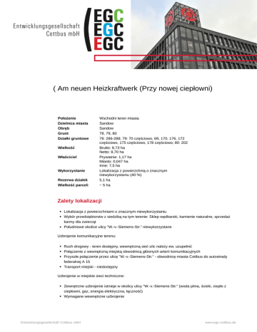 ( Am neuen Heizkraftwerk (Przy nowej ciepłowni) Położenie Dzielnica miasta Obręb Grunt Działki gruntowe Wielkość Właściciel Wykorzystanie Rezerwa działek Wielkość parceli Wschodni teren miasta Sandow Sandow 78, 79, 80 78: 286-288; 79: 70 częściowo, 69, 170, 176, 172 częściowo, 175 częściowo, 178 częściowo; 80: 202 Brutto: 8,73 ha Netto: 8,70 ha Prywatnie: 1,17 ha Miasto: 0,047 ha Inne: 7,5 ha Lokalizacja z powierzchnią o znacznym niewykorzystaniu (40 %) 5,1 ha ~ 5 ha Zalety lokalizacji • Lokalizacja z powierzchniami o znacznym niewykorzystaniu • Wybór przedsiębiorstw z siedzibą na tym terenie: Sklep wędkarski, kamienie naturalne, sprzedaż karmy dla zwierząt • Południowe okolice ulicy "W.-v.-Siemens-Str." niewykorzystane Uzbrojenie komunikacyjne terenu: • Ruch drogowy - teren dostępny, wewnętrzną sieć ulic należy ew. uzupełnić • Połączenie z wewnętrzną miejską obwodnicą głównych arterii komunikacyjnych • Przyszłe połączenie przez ulicę "W.-v.-Siemens-Str." - obwodnicę miasta Cottbus do autostrady • federalnej A 15 Transport miejski - niedostępny Uzbrojenie w miejskie sieci techniczne: • Zewnętrzne uzbrojenie istnieje w okolicy ulicy "W.-v.-Siemens-Str." (woda pitna, ścieki, ciepło z ciepłowni, gaz, energia elektryczna, łączność) • Wymagane wewnętrzne uzbrojenie Entwicklungsgesellschaft Cottbus mbH www.egc-cottbus.de Środki promocji: • Nie Cena działki: • 30 €/m² Zarejestrowana wartość gleby/gruntu: • Zachodnia powierzchnia częściowa 25 €/m², wschodnia powierzchnia częściowa – (2011) Przydatność terenu: • Gospodarka / technologia energetyczna, obróbka i przetwórstwo metali / mechatronika, gospodarka żywnościowa, technika transportu szynowego Sytuacja prawna planowania Plan użytkowania powierzchni: • Powierzchnia budowlana gospodarcza Prawo planowania: • Plan zabudowy Cele rozwoju miasta • Na podstawie koncepcji rozwoju powierzchni gospodarczych (GEK stan: 9/2007) • Kategoria docelowa: Obszar rewitalizacji • Teren korzysta z priorytetu rozwoju EGC Entwicklungsgesellschaft Cottbus mbH Am Turm 14, D-03046 Cottbus www.egc-cottbus.de Telefon: +49 (0)355 729913-0 Fax: +49 (0)355 729913-15 [email protected]
