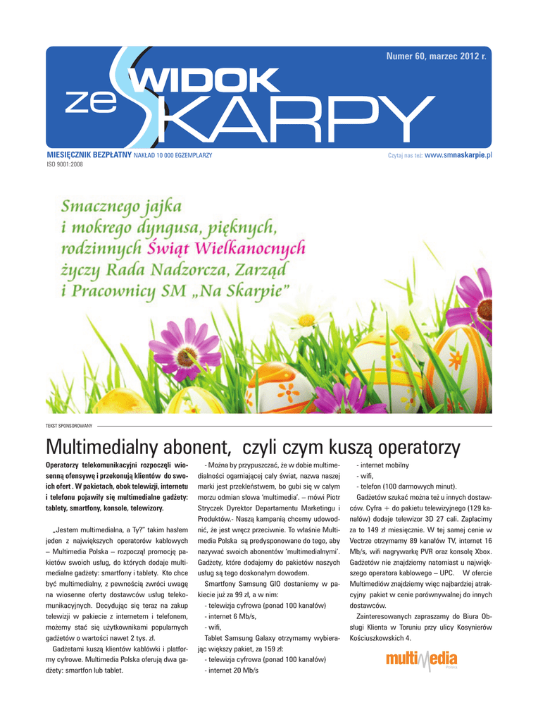 Magazyn mieszkańców SM „Na Skarpie” Numer 60, marzec 2012 r. MIESIĘCZNIK BEZPŁATNY NAKŁAD 10 000 EGZEMPLARZY Czytaj nas też: www.smnaskarpie.pl ISO 9001:2008 TEKST SPONSOROWANY Multimedialny abonent, czyli czym kuszą operatorzy Operatorzy telekomunikacyjni rozpoczęli wiosenną ofensywę i przekonują klientów do swoich ofert . W pakietach, obok telewizji, internetu i telefonu pojawiły się multimedialne gadżety: tablety, smartfony, konsole, telewizory. „Jestem multimedialna, a Ty?” takim hasłem jeden z największych operatorów kablowych – Multimedia Polska – rozpoczął promocję pakietów swoich usług, do których dodaje multimedialne gadżety: smartfony i tablety. Kto chce być multimedialny, z pewnością zwróci uwagę na wiosenne oferty dostawców usług telekomunikacyjnych. Decydując się teraz na zakup telewizji w pakiecie z internetem i telefonem, możemy stać się użytkownikami popularnych gadżetów o wartości nawet 2 tys. zł. Gadżetami kuszą klientów kablówki i platformy cyfrowe. Multimedia Polska oferują dwa gadżety: smartfon lub tablet. - Można by przypuszczać, że w dobie multimedialności ogarniającej cały świat, nazwa naszej marki jest przekleństwem, bo gubi się w całym morzu odmian słowa ‘multimedia’. – mówi Piotr Stryczek Dyrektor Departamentu Marketingu i Produktów.- Naszą kampanią chcemy udowodnić, że jest wręcz przeciwnie. To właśnie Multimedia Polska są predysponowane do tego, aby nazywać swoich abonentów ‘multimedialnymi’. Gadżety, które dodajemy do pakietów naszych usług są tego doskonałym dowodem. Smartfony Samsung GIO dostaniemy w pakiecie już za 99 zł, a w nim: - telewizja cyfrowa (ponad 100 kanałów) - internet 6 Mb/s, - wifi, Tablet Samsung Galaxy otrzymamy wybierając większy pakiet, za 159 zł: - telewizja cyfrowa (ponad 100 kanałów) - internet 20 Mb/s - internet mobilny - wifi, - telefon (100 darmowych minut). Gadżetów szukać można też u innych dostawców. Cyfra + do pakietu telewizyjnego (129 kanałów) dodaje telewizor 3D 27 cali. Zapłacimy za to 149 zł miesięcznie. W tej samej cenie w Vectrze otrzymamy 89 kanałów TV, internet 16 Mb/s, wifi nagrywarkę PVR oraz konsolę Xbox. Gadżetów nie znajdziemy natomiast u największego operatora kablowego – UPC. W ofercie Multimediów znajdziemy więc najbardziej atrakcyjny pakiet w cenie porównywalnej do innych dostawców. Zainteresowanych zapraszamy do Biura Obsługi Klienta w Toruniu przy ulicy Kosynierów Kościuszkowskich 4.