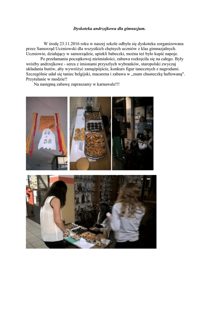 Dyskoteka andrzejkowa dla gimnazjum. W środę 23.11.2016 roku w naszej szkole odbyła się dyskoteka zorganizowana przez Samorząd Uczniowski dla wszystkich chętnych uczniów z klas gimnazjalnych. Uczniowie, działający w samorządzie, upiekli babeczki, można też było kupić napoje. Po przełamaniu początkowej nieśmiałości, zabawa rozkręciła się na całego. Były wróżby andrzejkowe - serca z imionami przyszłych wybranków, staropolski zwyczaj układania butów, aby wywróżyć zamążpójście, konkurs figur tanecznych z nagrodami. Szczególnie udał się taniec belgijski, macarena i zabawa w ,,mam chusteczkę haftowaną". Przytulanie w modzie!! Na następną zabawę zapraszamy w karnawale!!!