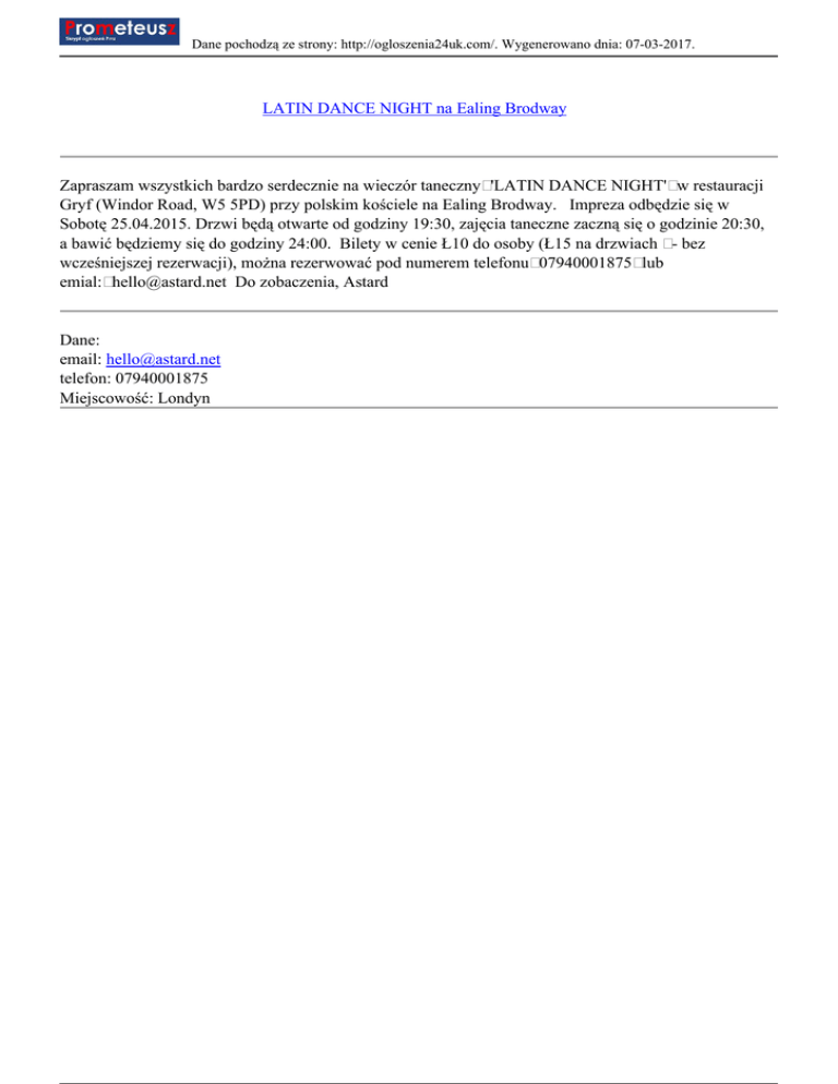 Dane pochodzą ze strony: http://ogloszenia24uk.com/. Wygenerowano dnia: 07-03-2017. LATIN DANCE NIGHT na Ealing Brodway Zapraszam wszystkich bardzo serdecznie na wieczór taneczny 'LATIN DANCE NIGHT' w restauracji Gryf (Windor Road, W5 5PD) przy polskim kościele na Ealing Brodway. Impreza odbędzie się w Sobotę 25.04.2015. Drzwi będą otwarte od godziny 19:30, zajęcia taneczne zaczną się o godzinie 20:30, a bawić będziemy się do godziny 24:00. Bilety w cenie Ł10 do osoby (Ł15 na drzwiach - bez wcześniejszej rezerwacji), można rezerwować pod numerem telefonu 07940001875 lub emial: [email protected] Do zobaczenia, Astard Dane: email: [email protected] telefon: 07940001875 Miejscowość: Londyn