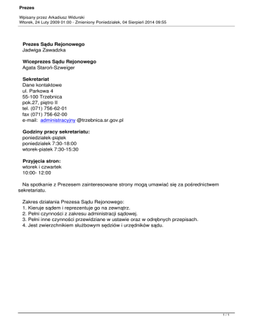 Prezes Wpisany przez Arkadiusz Widurski Wtorek, 24 Luty 2009 01:00 - Zmieniony Poniedziałek, 04 Sierpień 2014 09:55 Prezes Sądu Rejonowego Jadwiga Zawadzka Wiceprezes Sądu Rejonowego Agata Staroń-Szweiger Sekretariat Dane kontaktowe ul. Parkowa 4 55-100 Trzebnica pok.27, piętro II tel. (071) 756-62-01 fax (071) 756-62-00 e-mail: administracyjny @trzebnica.sr.gov.pl Godziny pracy sekretariatu: poniedziałek-piątek poniedziałek 7:30-18:00 wtorek-piatek 7:30-15:30 Przyjęcia stron: wtorek i czwartek 10:00- 12:00 Na spotkanie z Prezesem zainteresowane strony mogą umawiać się za pośrednictwem sekretariatu. Zakres działania Prezesa Sądu Rejonowego: 1. Kieruje sądem i reprezentuje go na zewnątrz. 2. Pełni czynności z zakresu administracji sądowej. 3. Pełni inne czynności przewidziane w ustawie oraz w odrębnych przepisach. 4. Jest zwierzchnikiem służbowym sędziów i urzędników sądu. 1/1