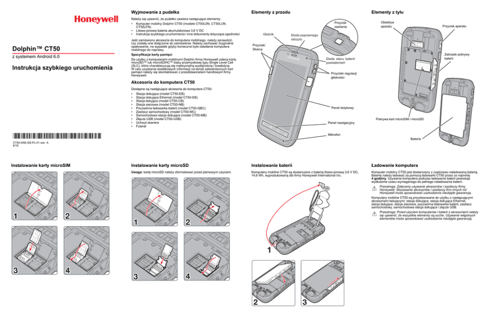 Wyjmowanie z pudełka Elementy z przodu Elementy z tyłu Należy się upewnić, że pudełko zawiera następujące elementy: • • • Dolphin™ CT50 z systemem Android 6.0 Instrukcja szybkiego uruchomienia Przycisk zasilania Komputer mobilny Dolphin CT50 (modele CT50L0N, CT50LUN, CT50LFN) Litowo-jonowa bateria akumulatorowa 3,6 V DC Instrukcja szybkiego uruchomienia i inne dokumenty dotyczące zgodności Jeśli zamówiono akcesoria do komputera mobilnego, należy sprawdzić, czy zostały one dołączone do zamówienia. Należy zachować oryginalne opakowanie, na wypadek gdyby konieczne było odesłanie komputera mobilnego do naprawy. Głośnik Obiektyw aparatu Przycisk aparatu Dioda poprawnego odczytu Przyciski Skanuj Zatrzask pokrywy baterii Specyfikacje karty pamięci Dioda stanu baterii/ powiadomień Do użytku z komputerami mobilnymi Dolphin firma Honeywell zaleca karty microSD™ lub microSDHC™ klasy przemysłowej typu Single Level Cell (SLC), które charakteryzują się maksymalną wydajnością i trwałością. W celu uzyskania dodatkowych informacji na temat zatwierdzonych kart pamięci należy się skontaktować z przedstawicielem handlowym firmy Honeywell. Przyciski regulacji głośności Akcesoria do komputera CT50 Dostępne są następujące akcesoria do komputera CT50: • • • • • • • • • • Stacja dokująca (model CT50-EB) Stacja dokująca Ethernet (model CT50-EB) Stacja ładująca (model CT50-CB) Stacja sieciowa (model CT50-NB) Poczwórna ładowarka baterii (model CT50-QBC) Zasilacz samochodowy (model CT50-MC) Samochodowa stacja dokująca (model CT50-MB) Złącze USB (model CT50-USB) Uchwyt skanera Futerał Panel dotykowy Pokrywa kart microSIM i microSD Panel nawigacyjny Mikrofon *CT50-AN6-QS-PL-01* Bateria CT50-AN6-QS-PL-01 wer. A 6/16 Instalowanie karty microSIM Instalowanie karty microSD Instalowanie baterii Ładowanie komputera Uwaga: kartę microSD należy sformatować przed pierwszym użyciem. Komputery mobilne CT50 są dostarczane z baterią litowo-jonową 3,6 V DC, 14,6 Wh, wyprodukowaną dla firmy Honeywell International Inc. Komputer mobilny CT50 jest dostarczany z częściowo naładowaną baterią. Baterię należy ładować za pomocą ładowarki CT50 przez co najmniej 4 godziny. Używanie komputera podczas ładowania baterii powoduje wydłużenie czasu wymaganego do pełnego naładowania baterii. Przestroga: Zalecamy używanie akcesoriów i zasilaczy firmy Honeywell. Stosowanie akcesoriów i zasilaczy firm innych niż Honeywell może spowodować uszkodzenia nieobjęte gwarancją. Komputery mobilne CT50 są przystosowane do użytku z następującymi akcesoriami ładującymi: stacja dokująca, stacja dokująca Ethernet, stacja ładująca, stacja sieciowa, poczwórna ładowarka baterii, zasilacz samochodowy, samochodowa stacja dokująca i złącze USB. Przestroga: Przed użyciem komputerów i baterii z akcesoriami należy się upewnić, że wszystkie elementy są suche. Używanie wilgotnych elementów może spowodować uszkodzenia nieobjęte gwarancją. 2 3 Włączanie i wyłączanie zasilania Dostosowywanie czasu usypiania ekranu Aby wyłączyć komputer: Aby dostosować czas nieaktywności, po którym ekran jest usypiany: • Nacisnąć i zwolnić przycisk zasilania. 1. Dotknąć kolejno opcji Wszystkie ustawienia Wyświetlacz > Uśpienie. Aby wyłączyć komputer: 1. Nacisnąć i przytrzymać przycisk zasilania, aż zostanie wyświetlone menu opcji. 2. Dotknąć opcji Wyłącz. 3. Gdy zostanie wyświetlony monit o wyłączenie urządzenia, dotknąć opcji OK. Informacje o ekranie głównym Przyciski > Ustawienia Panel powiadomień/ pasek stanu > Opis Funkcja Wstecz Umożliwia powrót do poprzedniego ekranu. Ostatnie aplikacje Umożliwia wyświetlanie i przełączanie się między ostatnio używanymi aplikacjami. Ekran główny Umożliwia powrót do ekranu głównego. Szukaj Umożliwia uruchomienie wyszukiwania na komputerze lub w Internecie. Głośność Umożliwia zwiększanie lub zmniejszanie głośności aktywnego głośnika. 2. Wybrać czas nieaktywności, po którym ekran przechodzi w tryb uśpienia. 3. Dotknąć ikony Ekran główny, aby powrócić do ekranu głównego. Pasek wyszukiwania Włączanie i wyłączanie trybu samolotowego 1. Przesunąć w dół od góry ekranu, aby otworzyć panel powiadomień. Uwaga: należy zawsze wyłączyć zasilanie komputera przed wyjęciem baterii. 2. Ponownie przesunąć w dół, aby uzyskać dostęp do szybkich ustawień. Tryb uśpienia (tryb wstrzymania) Uwaga: gdy jest włączony tryb samolotowy, na pasku stanu jest wyświetlana Tryb uśpienia powoduje automatyczne wyłączenie ekranu dotykowego oraz zablokowanie komputera w celu oszczędzania energii baterii, gdy komputer jest nieaktywny przez zaprogramowany czas. Przyciski nawigacyjne i funkcyjne 3. Dotknąć opcji Tryb samolotowy, aby włączyć ten tryb lub go wyłączyć. ikona . Ekran główny 1. Nacisnąć i zwolnić przycisk zasilania, aby wybudzić komputer. 2. Przeciągnąć ikonę w kierunku górnej krawędzi wyświetlacza, aby odblokować komputer. Uwaga: dostęp do dodatkowych funkcji jest uzależniony od używanej aplikacji. Pasek ulubionych Skanowanie kodu kreskowego za pomocą aplikacji Scan Demo Uwaga: aby odczyt przebiegał optymalnie, należy unikać skanowania kodu kreskowego pod kątem. 1. Dotknąć kolejno opcji Wszystkie aplikacje Demo > Demo > Scan . 2. Skierować komputer w stronę kodu kreskowego. 3. Dotknąć opcji Skanuj na ekranie dotykowym lub nacisnąć i przytrzymać przycisk Skanuj. Wyśrodkować wiązkę celowniczą na kodzie kreskowym. Aby zmienić domyślną funkcję przycisku Skanuj lub przycisków W lewo i W prawo, należy użyć opcji Mapowanie klawiszy w Ustawieniach. Dodatkowe informacje na temat ponownego mapowania funkcji przycisku można znaleźć w podręczniku użytkownika. Robienie zdjęcia lub nagrywanie wideo Ponowne uruchamianie komputera Wsparcie 1. Dotknąć ikony na ekranie głównym. Na kom