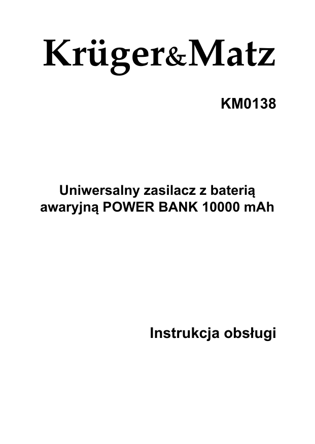 Krüger&Matz KM0138 Uniwersalny zasilacz z baterią awaryjną POWER BANK 10000 mAh Instrukcja obsługi Instrukcje bezpieczeństwa 1. Przed rozpoczęciem użytkowania urządzenia, należy przeczytać instrukcję użytkowania i postępować według wskazówek w niej zawartych. Producent nie odpowiada za szkody spowodowane użytkowaniem urządzenia niezgodnie z jego przeznaczeniem lub niewłaściwą jego obsługą. 2. Nie należy prowadzić jakichkolwiek prac konserwacyjnych podczas pracy urządzenia. 3. Urządzenie może być uruchamiane tylko wewnątrz pomieszczeń. Urządzenie nie jest przystosowane do pracy na zewnątrz pomieszczeń. 4. Należy chronić urządzenie przed wilgocią (również podczas przechowywania). 5. Niniejszy sprzęt nie jest przeznaczony do użytkowania przez osoby (w tym dzieci) o ograniczonej zdolności fizycznej, czuciowej lub psychicznej lub osoby nie mające doświadczenia lub znajomości sprzętu, chyba że odbywa się to pod nadzorem i zgodnie z instrukcją użytkowania sprzętu, przekazanej przez osoby odpowiadające za ich bezpieczeństwo. Należy zwracać uwagę na dzieci, aby nie bawiły się urządzeniem. 6. W przypadku uszkodzenia urządzenia, w celu uniknięcia zagrożenia, naprawę może przeprowadzić tylko specjalistyczny zakład naprawczy albo wykwalifikowana osoba. 7. Nie należy korzystać z urządzenia w pobliżu materiałów łatwopalnych. Opis Stylowy power bank o pojemności 10000 mAh - zasilacz z wbudowaną baterią awaryjną. W zestawie znajduje się kabel MicroUSB. Pasuje do wszelkich urządzeń typu telefony, samartfony, tablety, kamery, aparaty fotograficzne, odtwarzacze MP3/4. Zasilacz-bateria pozwala ładować urządzenia w sytuacji, gdy nie mamy dostępu do gniazda sieciowego lub samochodowego np. na wycieczce, w górach, na rybach. W domu ładujesz Bank do pełna, a kiedy Twoje urządzenie rozładuje się podłączasz go do portu USB za pomocą uniwersalnego kabla, który znajduje się w zestawie. Do urządzenia można podłączyć dowolny kabel USB ładującosynchronizujący co czyni baterię uniwersalną. Specyfikacja Pojemność: bateria o pojemności 10000 mAh Ilość cykli ładowania: ≤500 Zabezpieczenia: przed przeładowaniem, zwarciem, całkowitym rozładowaniem. USB 1: 5 V / 2100 mA USB 2: 5 V / 1000 mA Specyfikacja produktu może ulec zmianie bez powiadomienia. Zawartość zestawu - oryginalne opakowanie - power bank 10000mAh - kabel MicroUSB Poland Prawidłowe usuwanie produktu (zużyty sprzęt elektryczny i elektroniczny) Oznaczenie umieszczone na produkcie lub w odnoszących się do niego tekstach wskazuje, że po upływie okresu użytkowania nie należy usuwać z innymi odpadami pochodzącymi z gospodarstw domowych. Aby uniknąć szkodliwego wpływu na środowisko naturalne i zdrowie ludzi wskutek niekontrolowanego usuwania odpadów, prosimy o oddzielenie produktu od innego typu odpadów oraz odpowiedzialny recykling w celu promowania ponownego użycia zasobów materialnych jako stałej praktyki. W celu uzyskania informacji na temat miejsca i sposobu bezpiecznego dla środowiska recyklingu tego produktu użytkownicy w gospodarstwach domowych powinni skontaktować się z punktem sprzedaży detalicznej, w którym dokonali zakupu produktu, lub z organem władz lokalnych. Użytkownicy w firmach powinni skontaktować się ze swoim dostawcą i sprawdzić warunki umowy zakupu. Produktu nie należy usuwać razem z innymi odpadami komercyjnymi. Wyprodukowano w CHRL dla LECHPOL, Miętne ul. Garwolińska 1, 08-400 Garwolin.