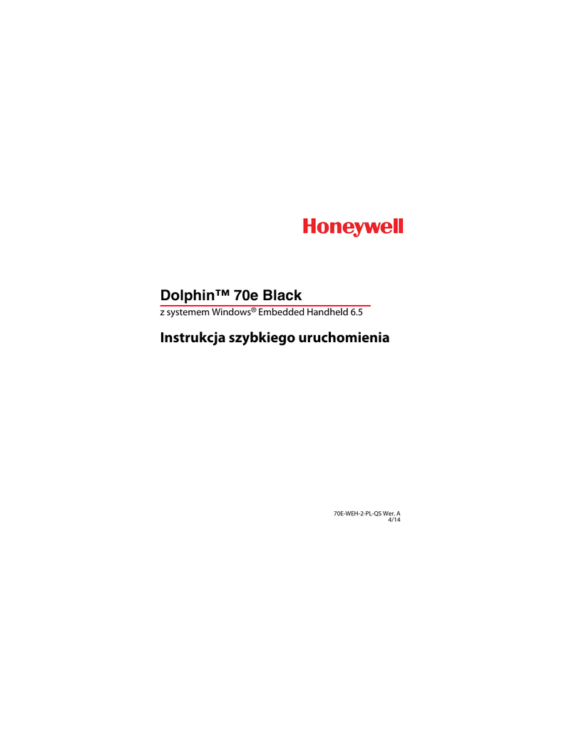 Dolphin™ 70e Black z systemem Windows® Embedded Handheld 6.5 Instrukcja szybkiego uruchomienia 70E-WEH-2-PL-QS Wer. A 4/14 Ważne informacje na temat niniejszej instrukcji Niniejsza Instrukcja szybkiego uruchomienia dotyczy modeli Dolphin 70e Black z blokadą pokrywy komory baterii. Jeżeli dany model nie ma blokady pokrywy komory baterii, patrz Instrukcja szybkiego uruchomienia 70E-WEH-QS dostępna do pobrania na stronie produktu Dolphin 70e Black pod adresem www.honeywellaidc.com. Blokada pokrywy komory baterii Wyjmowanie z pudełka Sprawdzić, czy w pudełku znajdują się następujące pozycje: • • • • • Komputer przenośny Dolphin 70e Black (terminal) Bateria litowo-jonowa 3,7 V do wielokrotnego ładowania Kabel USB do ładowania/komunikacji Zasilacz z przejściówkami zgodnymi z gniazdami w różnych regionach świata Instrukcja szybkiego uruchomienia i arkusz z informacjami na temat zgodności urządzenia z przepisami Jeśli zamówiono akcesoria do terminala, należy sprawdzić, czy zostały one dołączone do przesyłki. Należy zachować oryginalne opakowanie, na wypadek gdyby konieczne było odesłanie terminala Dolphin do naprawy. Zapoznanie z urządzeniem Dolphin 70e Black Przedni głośnik Dioda LED powiadomień sieci WAN Dioda LED powiadomień ogólnych Przycisk skanowania/ detektora obrazów po prawej stronie Mikrofon boczny* Pokrywa gniazda USB/ Port Micro USB Wyświetlacz dotykowy Przycisk Wstecz Przycisk Skanuj Przycisk Strona główna Przycisk Koniec Przycisk Wyślij Mikrofon przedni* Głośnik dolny * Ważne – Podczas rozmów telefonicznych za pośrednictwem terminala nie należy zakrywać dłonią mikrofonu bocznego. Funkcja eliminacji szumów działa prawidłowo podczas połączeń telefonicznych pod warunkiem, że mikrofon przedni ani boczny nie jest zasłonięty. Uwaga: Eliminacja szumów jest dostępna jedynie w modelach z funkcją WWAN. Obiektyw kamery kolorowej Gniazdo audio Okno modułu skanowania obrazów (apertura diody LED) Przycisk zasilania Lampa błyskowa/ lampa kamery Przycisk skanowania/detektora obrazów po lewej stronie Przycisk sterowania głośnością Zaczep baterii (na ilustracji nie przedstawiono baterii ani pokrywy komory baterii) Blokada pokrywy komory baterii Pokrywa komory baterii (ilustracja przedstawia model standardowy) Złącze we/wy Klapka unieruchamiająca kartę SIM Gniazdo karty SIM* Klapka unieruchamiająca kartę pamięci Gniazdo karty pamięci * Dostępne jedynie w modelach wyposażonych w opcję WWAN. Wkładanie baterii Modele terminali Dolphin 70e Black z blokadą pokrywy komory baterii są przeznaczone do użytku z bateriami o numerach katalogowych BAT-STANDARD-02 (litowo-jonowa 3,7 V; 6179 Wh) i BAT-EXTENDED-02 (litowo-jonowa 3,7 V; 12 358 Wh) produkowanymi dla firmy Honeywell International Inc. Dolphin 70e Black jest dostarczany z baterią zapakowaną oddzielnie od urządzenia. Aby włożyć baterię do urządzenia należy wykonać poniższe czynności. Przed umieszczeniem baterii w terminalu należy upewnić się, że wszystkie elementy są suche. Połączenie elektryczne wilgotnych elementów może spowodować uszkodzenia nieobjęte gwarancją. ! Uwaga: Ilustracja przedstawia baterię i pokrywę komory baterii w modelu standardowym. 2 1 4 3 5 6 ! Zaleca się stosowanie pakietów baterii litowo-jonowych marki Honeywell. Stosowanie baterii firmy innej niż Honeywell może spowodować uszkodzenie nieobjęte gwarancją. Po włożeniu baterii terminal należy podłączyć do jednej z ładowarek serii Dolphin 70e Black w celu naładowania baterii. Ładowanie urządzenia Dolphin 70e Black Terminale Dolphin są dostarczane z rozładowaną baterią. Baterię należy ładować za pomocą ładowarki Dolphin przez co najmniej 4 godziny w przypadku baterii standardowej i przez 6 godzin w przypadku baterii o zwiększonej pojemności. Jeśli do ładowania z portu USB 500 mA urządzenia głównego używany jest kabel 70e-USB do ładowania/komunikacji, baterię standardową należy ładować przez co najmniej 6 godzin, a baterię o zwiększonej pojemności przez 8 godzin. Uwaga: Jeśli terminal będzie używany podczas ładowania baterii, czas wymagany do pełnego naładowania baterii ulegnie znacznemu wydłużeniu. ! Zaleca się stosowanie urządzeń peryferyjnych, kabli zasilających i adapterów zasilania firmy Honeywell. Stosowanie urządzeń peryferyjnych, kabli zasilających i zasilaczy firm innych niż Honeywell może spowodować uszkodzenie nieobjęte gwarancją. Terminale Dolphin 70e Black są przeznaczone do użycia z następującymi urządzeniami ładującymi i przewodami: 70e-HB, 70e-EHB, 70e-CB, 70e-NB, 70e-MB, 70e-MC oraz 70e-USB ADAPTERKIT. ! Przed podłączeniem terminala do urządzeń peryferyjnych należy się upewnić, że wszystkie elementy są suche. Połączenie elektryczne wilgotnych elementów może spowodować uszkodzenia nieobjęte gwarancją. Stacja dokująca (model 70e-HB) Ładowarka 70e-HB jest przeznaczona do użytku z terminalami Dolphin 70e Black i bateriami o numerach katalogowych BAT-STANDARD-02 (litowo-jonowa 3,7 V; 6,179 Wh) oraz BAT-EXTENDED-02 (litowo-jonowa 3,7 V; 12,358 Wh) wyprodukowanymi dla firmy Honeywell International Inc. Z urządzeniem należy używać wyłącznie zasilaczy z atestem UL, zatwierdzonych przez firmę Honeywell o znamionowym napięciu wyjściowym 12 VDC i znamionowym prądzie na wyjściu 3 A. Elementy stacji dokującej Dok na baterię zapasową Port USB 2 Dioda LED COMM Dioda dokowania Gniazdo zasilania DC Dioda baterii pomocniczej Zasilacz Kabel zasilania sieciowego Kabel zasilania Wskaźniki LED stacji dokującej Dioda baterii pomocniczej Pomarańczowa Bateria pomocnicza jest ładowana. Zielona Zakończyło się ładowanie baterii pomocniczej i jest gotowa do użycia. Dioda dokowania Niebieska Terminal jest poprawnie osadzony w stacji dokującej. Dioda COMM Zielona Nawiązano komunikację USB ze stacją roboczą urządzenia głównego. Kabel USB do ładowania/komu