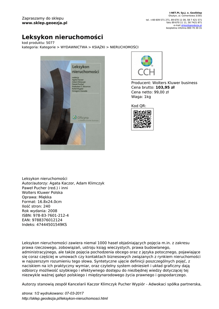 I-NET.PL Sp.J. o. GeoSklep Olsztyn, ul. Cementowa 3/301 Zapraszamy do sklepu www.sklep.geoezja.pl tel. +48 609 571 271, 89 670 11 00, 58 7 421 571 faks 89 670 11 11, 58 7421 871 e-mail [email protected] bezpłatna infolinia 800 70 30 31 Leksykon nieruchomości kod produktu: 5077 kategoria: Kategorie > WYDAWNICTWA > KSIĄŻKI > NIERUCHOMOŚCI Producent: Wolters Kluwer business Cena brutto: 103,95 zł Cena netto: 99,00 zł Waga: 1kg Kod QR: Leksykon nieruchomości Autor/autorzy: Agata Kaczor, Adam Klimczyk Paweł Pucher (red.) i inni Wolters Kluwer Polska Oprawa: Miękka Format: 16.8x24.0cm Ilość stron: 240 Rok wydania: 2008 ISBN: 978-83-7601-212-4 EAN: 9788376012124 Indeks: 47444501549KS Leksykon nieruchomości zawiera niemal 1000 haseł objaśniających pojęcia m.in. z zakresu prawa rzeczowego, zobowiązań, ustroju ksiąg wieczystych, prawa budowlanego, administracyjnego, ale także pojęcia pochodzenia obcego oraz z języka potocznego, pojawiające się coraz częściej w umowach czy kontaktach biznesowych związanych z rynkiem nieruchomości w najszerszym rozumieniu tego słowa. Syntetyczne ujęcie definicji poszczególnych pojęć, z naciskiem na ich praktyczny wymiar, oraz czytelny system odniesień i układ graficzny dają odbiorcy możliwość szybkiego i efektywnego dostępu do niezbędnej wiedzy dotyczącej tej niezwykle ważnej gałęzi polskiego i międzynarodowego życia prawnego i gospodarczego. Autorzy stanowią zespół Kancelarii Kaczor Klimczyk Pucher Wypiór - Adwokaci spółka partnerska, strona: 1/2 wydrukowano: 07-03-2017 http://sklep.geodezja.pl/leksykon-nieruchomosci.html która działa na rynku od 2001 roku. Od chwili powstania jednym z głównych obszarów doradztwa prawnego Kancelarii pozostaje szeroko rozumiany sektor nieruchomości, w tym kompleksowa pomoc prawna dla inwestorów w toku całego procesu inwestycyjnego, postępowania reprywatyzacyjne, doradztwo w zakresie zarządzania funkcjonującymi już nieruchomościami oraz pozyskiwania nieruchomości dla potrzeb inwestycyjnych. Ponadto obszar praktyki Kancelarii obejmuje obsługę inwestycji kapitałowych i infrastrukturalnych, kompleksowe doradztwo korporacyjne, obsługę transakcji w obrocie profesjonalnym i konsumenckim, problematykę własności intelektualnej, a także obsługę środowiska nowego biznesu i rozwiązania rynku pracy. Kancelaria posiada biura w Krakowie i Warszawie. strona: 2/2 wydrukowano: 07-03-2017 http://sklep.geodezja.pl/leksykon-nieruchomosci.html