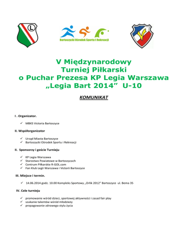 V Międzynarodowy Turniej Piłkarski o Puchar Prezesa KP Legia Warszawa „Legia Bart 2014” U-10 KOMUNIKAT I . Organizator. MBKS Victoria Bartoszyce II. Współorganizator Urząd Miasta Bartoszyce Bartoszycki Ośrodek Sportu i Rekreacji II. Sponsorzy i goście Turnieju KP Legia Warszawa Starostwo Powiatowe w Bartoszycach Centrum Piłkarskie R-GOL.com Fan Klub Legii Warszawa i Victorii Bartoszyce III. Miejsce i termin. 14.06.2014 godz. 10.00 Kompleks Sportowy „Orlik 2012” Bartoszyce ul. Bema 35 IV. Cele turnieju promowanie wśród dzieci, sportowej aktywności i zasad fair play szukanie talentów wśród młodzieży propagowanie zdrowego stylu życia V. Warunki uczestnictwa. turniej jest przeznaczony dla młodzieży rocznik 2004 i młodsi, wpisowe – 300 zł od Klubu (w tym zapewniamy obiad dla zawodników i trenera) , wpłata na konto MBKS Victoria Bartoszyce / BANK PEKAO SA 20 1240 5602 1111 0010 4383 3732 w turnieju mogą uczestniczyć reprezentacje Klubów Sportowych i Stowarzyszeń w turnieju może zagrać maksymalnie 12 zespołów, decyduje kolejność zgłoszeń /Organizator zastrzega możliwość wyboru zespołów/. VI. Zgłoszenia do turnieju. Zgłoszenie do rozgrywek powinno zawierać na odpowiednim protokole zgłoszeniowym: nazwę drużyny, imienna listę zawodników reprezentujących klub ( maksymalnie 12 osób ) wraz z zaznaczeniem osoby kontaktowej kapitan/kierownik drużyny ( druki u organizatora ). Drużyny należy zgłaszać w nieprzekraczalnym terminie do dnia 15 maja 2014, tel. 607 690 195, e-mail: [email protected] Zgłoszenie do rozgrywek jest jednoznaczne z deklaracją przestrzegania regulaminu i przepisów gry w piłkę nożną. VII. Nagrody Każdy zespół otrzyma puchar . Statuetki dla najlepszych zawodników w danym zespole. Statuetka dla najlepszego bramkarza i strzelca turnieju. Każdy zawodnik i trener otrzyma medal pamiątkowy Przewidziane są nagrody rzeczowe od KP Legia Warszawa i sponsorów. VIII. Zakwaterowanie – wyżywienie Nocleg - 20 zł osoba Kolacja - 9 zł osoba Śniadanie - 9 zł osoba Zakwaterowanie w Specjalnym Ośrodku Szkolno Wychowawczym w Bartoszycach, ul. Limanowskiego 9 /w tym ośrodku były organizowane Piłkarskie Wakacje z KP Legia Warszawa/ Dotychczasowi zwycięzcy Turniejów: 2010 – Legia Warszawa – UKS Rona 03 Ełk 4:3 k 2011 – UKS Reda – Stomil Olsztyn 6:5 k 2012 – Legia Warszawa – Naki Olszyn 4:0 2013 – Arka Gdynia - Legia Warszawa 5:4 k