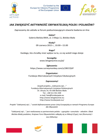 JAK ZWIĘKSZYĆ AKTYWNOŚĆ OBYWATELSKĄ POLEK I POLAKÓW? Zapraszamy do udziału w forum podsumowującym otwarte badania on-line Gdzie? Galeria Bielska BWA, ul. 3 Maja 11, Bielsko-Biała Kiedy? 09 czerwca 2015 r., 10.00—15.00 Kogo? Każdego, kto chciałby mieć wpływ na to, co się wokół niego dzieje Szczegóły: www.letsgetactive.eu/pl/ Zgłoszenia: https://www.surveymonkey.com/s/28CCQVF Organizator: Fundacja Alternatywnych Inicjatyw Edukacyjnych Zapraszamy! Zespół projektu „Uaktywnij się!...” Fundacja Alternatywnych Inicjatyw Edukacyjnych Ul. Ukryta 14, 43-300 Bielsko-Biała Tel.: +48 511 551 439 e-mail: [email protected] http://www.letsgetactive.eu http://www.fundacjaaie.eu/ Projekt "Uaktywnij się!..." został dofinansowane przez Unię Europejską w ramach Programu Europa dla Obywateli. "Uaktywnij się!..." jest realizowany w partnerstwie polsko - cypryjsko- rumuńsko - włoskim. Obok Bielska-Białej podobne, Krajowe Fora Obywatelskie odbędą się w Nikozji (Cypr), Iasi (Rumunia) i Jesi (Włochy).
