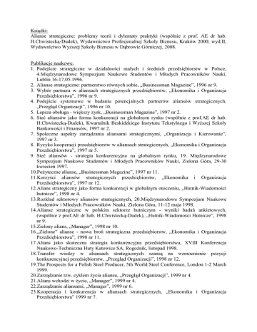 KsiąŜki: Alianse strategiczne: problemy teorii i dylematy praktyki (wspólnie z prof. AE dr hab. H.Chwistecką-Dudek), Wydawnictwo Profesjonalnej Szkoły Biznesu, Kraków 2000; wyd.II, Wydawnictwo WyŜszej Szkoły Biznesu w Dąbrowie Górniczej, 2008. Publikacje naukowe: 1. Podejście strategiczne w działalności małych i średnich przedsiębiorstw w Polsce, 4.Międzynarodowe Sympozjum Naukowe Studentów i Młodych Pracowników Nauki, Lublin 16-17.05.1996. 2. Alianse strategiczne: partnerstwo równych sobie, „Businessman Magazine”, 1996 nr 9. 3. Wybór partnera w aliansach strategicznych przedsiębiorstw, „Ekonomika i Organizacja Przedsiębiorstwa”, 1996 nr 9. 4. Podejście systemowe w badaniu potencjalnych partnerów aliansów strategicznych, „Przegląd Organizacji”, 1996 nr 10. 5. Lepsza obsługa - większy zysk, „Businessman Magazine”, 1997 nr 2. 6. Sieć aliansów jako forma konkurencji na globalnym rynku (wspólnie z prof.AE dr hab. H.Chwistecką-Dudek), Kwartalnik Beskidzkiego Instytutu Tekstylnego i WyŜszej Szkoły Bankowości i Finansów, 1997 nr 2. 7. Społeczne aspekty zarządzania aliansami strategicznymi, „Organizacja i Kierowanie”, 1997 nr 3. 8. Ryzyko kooperacji przedsiębiorstw w aliansach strategicznych, „Ekonomika i Organizacja Przedsiębiorstwa”, 1997 nr 5. 9. Sieć aliansów - strategia konkurencyjna na globalnym rynku, 19. Międzynarodowe Sympozjum Naukowe Studentów i Młodych Pracowników Nauki, Zielona Góra, 29-30 kwiecień 1997. 10.PoŜyteczne alianse, „Businessman Magazine”, 1997 nr 11. 11.Korzyści aliansów strategicznych przedsiębiorstw, „Ekonomika i Organizacja Przedsiębiorstwa”, 1997 nr 12. 12.Alians strategiczny jako forma konkurencji w globalnym otoczeniu, „Hutnik-Wiadomości hutnicze”, 1998 nr 4. 13.Rozkład sektorowy aliansów strategicznych, 20.Międzynarodowe Sympozjum Naukowe Studentów i Młodych Pracowników Nauki, Zielona Góra, 11-12 maja 1998. 14.Alianse strategiczne w polskim sektorze hutniczym - wyniki badań ankietowych, (wspólnie z prof.AE dr hab. H.Chwistecką-Dudek), „Hutnik-Wiadomości Hutnicze”, 1998 nr 9. 15.Zielony alians, „Manager”, 1998 nr 10. 16.„Zielone” alianse - nowa broń strategiczna przedsiębiorstw, „Ekonomika i Organizacja Przedsiębiorstwa”, 1998 nr 11. 17.Alians jako skuteczna strategia konkurencyjna przedsiębiorstwa, XVIII Konferencja Naukowo-Techniczna Huty Katowice SA, Rogoźnik, listopad 1998. 18.Transfer wiedzy w aliansach strategicznych szansą na wzmocnienie pozycji konkurencyjnej przedsiębiorstw, „Przegląd Organizacji”, 1998 nr 12. 19.The Prospects for a Polish Steel Producer, 5th World Steel Conference, London 1-2 March 1999. 20.Zarządzanie tzw. cyklem Ŝycia aliansu, „Przegląd Organizacji”, 1999 nr 4. 21.Alians wchodzi w Ŝycie, „Manager”, 1999 nr 4. 22.Zarządzanie aliansami, „Manager”, 1999 nr 6. 23.Kooperacja i konkurencja w aliansach strategicznych, „Ekonomika i Organizacja Przedsiębiorstwa” 1999 nr 7. 24.Alianse strategiczne w praktyce, „Manager”, 2000 nr 2. 25.Core competencies - koncepcja strategiczna, (wspólnie z prof.AE dr hab. H.ChwisteckąDudek), „Przegląd Organizacji”, 2000 nr 3. 26.Fuzje i alianse strategiczne w branŜy hutniczej, Konferencja naukowa WyŜszej Szkoły Biznesu w Dąbrowie Górniczej „Alianse strategiczne przedsiębiorstw”, Ustroń, 25-26 września 2000. 27.Alians strategiczny a fuzja, „Ekonomika i Organizacja Przedsiębiorstwa”, 2001 nr 5. 28.Konsolidacja branŜy stalowej - moda czy konieczność?, „Hutnik-Wiadomości Hutnicze”, 2001 nr 10. 29.HK Stal-Service - udany przykład transformacji firmy z branŜy stalowej, w: Restrukturyzacja a procesy rozwoju i kreowania wartości przedsiębiorstw, pod red.naukową R.Borowieckiego i A.Jakiego, Wyd. Akademii Ekonomicznej w Krakowie, Warszawa-Kraków 2002. 30.Dwa fiaska, czyli meandry niepowodzenia prywatyzacji Huty Katowice, XXIII Konferencja Naukowo-Techniczna Huty Katowice „Restrukturyzacja branŜy hutniczej w Polsce – historia i teraźniejszość”, Rogoźnik, 7-8 listopada 2002 (wspólnie z dr.inŜ. A.Szydło). 31.Globalizacja jako kluczowy element konsolidacji spółek koncernu Polskie Huty Stali S.A., w: Globalizacja i integracja gospodarcza a procesy restrukturyzacji i rozwoju przedsiębiorstw, pod red.naukową R.Borowieckiego i A.Jakiego, Warszawa-Kraków 2003. 32.Strategiczno-finansowe aspekty restrukturyzacji Huty Katowice: próba systematyzacji, „Hutnik-Wiadomości Hutnicze”, 2003 nr 11. 33.Przewaga konkurencyjna firmy z branŜy przetwórstwa hutniczego: zmierzch tradycyjnych reguł konkurowania?, w: Nowoczesność przemysłu i usług: nowe wyzwania, pod red.nauk. Jana Pyki, Wyd.TNOiK Katowice, 2004. 34.Alianse strategiczne i fuzje jako główne strategie w warunkach globalizacji, w: Strategie wzrostu wartości przedsiębiorstwa. Teoria i praktyka gospodarcza, pod red.nauk.E.Urbańczyka, t.1, Zeszyty Naukowe Uniwersytetu Szczecińskiego, nr 378, Szczecin 2004. 35.Przewaga konkurencyjna firmy: od lokalizacji do strategii globalnych, w: Uwarunkowania rozwoju i konkurencyjności przedsiębiorstw, pod red. naukową A.Nehring, Wyd. WyŜszej Szkoły Biznesu w Dąbrowie Górniczej, 2004. 36.Alianse logistyczne: nowe podejście do współpracy przedsiębiorstw, w: Restrukturyzacja w okresie transformacji gospodarczej: instrumenty, przebieg, efekty, pod red.naukową R.Borowieckiego i A.Jakiego, Wyd. Akademii Ekonomicznej w Krakowie, WarszawaKraków 2005. 37.Fuzje i przejęcia jako główne instrumenty wzrostu wartości firm: aspekty praktyczne, „Hutnik-Wiadomości Hutnicze”, 2005 nr 9. 38.Venture Capital as a useful tool in formation of strategic alliances and network connections, Enterprises in the face of 21st century challenges, DevelopmentManagement-Entrepreneurship, under edition of R.Borowiecki & A.Jaki, Cracow University of Economics, January 2008. 39.Sieci aliansów: domena sektorów zaawansowanej techniki?, „Hu