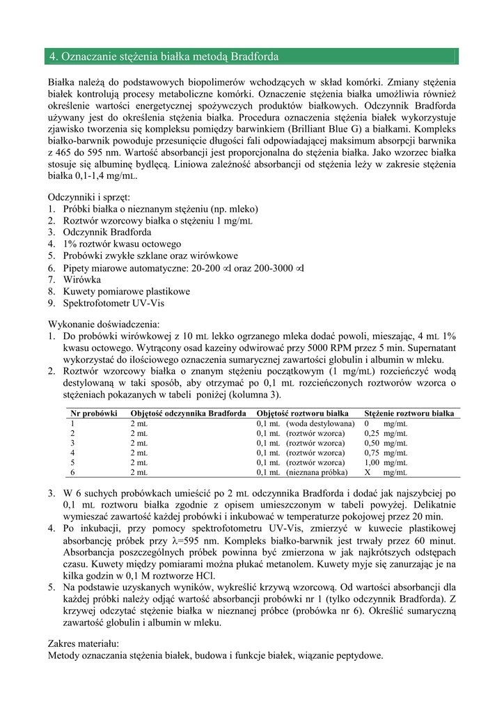 4. Oznaczanie stęŜenia białka metodą Bradforda