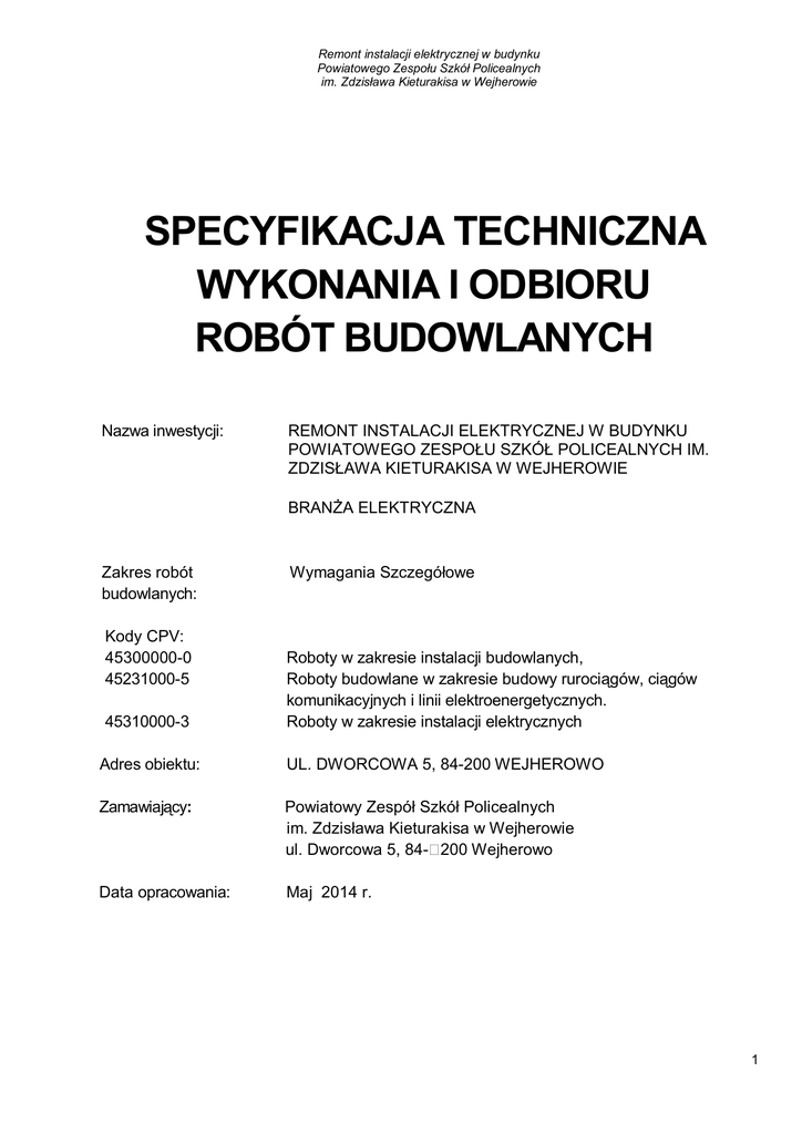 Remont instalacji elektrycznej w budynku Powiatowego Zespołu Szkół Policealnych im. Zdzisława Kieturakisa w Wejherowie SPECYFIKACJA TECHNICZNA WYKONANIA I ODBIORU ROBÓT BUDOWLANYCH Nazwa inwestycji: REMONT INSTALACJI ELEKTRYCZNEJ W BUDYNKU POWIATOWEGO ZESPOŁU SZKÓŁ POLICEALNYCH IM. ZDZISŁAWA KIETURAKISA W WEJHEROWIE BRANŻA ELEKTRYCZNA Zakres robót budowlanych: Kody CPV: 45300000-0 45231000-5 45310000-3 Wymagania Szczegółowe Roboty w zakresie instalacji budowlanych, Roboty budowlane w zakresie budowy rurociągów, ciągów komunikacyjnych i linii elektroenergetycznych. Roboty w zakresie instalacji elektrycznych Adres obiektu: UL. DWORCOWA 5, 84-200 WEJHEROWO Zamawiający: Powiatowy Zespół Szkół Policealnych im. Zdzisława Kieturakisa w Wejherowie ul. Dworcowa 5, 84-200 Wejherowo Data opracowania: Maj 2014 r. 1 Remont instalacji elektrycznej w budynku Powiatowego Zespołu Szkół Policealnych im. Zdzisława Kieturakisa w Wejherowie SPIS TREŚCI 1. WSTĘP 1.1. Przedmiot specyfikacji technicznej 2 1.2. Zakres stosowania ST 2 1.3. Uwagi ogólne 2 1.4. Zakres robót ujętych w ST 6 1.5. Określenia podstawowe 7 1.6. Nazwy i kody 8 1.7. Ogólne wymagania dotyczące robót 9 1.8. Informacje o organizacji budowy 9 2. MATERIAŁY 10 2.1. Rozdzielnia 11 2.2. Oprawy oświetleniowe 12 2.3. Przewody 12 2.4. Odbiór materiałów na budowie 12 2.5. Materiały nie odpowiadające wymaganiom 12 2.6. Składowanie materiałów 12 3. SPRZĘT 13 3.1. Składowanie materiałów 13 4. TRANSPORT 13 5. WYKONYWANIE ROBÓT 13 5.1. Ogólne zasady wykonywania robót 13 5.2. Kolejność wykonywania robót 14 5.3. Instalacje elektryczne i słaboprądowe wewnętrzne 15 6. KONTROLA JAKOŚCI 21 6.1 Próby montażowe 21 7. OBMIAR ROBÓT 21 8. ODBIÓR ROBÓT 22 9. PODSTAWA PŁATNOŚCI 22 10. DOKUMENTY ODNIESIENIA 23 2 Remont instalacji elektrycznej w budynku Powiatowego Zespołu Szkół Policealnych im. Zdzisława Kieturakisa w Wejherowie ST 03 ROBOTY INSTALACYJNE ST 03 - 06 INSTALACJE ELEKTRYCZNE 1.WSTĘP 1.1 Przedmiot Specyfikacji Technicznej. Przedmiotem niniejszej ST są wymagania dotyczące wykonania i odbioru: „REMONT INSTALACJI ELEKTRYCZNEJ W BUDYNKU POWIATOWEGO ZESPOŁU SZKÓŁ POLICEALNYCH IM. ZDZISŁAWA KIETURAKISA W WEJHEROWIE.” 1.2 Zakres stosowania ST. Specyfikacja Techniczna jest stosowana jako dokument przetargowy i kontraktowy przy zlecaniu i realizacji robót nazwanych w pkt. 1.1 1.3 Uwagi Ogólne. • Wszystkie wymienione w niniejszej specyfikacji roboty, materiały i czynności itp. - o ile nie zaznaczono inaczej - SA realizowane, dostarczane, wykonywane na koszt Wykonawcy. • W przypadku kolizji i zbliżenia kabli energetycznych z innymi sieciami zapewnić nadzór ze strony gestorów sieci. • W zakresie realizacji robót Wykonawca musi przestrzegać obowiązujących przepisów, rozporządzeń, norm i ustaw oraz wytycznych producentów urządzeń i materiałów. • W projekcie architektury i konstrukcji nie wykazuje się przebić o średnicy lub boku mniejszych równych 200mm w elewacjach konstrukcyjnych. Koordynacja i ich wykonanie należy do obowiązków Wykonawcy. • W trakcie realizacji projekty wykonawcze należy szczegółowo skoordynować ze wszystkimi branżami. • Zastosowane urządzenia i materiały muszą posiadać wymagane dokumenty dopuszczające do stosowania. • Wykonawca odpowiedzialny jest za dostosowanie przebiegu instalacji do wymagań ochrony pożarowej (uszczelnienia pożarowe przejść przez przegrody ogniowe itp.) • Kompletność instalacji. Umowa zawierana jest na wykonanie instalacji kompletnej, w pełni sprawnej i spełniającej wszystkie wymagania techniczne, formalne i estetyczne. • W cenie robót należy uwzględnić wszystkie materiały i czynności nawet, jeśli nie zostały wyraźnie wymienione w dokumentacji przetargowej, a niezbędne są do prawidłowej realizacji i eksploatacji instalacji. • W cenie robót należy uwzględnić wyposażenie wszystkich pomieszczeń energetycznych w wymagany przepisami sprzęt BHP. 3 Remont instalacji elektrycznej w budynku Powiatowego Zespołu Szkół Policealnych im. Zdzisława Kieturakisa w Wejherowie • • Wszystkie podwieszenia i podparcia instalacji Wykonawca uwzględni w cenie i wykona według swojego opracowania z uwzględnieniem lokalnych warunków montażowych. Podane parametry wyspecyfikowanych urządzeń i materiałów są parametrami minimalnymi. Wykonawca jest zobowiązany dla własnych potrzeb sprawdzić ich prawidłowość i w razie potrzeby odpowiednio skorygować bez żądania dodatkowych kosztów. 1.3.1 Dokumenty, które należy dostarczyć przed realizacją Przed rozpoczęciem wykonania prac i złożeniem zamówień materiałowych Wykonawca przedłoży wymienione poniżej dokumenty. Wszystkie dokumenty muszą uzyskać akceptację upoważnionego przedstawiciela Inwestora. • Szczegółowa lista proponowanych wyrobów takich jak lampy, osprzęt, listwy instalacyjne, źródła światła itp. W przestrzeniach użytkowych i w terenie (widoczne dla użytkownika). Lista musi zawierać nazwę producenta, typ, wymiary, parametry techniczne i inne informacje. Elementy te podlegają procedurze prezentacji i akceptacji Inwestora. • Szczegółowa lista proponowanych wyrobów takich jak rozdzielnice i tablice elektryczne, osprzęt i aparaty w tablicach rozdzielczych, kable, przewody, itp. Lista musi zawierać nazwę producenta, typ, wymiary, parametry techniczne i inne konieczne informacje. Dodatkowo należy przedstawić rysunki techniczne, zdjęcia i inne dokumenty wymagane przez upoważnionego przedstawiciela Inwestora. 1.3.2 Dokumenty, które należy dostarczyć przed odbiorem wstępnym • Szczegółowa instrukcja obsługi i sterowania instalacji. Musi ona zawierać przynajmniej: - opis funkcjonalny instalacji, - wykaz obwodów wraz ze szczegółową numeracją odbiorników, - listę nastaw urządzeń regulacyjnych i programowalnych, - listę prawidłowych wskazań stałych aparatów pomiarowych