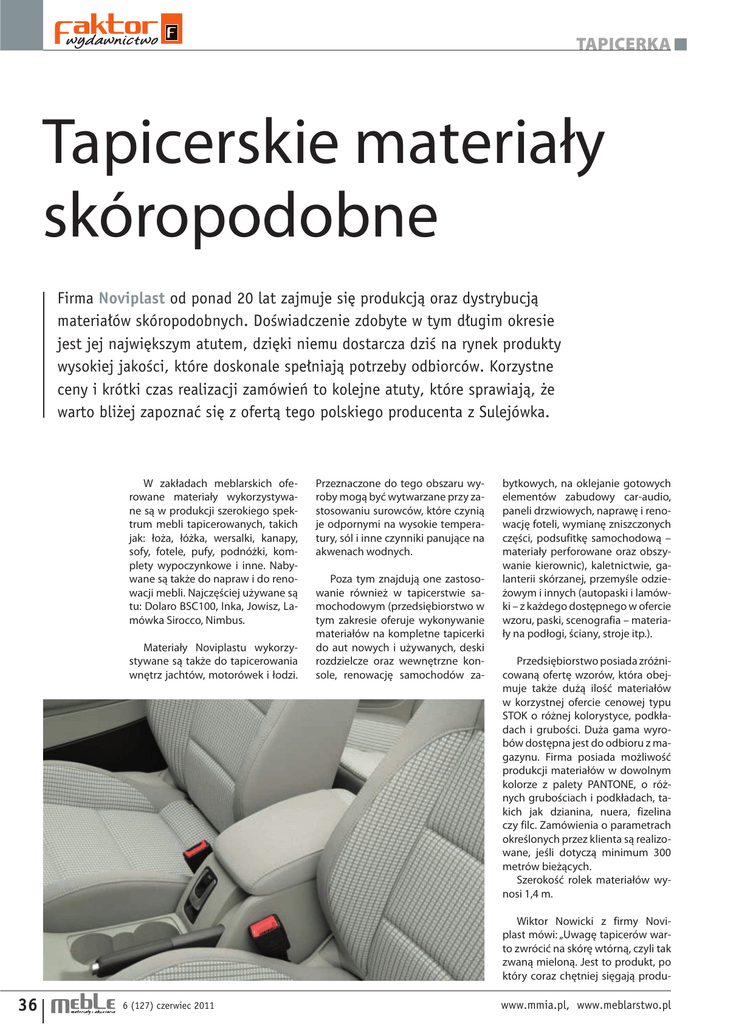 TAPICERKA Tapicerskie materiały skóropodobne Firma Noviplast od ponad 20 lat zajmuje się produkcją oraz dystrybucją materiałów skóropodobnych. Doświadczenie zdobyte w tym długim okresie jest jej największym atutem, dzięki niemu dostarcza dziś na rynek produkty wysokiej jakości, które doskonale spełniają potrzeby odbiorców. Korzystne ceny i krótki czas realizacji zamówień to kolejne atuty, które sprawiają, że warto bliżej zapoznać się z ofertą tego polskiego producenta z Sulejówka. W zakładach meblarskich oferowane materiały wykorzystywane są w produkcji szerokiego spektrum mebli tapicerowanych, takich jak: łoża, łóżka, wersalki, kanapy, sofy, fotele, pufy, podnóżki, komplety wypoczynkowe i inne. Nabywane są także do napraw i do renowacji mebli. Najczęściej używane są tu: Dolaro BSC100, Inka, Jowisz, Lamówka Sirocco, Nimbus. Materiały Noviplastu wykorzystywane są także do tapicerowania wnętrz jachtów, motorówek i łodzi. Przeznaczone do tego obszaru wyroby mogą być wytwarzane przy zastosowaniu surowców, które czynią je odpornymi na wysokie temperatury, sól i inne czynniki panujące na akwenach wodnych. Poza tym znajdują one zastosowanie również w tapicerstwie samochodowym (przedsiębiorstwo w tym zakresie oferuje wykonywanie materiałów na kompletne tapicerki do aut nowych i używanych, deski rozdzielcze oraz wewnętrzne konsole, renowację samochodów za- bytkowych, na oklejanie gotowych elementów zabudowy car-audio, paneli drzwiowych, naprawę i renowację foteli, wymianę zniszczonych części, podsufitkę samochodową – materiały perforowane oraz obszywanie kierownic), kaletnictwie, galanterii skórzanej, przemyśle odzieżowym i innych (autopaski i lamówki – z każdego dostępnego w ofercie wzoru, paski, scenografia – materiały na podłogi, ściany, stroje itp.). Przedsiębiorstwo posiada zróżnicowaną ofertę wzorów, która obejmuje także dużą ilość materiałów w korzystnej ofercie cenowej typu STOK o różnej kolorystyce, podkładach i grubości. Duża gama wyrobów dostępna jest do odbioru z magazynu. Firma posiada możliwość produkcji materiałów w dowolnym kolorze z palety PANTONE, o różnych grubościach i podkładach, takich jak dzianina, nuera, fizelina czy filc. Zamówienia o parametrach określonych przez klienta są realizowane, jeśli dotyczą minimum 300 metrów bieżących. Szerokość rolek materiałów wynosi 1,4 m. Wiktor Nowicki z firmy Noviplast mówi: „Uwagę tapicerów warto zwrócić na skórę wtórną, czyli tak zwaną mieloną. Jest to produkt, po który coraz chętniej sięgają produ- 36 6 (127) czerwiec 2011 www.mmia.pl, www.meblarstwo.pl TAPICERKA Cavallo cenci mebli, stosując go w miejsce skóry naturalnej. Jego popularność bierze się z połączenia dobrych właściwości fizycznych, między innymi zdolności do pochłaniania potu i odporności na jego działanie oraz atrakcyjnej ceny. Trzeba za niego zapłacić około 1/3 kwoty, jaką musielibyśmy przeznaczyć na skórę naturalną. W produkcji mebli wykorzystywany jest na wierzchy siedzisk Croco i oparć, elementów stołów, ław, obrzeży mebli. Dostępne są grubości od 0,25 do 3,8 mm”. Wiktor Nowicki dodaje: „Wykonujemy również perforowanie materiałów powlekanych swojej produkcji oraz materiałów powierzonych przez klientów. Maksymalna szerokość materiałów powlekanych do dziurkowania wynosi 1,5 m, a Perforowane skór naturalnych 0,5 m. Cena jest zależna od rodzaju wykonania, grubości i rodzaju podkładu”. Ofertę Noviplastu dopełniają usługi w zakresie cięcia tkanin, dzianin, sztywników itp. w rolce na taśmy lamówkowe na dowolną szerokość, w tym również materiałów powierzonych przez klientów. (z) Carbon Arizona Ambrozja Nebraska połysk Dolaro Emu reklama www.mmia.pl, www.meblarstwo.pl 6 (127) czerwiec 2011 37