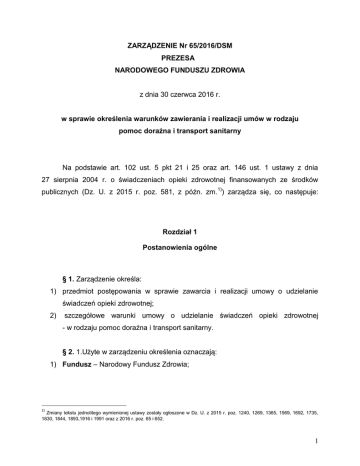 ZARZĄDZENIE Nr 65/2016/DSM PREZESA NARODOWEGO FUNDUSZU ZDROWIA z dnia 30 czerwca 2016 r. w sprawie określenia warunków zawierania i realizacji umów w rodzaju pomoc doraźna i transport sanitarny Na podstawie art. 102 ust. 5 pkt 21 i 25 oraz art. 146 ust. 1 ustawy z dnia 27 sierpnia 2004 r. o świadczeniach opieki zdrowotnej finansowanych ze środków publicznych (Dz. U. z 2015 r. poz. 581, z późn. zm. 1)) zarządza się, co następuje: Rozdział 1 Postanowienia ogólne § 1. Zarządzenie określa: 1) przedmiot postępowania w sprawie zawarcia i realizacji umowy o udzielanie świadczeń opieki zdrowotnej; 2) szczegółowe warunki umowy o udzielanie świadczeń opieki zdrowotnej - w rodzaju pomoc doraźna i transport sanitarny. § 2. 1.Użyte w zarządzeniu określenia oznaczają: 1) Fundusz – Narodowy Fundusz Zdrowia; 1) Zmiany tekstu jednolitego wymienionej ustawy zostały ogłoszone w Dz. U. z 2015 r. poz. 1240, 1269, 1365, 1569, 1692, 1735, 1830, 1844, 1893,1916 i 1991 oraz z 2016 r. poz. 65 i 652. 1 2) gotowość – warunki organizacyjno-techniczne pozwalające na wykorzystanie zasobów kadrowych oraz niezbędnego sprzętu i wyposażenia pozostających w dyspozycji do udzielania świadczeń w ciągu doby; 3) miejsce wyczekiwania – miejsce stacjonowania wyjazdowego zespołu sanitarnego typu „N”, w którym zespół oczekuje na zadysponowanie do wyjazdu; 4) Oddział Funduszu – oddział wojewódzki Funduszu; 5) rejon działania – spójny terytorialnie obszar (województwo, powiat lub grupa powiatów) działania wyjazdowego zespołu sanitarnego typu „N”, z którego przyjmowane są i realizowane zlecenia wyjazdu; 6) rodzaj świadczeń – rodzaj, o którym mowa w przepisach wydanych na podstawie art. 137 ust. 2 ustawy o świadczeniach; 7) rozporządzenie – rozporządzenie Ministra Zdrowia w sprawie świadczeń gwarantowanych z zakresu leczenia szpitalnego, wydane na podstawie art. 31d ustawy o świadczeniach; 8) rozporządzenie kryterialne – rozporządzenie Ministra Zdrowia w sprawie szczegółowych kryteriów wyboru ofert w postępowaniu w sprawie zawarcia umów o udzielanie świadczeń opieki zdrowotnej, wydane na podstawie art. 148 ust. 3 ustawy o świadczeniach; 9) ryczałt – uśredniona kwota przeznaczona na sfinansowanie świadczeń wyjazdowego zespołu sanitarnego typu „N” w ramach gotowości do wykonywania świadczeń w ciągu doby; 10) ustawa o świadczeniach – ustawa z dnia 27 sierpnia 2004 r. o świadczeniach opieki zdrowotnej finansowanych ze środków publicznych. 2. Określenia inne niż wymienione w ust. 1, użyte w zarządzeniu, mają znaczenie nadane im w przepisach odrębnych, w tym w szczególności w rozporządzeniu oraz w Ogólnych warunkach umów o udzielanie świadczeń opieki zdrowotnej, stanowiących załącznik do rozporządzenia Ministra Zdrowia, wydanego na podstawie art. 137 ust. 2 ustawy o świadczeniach, zwanych dalej „Ogólnymi warunkami umów”. 2 Rozdział 2 Przedmiot postępowania § 3. 1. Przedmiotem postępowania, o którym mowa w § 1 pkt 1, jest wyłonienie świadczeniodawcy do udzielania świadczeń w rodzaju pomoc doraźna i transport sanitarny, realizowanych przez wyjazdowe zespoły sanitarne typu „N”. 2. Postępowanie, o którym mowa § 1 pkt 1, ma na celu wyłonienie świadczeniodawcy do realizacji świadczeń na obszarze terytorialnym: 1) województwa; 2) grupy powiatów; 3) powiatu. § 4. Zgodnie ze Wspólnym Słownikiem Zamówień, określonym w rozporządzeniu nr 2195/2002 WE Parlamentu Europejskiego i Rady z dnia 5 listopada 2002 r. w sprawie Wspólnego Słownika Zamówień (CPV) - (Dz. Urz. WE L 340 z 16.12. 2002, str.1 i n., z późn. zm.) oraz zgodnie z art. 141 ust. 4 ustawy o świadczeniach, przedmiotem postępowania w celu zawarcia umów objęte są: - 85120000-6 Usługi medyczne i podobne. Rozdział 3 Szczegółowe warunki umowy § 5. 1. Przedmiotem umowy w rodzaju pomoc doraźna i transport sanitarny, zwanej dalej „umową”, jest realizacja świadczeń udzielanych świadczeniobiorcom przez świadczeniodawcę w zakresie określonym w załączniku nr 1 do zarządzenia, finansowanych przez Fundusz. 2. Wzór umowy o udzielanie świadczeń, o których mowa w ust. 1, stanowi załącznik nr 2 do zarządzenia. 3. Odstępstwa od wzoru umowy wymagają pisemnej zgody Prezesa Funduszu. 3 § 6. 1. Świadczeniodawca realizujący umowę obowiązany jest spełniać wymagania określone w rozporządzeniu, niniejszym zarządzeniu oraz w przepisach odrębnych. § 7. 1. Wyjazdowy zespół sanitarny typu „N” udziela świadczeń w stanach nagłego pogorszenia stanu zdrowia dziecka od jego urodzenia do ukończenia 4. tygodnia życia, a w przypadkach uzasadnionych medycznie – do końca pierwszego roku życia dziecka, w tym wykonuje dla tej grupy świadczeniobiorców transport sanitarny, przy użyciu zestawu inkubatora transportowego, w szczególności w następujących stanach chorobowych: 1) niewydolność oddechowa wymagająca sztucznej wentylacji; 2) niewydolność układu krążenia; 3) stany wymagające interwencji chirurgicznej i po zabiegach; 4) inne (np. drgawki, niska waga urodzeniowa). 2. Wyjazdowy zespół sanitarny typu „N” realizuje świadczenia opieki zdrowotnej, w stanach chorobowych, w stosunku do dzieci w wieku określonym w ust. 1, w szczególności w przypadkach: 1) konieczności niezwłocznego wykonania zabiegu w innym podmiocie leczniczym – transport na zlecenie świadczeniodawcy, u którego hospitalizowane jest dziecko; 2) konieczności kontynuacji leczenia w innym podmiocie leczniczym – transport dziecka chorego odpowiednio do lub z ośrodka referencyjnego znajdującego się w rejonie lub poza rejonem działania, na podstawie zlecenia świadczeniodawcy, u którego hospitalizowane jest dziecko. § 8. 1. Świadczeniodawca udzielający świadczeń w zakresie wyjazdowego zespołu sanitarnego typu „N”, zapewnia gotowość do udzielania świadczeń utrzymując w stałej dyspozycj