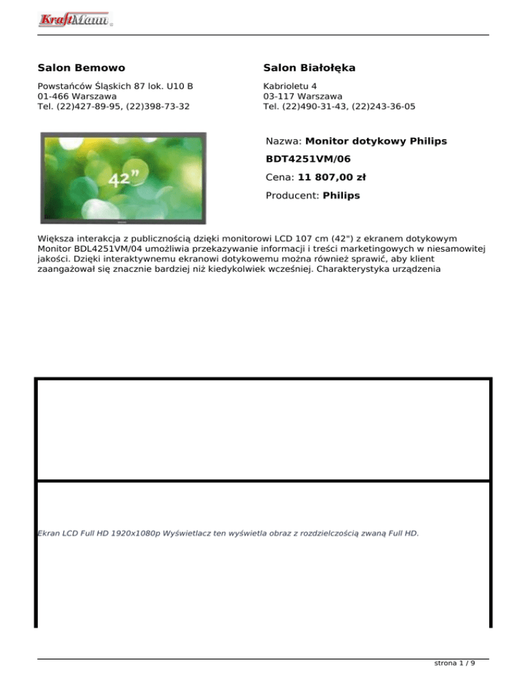 Salon Bemowo Salon Białołęka Powstańców Śląskich 87 lok. U10 B 01-466 Warszawa Tel. (22)427-89-95, (22)398-73-32 Kabrioletu 4 03-117 Warszawa Tel. (22)490-31-43, (22)243-36-05 Nazwa: Monitor dotykowy Philips BDT4251VM/06 Cena: 11 807,00 zł Producent: Philips Większa interakcja z publicznością dzięki monitorowi LCD 107 cm (42") z ekranem dotykowym Monitor BDL4251VM/04 umożliwia przekazywanie informacji i treści marketingowych w niesamowitej jakości. Dzięki interaktywnemu ekranowi dotykowemu można również sprawić, aby klient zaangażował się znacznie bardziej niż kiedykolwiek wcześniej. Charakterystyka urządzenia Ekran LCD Full HD 1920x1080p Wyświetlacz ten wyświetla obraz z rozdzielczością zwaną Full HD. strona 1 / 9 Najnowocześniejsza technologia ekranów LCD umożliwia wyświetlanie obrazu panoramicznego wysokiej rozdzielczości (1080 progresywnych linii po 1920 pikseli każda), co pozwala uzyskać najwyższą jakości obrazu z dowolnego sygnału wejściowego w formacie HD do 1080 linii. Obraz jest czysty, bez migotania, ma optymalną jasność i rewelacyjne kolory. Żywy i ostry obraz zapewnia niezapomniane wrażenia podczas oglądania. strona 2 / 9 strona 3 / 9 Wejście HDMI zapewnia cyfrowy sygnał HD w jednym przewodzie Interfejs HDMI zapewnia cyfrowe połączenie nieskompresowanego sygnału RGB pomiędzy źródłem sygnału i ekranem. Brak konwersji na sygnał analogowy zapewnia rewelacyjny obraz, a silny sygnał zmniejszone migotanie i czystszą wizję. Interfejs HDMI w sposób inteligentny komunikuje się w najwyższej rozdzielczości z urządzeniem źródłowym. Jest on w pełni kompatybilny wstecz ze źródłami sygnału DVI oraz przekazuje dźwięk cyfrowy. HDMI wykorzystuje zabezpieczenie przed strona 4 / 9 kopiowaniem HDCP. Opracowany pod kątem całodobowej pracy Ponieważ interesy prowadzi się bez przerwy, nasze monitory informacyjno-reklamowe zostały zaprojektowane z myślą o całodobowej pracy. Dzięki doskonałym podzespołom strona 5 / 9 gwarantującym lepszą jakość można mieć pewność, że te modele będą działały niezawodnie przez całą dobę. strona 6 / 9 Optyczna technologia IR Touch Dzięki niewidocznej podczerwonej siatce na powierzchni ekranu możesz cieszyć się niezwykłą dokładnością i krótkim czasem reakcji, niezależnie od tego, czy sterujesz palcem, dłonią w rękawiczce czy nawet rysikiem. Cała powierzchnia panelu jest czuła na dotyk. strona 7 / 9 Dotykowy ekran Monitor wyposażony w 4 kamery, po jednej w każdym rogu wyświetlacza, zapewni Ci doskonałą precyzję i łatwość sterowania dotykiem bez konieczności stosowania najmniejszej siły. Dotykowy ekran jest bardzo czuły i daje możliwość dostosowania dokładności do potrzeb użytkownika, dzięki czemu możesz sterować zarówno palcem, jak i dłonią w rękawiczce czy nawet 4-milimetrowym rysikiem. strona 8 / 9 Automatyczne dopasowanie jasności do warunków otoczenia Ustawienia obrazu są dopasowywane automatycznie do oświetlenia otoczenia bez interwencji użytkownika. Wysoka jasność gwarantuje bardziej wyraźny obraz Ciesz się bardziej wyraźnym obrazem w mocno oświetlonych miejscach dzięki panelowi o jasności 700 nitów. W miejscach nienarażonych na bezpośrednie działanie promieni słonecznych, ale jaśniejszych niż zazwyczaj, obraz jest optymalizowany i cechuje się wyższą jakością. Zgodność ze wszystkimi wiodącymi systemami operacyjnymi Nasze monitory dotykowe działają niezależnie od oprogramowania i obsługują następujące systemy: Windows 8, Windows 7, Vista, XP, Mac OS i Linux. Zaawansowana funkcja zapobiegająca efektowi poświaty obrazu Wyświetlanie statycznych obrazów na ekranie przez dłuższy czas może spowodować wyświetlanie „widmowego” obrazu na wyświetlaczu LCD. Taki obraz nie jest wyświetlany na ekranie na stałe, jednak należy temu zapobiegać, zwłaszcza w miejscach, gdzie obraz wyświetlany jest bez przerwy. 4 Touch Points Ciesz się interaktywnymi doświadczeniami, jakie daje Ci rozwiązanie 4 Touch Points. Idealne w sytuacjach, gdy kilku użytkowników chce jednocześnie skorzystać z aplikacji. 4 Touch Points to niezmiernie opłacalne rozwiązanie. strona 9 / 9 Powered by TCPDF (www.tcpdf.org)
