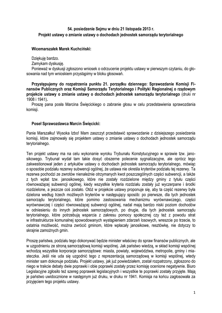 54. posiedzenie Sejmu w dniu 21 listopada 2013 r. Projekt ustawy o zmianie ustawy o dochodach jednostek samorządu terytorialnego Wicemarszałek Marek Kuchciński: Dziękuję bardzo. Zamykam dyskusję. Ponieważ w dyskusji zgłoszono wniosek o odrzucenie projektu ustawy w pierwszym czytaniu, do głosowania nad tym wnioskiem przystąpimy w bloku głosowań. Przystępujemy do rozpatrzenia punktu 21. porządku dziennego: Sprawozdanie Komisji Finansów Publicznych oraz Komisji Samorządu Terytorialnego i Polityki Regionalnej o rządowym projekcie ustawy o zmianie ustawy o dochodach jednostek samorządu terytorialnego (druki nr 1908 i 1941). Proszę pana posła Marcina Święcickiego o zabranie głosu w celu przedstawienia sprawozdania komisji. Poseł Sprawozdawca Marcin Święcicki: Panie Marszałku! Wysoka Izbo! Mam zaszczyt przedstawić sprawozdanie z dzisiejszego posiedzenia komisji, które zajmowały się projektem ustawy o zmianie ustawy o dochodach jednostek samorządu terytorialnego. Ten projekt ustawy ma na celu wykonanie wyroku Trybunału Konstytucyjnego w sprawie tzw. janosikowego. Trybunał wydał tam takie dosyć obszerne polecenie sygnalizacyjne, ale oprócz tego zakwestionował jeden z artykułów ustawy o dochodach jednostek samorządu terytorialnego, mówiąc o sposobie podziału rezerwy subwencji ogólnej, że ustawa nie określa kryteriów podziału tej rezerwy. Ta rezerwa pochodzi ze zwrotów nienależnie otrzymanych kwot poszczególnych części subwencji, a także z tych wpłat tzw. janosikowego, które nie zostały rozdzielone między gminy z tytułu części równoważącej subwencji ogólnej, kiedy wszystkie kryteria rozdziału zostały już wyczerpane i środki rozdzielone, a jeszcze coś zostało. Otóż w projekcie ustawy proponuje się, aby ta część rezerwy była dzielona według trzech możliwych kryteriów w następujący sposób: po pierwsze, dla tych jednostek samorządu terytorialnego, które pomimo zastosowania mechanizmu wyrównawczego, części wyrównawczej i części równoważącej subwencji ogólnej, nadal mają bardzo niski poziom dochodów w odniesieniu do innych jednostek samorządowych, po drugie, dla tych jednostek samorządu terytorialnego, które potrzebują wsparcia z zakresu pomocy społecznej czy też z powodu strat w infrastrukturze komunalnej spowodowanych wystąpieniem zdarzeń losowych, wreszcie po trzecie, to ostatnia możliwość, można zwrócić gminom, które wpłacały janosikowe, resztówkę, nie dotyczy to skrajnie zamożnych gmin. Proszę państwa, podziału tego dokonywać będzie minister właściwy do spraw finansów publicznych, ale w uzgodnieniu ze stroną samorządową komisji wspólnej. Jak państwo wiedzą, w skład komisji wspólnej wchodzą wszystkie korporacje samorządowe: miasta, powiaty, województwa, metropolie, gminy i miasteczka. Jeśli nie uda się uzgodnić tego z reprezentacją samorządową w komisji wspólnej, wtedy minister sam dokonuje podziału. Projekt ustawy, jak już powiedziałem, został rozpatrzony, zgłoszono do niego w trakcie debaty dwie poprawki i obie poprawki zostały przez komisję ocenione negatywnie. Biuro Legislacyjne zgłosiło też szereg poprawek legislacyjnych i wszystkie te poprawki zostały przyjęte. Mają je państwo uwidocznione w następnym już druku, w druku nr 1941. Komisja na końcu zagłosowała za przyjęciem tego projektu ustawy. 1 Wicemarszałek Marek Kuchciński: Dziękuję panu posłowi. Informuję, że w dyskusji nad tym punktem porządku dziennego wysłuchamy 5-minutowych oświadczeń w imieniu klubów i koła. Otwieram dyskusję. No tak, mamy taką sytuację, że klub Platformy Obywatelskiej nie zgłosił swojego... (Poseł Krystyna Skowrońska: Zgłosił, panie marszałku. Jestem upoważniona w imieniu klubu Platformy Obywatelskiej.) W takim razie pani poseł Krystyna Skowrońska zgłasza swoje wystąpienie. Proszę bardzo. Poseł Krystyna Skowrońska: Proszę mi to odliczyć od czasu. Zostałam poinformowana przez władze klubu, że zostałam wybrana do wygłoszenia opinii w imieniu Klubu Parlamentarnego Platforma Obywatelska. Chciałabym to zrobić bardzo krótko, bo ten ustalony czas pięciu minut jest wyjątkowo krótki, jeśli chodzi o objaśnienie projektu. Poseł sprawozdawca o tym powiedział, niemniej jednak warto to wyartykułować: w wyroku Trybunału Konstytucyjnego z 31 stycznia br. powiedziano, że niektóre rozwiązania związane z podziałem rezerwy subwencji ogólnej są rozwiązaniami niekonstytucyjnymi. Projekt ten wychodzi naprzeciw usunięciu regulacji niekonstytucyjnych, w których nie było kryterium, według którego minister finansów dysponował rezerwą przeznaczoną dla jednostek samorządu terytorialnego, w oparciu o art. 36 ust. 4 niniejszego projektu ustawy. Obecnie zmodyfikowany utrzymywał poszczególne zasady tworzenia rezerwy subwencji w oparciu o art. 21 ustawy. Rezerwa ta zwiększona jest o środki, które nie zostały rozdysponowane między gminy w części równoważącej subwencji ogólnej. Przepisy projektu umożliwią podział tej subwencji ze środków rezerwy według przyjętych kryteriów ustawowych, o których powiedział poseł sprawozdawca. Rezerwa będzie przeznaczona dla jednostek, których dochody po zastosowaniu mechanizmu pozostają nadal na niskim poziomie. Chodzi też o wsparcie jednostek realizujących ważne zadania własne z zakresu pomocy społecznej i o pokrycie strat w infrastrukturze komunalnej zniszczonej wskutek zdarzeń losowych, a także o zwrot nierozdysponowanych wpłat z ograniczeniami wskazanymi w projekcie. Podziału środków z rezerwy dokonywał będzie minister, który ustalał będzie kryterium zgodnie z reprezentacją jednostek samorządów terytorialnych. Regulacja ta jest reakcją na aktualne potrzeby jednostek samorządu terytorialnego. Przepis reguluje sytuację, w której nie zostanie uzgodniony sposób podziału rezerwy. Podziału dokona minister, dla gmin z przeznaczeniem na częś