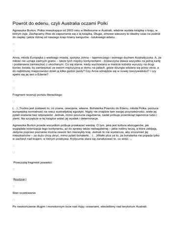 Powrót do edenu, czyli Australia oczami Polki Agnieszka Burton, Polka mieszkająca od 2003 roku w Melbourne w Australii, właśnie wydała książkę o kraju, w którym żyje. Zachęcamy Was do zapoznania się z tą książką. Długie, zimowe wieczory to idealny czas na podróż do ciepłej i jakże różnej od naszego kraju krainy kangurów - tutułowego edenu. Anna, młoda Europejka z wielkiego miasta, spotyka Johna – tajemniczego i wolnego duchem Australijczyka. A, że miłość nie uznaje żadnych granic – także tych między kontynentami - dziewczyna stawia wszystko na jedną kartę i postanawia zamieszkać z ukochanym. Co się stanie, kiedy wychowana w mieście kobieta wyruszy na drugi koniec świata, by zamieszkać ze swoim mężczyzną w domu na palach, gdzie dżungla wdziera się przez okna, a do najbliższej miejscowości dzieli ją kilka godzin jazdy? Czy Anna odnajdzie się w nowej rzeczywistości? I czy spełni się jej sen o Edenie? Fragment recenzji portalu literackiego: (…) „Trudno jest zostawić to, co znane, oswojone, własne. Bohaterka Powrotu do Edenu, młoda Polka, porzuca europejską normalność na rzecz australijskiej egzotyki. Nigdy nie znajdzie tam swojej przynależności, wiele jej pytań zostanie bez odpowiedzi. Jednak, mimo poczucia zagubienia, nadal próbuje przeniknąć tajemnice ludzi i ziemi. Na szczęście w tej książce widać jej wysiłek i determinacje. Agnieszka Burton przede wszystkim próbuje przekazać wiedzę. O tym, jaka jest kultura aborygenów, jak wyglądała kolonizacja tego kontynentu, aż do sprawy także niebagatelnej – jakie rośliny leczą, a które zabijają. Jedynie poprzez poznanie można oswoić ten niezwykły kraj. Jednak to nie wystarcza, aby zrozumieć jej mieszkańców – za dużo chcą ukryć, mimo pytań bohaterki. (…)Wielki plus za to, że bohaterka nie popada tylko w zachwyt nad krajem, w którym przebywa. Krytycznie stara się zanalizować to, co widzi. „ Przeczytaj fragment powieści: Rozdział I Stan oczekiwania Po nieskończenie długim i monotonnym locie nad Azją i oceanami, wlecieliśmy nad terytorium Australii. Przywitała nas nocna pustka kontynentu. Mignęły światła osamotnionego miasteczka Broome na północno-zachodnim wybrzeżu i zniknęły wszelkie ślady ludzkich osad. Pod nami rozciągała się wielka niezamieszkała przestrzeń. Ciarki przeszły mi po plecach. Jak tu żyć? – pomyślałam. Z odrętwienia, półsnu, wyrwały mnie mocne szarpnięcia, spadaliśmy na dół. Ludzie w ciemności zapinali pośpiesznie pasy. Spojrzałam na zegarek i starałam się odgonić klaustrofobiczne myśli. Już ponad dwadzieścia godzin siedzieliśmy zamknięci w tej metalowej puszce. Wyprostowałam nogi, przypominając sobie o zagrożeniu, jakim mogą być zatory krwi podczas takich długodystansowych lotów. Stewardesy z idealnym, dyskretnym makijażem, grzecznie uśmiechnięte, spokojnie podawały kolejny posiłek. Moich niesfornych włosów nigdy nie udałoby się uczesać w taki zgrabny koczek. Bezmyślnie bawiłam się pilotem, kolejny film, sąsiad obok głośno chrapał. Starałam się usilnie złapać jeszcze kilka godzin snu i myślałam o żegnających mnie na lotnisku, zapłakanych rodzicach. Po dwudziestu czterech godzinach podróży stanęłam w kolejce do kontroli granicznej w Sydney. Wokół kręciły się wytresowane psy na smyczy, obwąchujące nasze bagaże. Modliłam się w duchu, by nie wywęszyły czekolady kupionej gdzieś po drodze, którą zapomniałam wyjąć z plecaka. Wiedziałam, że do Australii nie wolno wwozić żadnej żywności, ale cóż… Zamarłam, gdy jeden z psów zamerdał przy mnie ogonem. Spojrzałam groźnie w jego bursztynowe ślepia – Uciekaj! Odszedł, pociągając swego opiekuna w kierunku czyjejś pękatej walizki. Kolejka posuwała się szybko. Urzędnik mechanicznym ruchem ręki wbił pieczątkę do paszportu. Czekała mnie jeszcze jedna, ostatnia już przesiadka z Sydney do Cairns, jeszcze tylko kilka godzin lotu. Drzwi klimatyzowanego terminalu lotniska otworzyły się i prosto w moją twarz uderzyło gorące, parujące powietrze, które oblepiło mnie natychmiast jak cukrowa wata. Stałam tak kilka chwil z ciężkim plecakiem i wdychałam zapachy tropiku niczym polująca lwica. Zbutwiała roślinność i deszcz. Jestem na drugim końcu świata, a Johna nie ma. Czekałam… Obok mnie na ławce wyciągnęła swoje chude, czekoladowe nogi młoda Aborygenka. Założyła ręce na brzuchu, przymknęła oczy. Przy jej ustach wisiał papieros, którego paliła tylko samymi wargami, bez angażowania rąk, jak żul. Kilka ruchów policzkami i buchał dym – mała lokomotywa. Nadjechał jej autobus, wstała, wyprostowała fałdy wypłowiałej spódnicy w kolorowe kwiaty, zadeptała peta i siarczyście charchnęła na chodnik zieloną flegmą. Jet lag dawał mi się we znaki. Położyłam się na ławce z plecakiem pod głową i zasnęłam. Robiło się już ciemno, kiedy ktoś delikatnie dotknął mojego ramienia. Smagana słońcem twarz uśmiechała się radośnie nad moją głową. Zerwałam się na nogi, a sen natychmiast odleciał. –Nawet nie wiesz, jak bardzo cieszę się, że jesteś – wykrzyknęłam. Przycisnął mnie do swojego brudnego podkoszulka. –Przepraszam, chciałem jakoś dać znać, ale drogi po tych deszczach… Zakopało mnie, ponad godzinę go wyciągałem… – tłumaczył się niezręcznie, wskazując na oblepionego czerwoną gliną jeepa. Przyciągnęłam go do siebie jeszcze mocniej. –Damy radę wrócić? Zobacz, robi się już późno. Zostańmy tutaj, wyjedziemy jutro – zaproponowałam. John uśmiechnął się tajemniczo, wrzucił do auta mój plecak i ruszyliśmy. Wpatrywałam się w jego spokojny profil. Prosty jak u greckich posągów nos i spracowane ręce, mocno trzymające kierownicę. Od czasu do czasu spoglądał na mnie i w jego spojrzeniu czytałam uczucia. Jak zwykle, nie potrzebne mu były słowa. Cairns. Jed