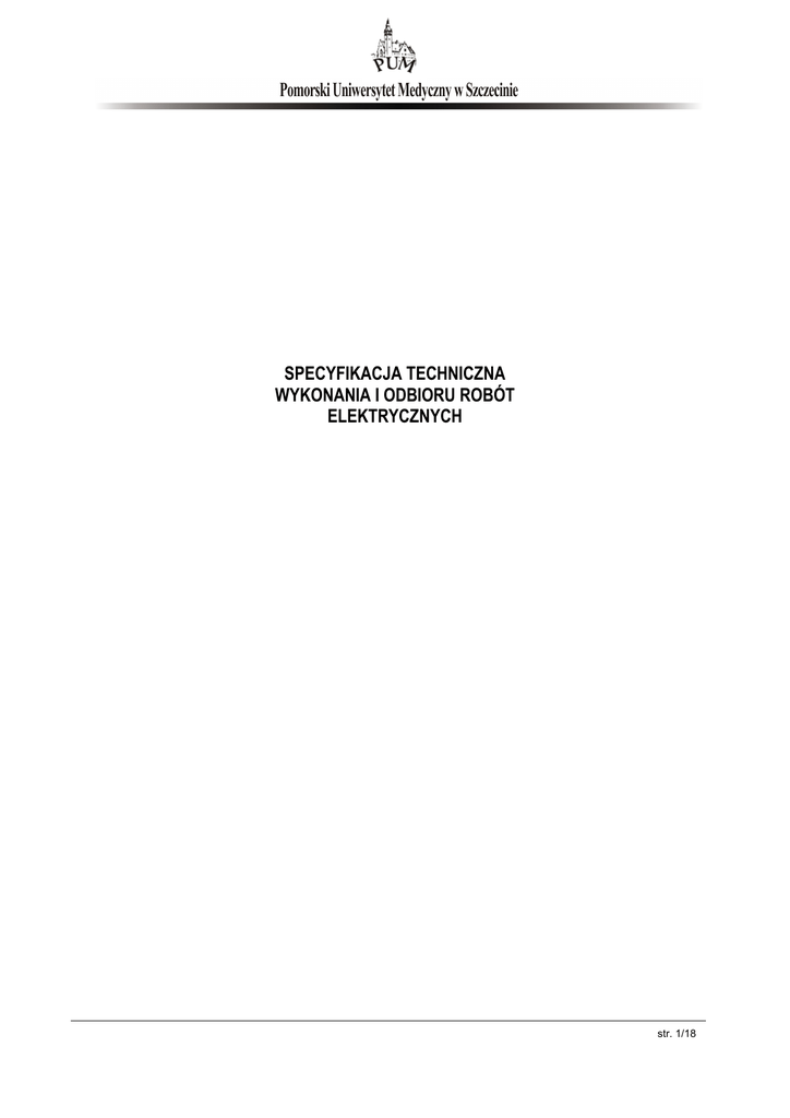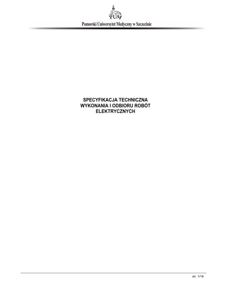 SPECYFIKACJA TECHNICZNA WYKONANIA I ODBIORU ROBÓT ELEKTRYCZNYCH str. 1/18 SPIS TREŚCI 1. Część ogólna 2. Właściwości wyrobów budowlanych 3. Wymagania szczegółowe dotyczące sprzętu i maszyn do robót budowlanych 4. Wymagania szczegółowe środków transportu 5. Wymagania dotyczące wykonania robót 6. Kontrola jakości robót 7. Odbiór robót 8. Przepisy związane z ST str. 2/18 1. CZĘŚĆ OGÓLNA 1.1. NAZWA ZAMÓWIENIA „Roboty w zakresie konserwacji, usuwania awarii, prac adaptacyjnych i drobnych remontów bieżących instalacji elektrycznych w jednostkach PUM na terenie Szczecina i Polic” 1.2. PRZEDMIOT ZAMÓWIENIA Przedmiotem zamówienia jest wykonywanie prac w zakresie konserwacji, usuwania awarii, prac adaptacyjnych i drobnych remontów bieżących instalacji elektrycznych w obiektach należących do Pomorskiego Uniwersytetu Medycznego. Poniżej podano wykaz budynków wraz z terenami przyległymi oraz pomieszczeń, w których wykonywany będzie przedmiot zamówienia, zakres prac, zasady wykonywania i odbioru prac wykonywanych przez pracowników Wykonawcy, wymagania dotyczące umiejętności oraz uprawnień zawodowych tych pracowników. 1.3. Zakres stosowania ST Specyfikacja Techniczna Wykonania i Odbioru Robót (ST) stanowi dokument przetargowy przy zlecaniu i realizacji robót wymienionych w pkt. 1.2. 1.4. Nazwy i kody robót budowlanych w zakresie objętym przedmiotem zamówienia CPV 50700000-2 Usługi w zakresie napraw i konserwacji instalacji budynkowych 1.5. WYKAZ BUDYNKÓW WRAZ Z TERENAMI PRZYLEGŁYMI ORAZ POMIESZCZEŃ, W KTÓRYCH WYKONYWANY BĘDZIE PRZEDMIOT ZAMÓWIENIA 1) Budynek Rektoratu PUM, Szczecin, ul. Rybacka 1, 2) Budynek PUM, Szczecin, ul. Podgórna 22/23, 3) Teren Samodzielnego Publicznego Szpitala Klinicznego nr 2 PUM, Szczecin, ul. Powstańców Wielkopolskich 72: − Budynek nr 1 , − Budynek nr 2 – z wyłączeniem przychodni szpitalnej na parterze, − Budynek nr 3 – z wyłączeniem pracowni szpitalnych na parterze i 1 piętrze, − Budynek nr 4, − Budynek nr 5, − Budynek nr 6, − Budynek nr 7, − Budynek nr 15, − Budynek nr 18, − Budynek nr 20, − Budynek nr 23 ”W” – część poddasza, − Budynek nr 32, − Budynek K – szatnia na parterze, część piętra I i II, całe piętro III, − Budynek Sali Kopernikańskiej wraz z zapleczem, − Budynek Międzywydziałowego Centrum Dydaktyki Nr 1 – budynek nowy na gwarancji, − Pawilon Działu Administracyjno Gospodarczego, − Stolarnia, − Magazyn odpadów medycznych. 4) Budynek PUM, Szczecin, ul. Ku Słońcu 12/13,5) Budynek Zakładu Biochemii i Żywienia Człowieka, Szczecin, ul. Broniewskiego 24, str. 3/18 6) Budynek Kliniki Psychiatrii, Szczecin, Broniewskiego 26 – sale dydaktyczne, laboratorium, sanitariaty (nie cały budynek), 7) Budynek WNoZ - Szczecin, ul. gen. D. Chłapowskiego 11, 8) Budynek Samodzielnego Publicznego Szpitala Klinicznego nr 1 PUM Oddział Police, ul. Siedlecka 2, Police - sale dydaktyczne z zapleczem sanitarno-socjalnym (nie cały budynek!), 9) Budynek Biblioteki Głównej, Szczecin, ul. Powstańców Wielkopolskich 20, 10) Budynek Hali Sportowej, Szczecin, ul. Dunikowskiego 6a, 11) Dom Studencki nr 3, Szczecin, ul. Dunikowskiego 2, 12) Dom Studencki nr 4, Szczecin, ul. Dunikowskiego 4, 13) Dom Studencki nr 5, Szczecin, ul. Dunikowskiego 6, 14) Baza Transportu PUM (19-22) wraz z całym terenem, Szczecin, ul. Wernyhory 15-17, - poza ryczałtem, tylko prace adaptacyjne i drobne remonty bieżące wykonywane na zlecenie Zamawiającego rozliczane kosztorysem powykonawczym 15) Budynek nr 8, Wydział Nauk o Zdrowiu, Szczecin, ul. Żołnierska 48, 16) Budynek Międzywydziałowego Centrum Dydaktyki Nr 2, Szczecin, ul. Żołnierska 54, 17) Budynek Pralni + kotłownia, Szczecin, ul. Wernyhory 15-17, - poza ryczałtem, tylko drobne prace adaptacyjne i drobne bieżące remonty wykonywane na zlecenie Zamawiającego rozliczane kosztorysem powykonawczym 18) Budynek dydaktyczny, Szczecin, ul. Piotra Skargi 15, 19) Teren Samodzielnego Publicznego Szpitala Klinicznego nr 1 PUM, Szczecin, ul. Unii Lubelskiej 1: − Budynek Zakładu Patomorfologii, − Budynek Główny - sale dydaktyczne wraz z komunikacją, biblioteka PUM, Sala Węgierki z szatnią (nie cały budynek), − Centrum Nowych Technologii Medycznych, Zamawiający zastrzega sobie możliwość rozszerzenia powyższego wykazu w przypadku pozyskania w trakcie trwania umowy dodatkowych pomieszczeń lub budynku, nie zmieniając przy tym kwoty ryczałtowej w złożonej ofercie Wykonawcy. 1.6. ZASADY WYKONYWANIA PRAC W RAMACH RYCZAŁTU 1) Wykonawca zapewnia całodobowy dyżur min dwóch osób, konieczny do należytego wykonania przedmiotu zamówienia; 2) Osoby wskazane przez Wykonawcę do realizacji przedmiotu zamówienia muszą posiadać telefony zapewniające całodobową możliwość zgłoszenia awarii; 3) Wykonawca zobowiązany jest do wykonania każdego zadania w ramach przedmiotu umowy (prace konserwacyjne ) w nieprzekraczalnym terminie do 24 godzin od zgłoszenia; 4) W sytuacjach, kiedy prace konserwacyjne wykonywane w ramach umowy zryczałtowanej mają wpływ na prawidłowe funkcjonowanie uczelni należy je wykonać w ciągu 2 godzin od zgłoszenia; 5) W sytuacjach awaryjnych, których skutkiem jest zagrożenie życia i zdrowia ludzi lub degradacja mienia Zamawiającego Wykonawca zobowiązuje się w ramach umowy do podjęcia czynności zabezpieczających w nieprzekraczalnym terminie 2 godziny od zgłoszenia; 6) Wykonawca realizując prace będące w zakresie konserwacji i napraw jest zobowiązany wykonywać nieodpłatnie niezbędne próby i pomiary zgodnie z obowiązującymi przepisami (bez pomiarów okresowych). Protokoły z prób i pomiarów należy każdorazowo dostarczyć Zamawiającemu; 7) Wykonawca zapewnia materiały i urządzenia konieczne do prawidłowego wykonania niezbędnych prac stanowiących zakres Umowy na koszt Zamawiającego (z wyłączeniem materiałów wskazanych w punkcie 8); 8) Z