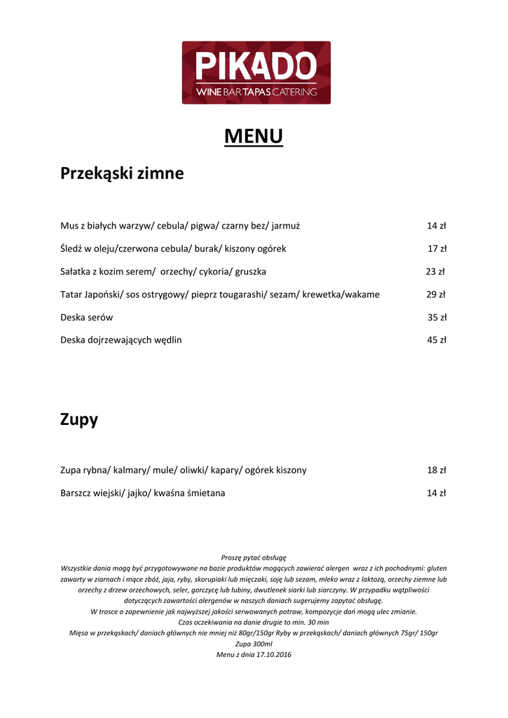 MENU Przekąski zimne Mus z białych warzyw/ cebula/ pigwa/ czarny bez/ jarmuż 14 zł Śledź w oleju/czerwona cebula/ burak/ kiszony ogórek 17 zł Sałatka z kozim serem/ orzechy/ cykoria/ gruszka 23 zł Tatar Japoński/ sos ostrygowy/ pieprz tougarashi/ sezam/ krewetka/wakame 29 zł Deska serów 35 zł Deska dojrzewających wędlin 45 zł Zupy Zupa rybna/ kalmary/ mule/ oliwki/ kapary/ ogórek kiszony 18 zł Barszcz wiejski/ jajko/ kwaśna śmietana 14 zł Proszę pytać obsługę Wszystkie dania mogą być przygotowywane na bazie produktów mogących zawierać alergen wraz z ich pochodnymi: gluten zawarty w ziarnach i mące zbóż, jaja, ryby, skorupiaki lub mięczaki, soję lub sezam, mleko wraz z laktozą, orzechy ziemne lub orzechy z drzew orzechowych, seler, gorczycę lub łubiny, dwutlenek siarki lub siarczyny. W przypadku wątpliwości dotyczących zawartości alergenów w naszych daniach sugerujemy zapytać obsługę. W trosce o zapewnienie jak najwyższej jakości serwowanych potraw, kompozycje dań mogą ulec zmianie. Czas oczekiwania na danie drugie to min. 30 min Mięsa w przekąskach/ daniach głównych nie mniej niż 80gr/150gr Ryby w przekąskach/ daniach głównych 75gr/ 150gr Zupa 300ml Menu z dnia 17.10.2016 Dania główne Risotto / dynia/ ricotta/ pestki dyni/ figa/ gruszka 26 zł Pół kaczki / szara reneta/ modra kapusta/ ziemniaki z rozmarynem 42 zł Ryby Ryba dnia – zapytaj obsługę Sandacz/ pęczak/ jabłko/ burak/ sos holenderski od 35 zł 41 zł Steki Antrykot sezonowany / ziemniaki/ warzywa 18 zł/ 100g Rostbef sezonowany / ziemniaki/ warzywa 19 zł/ 100g Polędwica wołowa sezonowana / ziemniaki/ warzywa 27 zł/ 100g Desery Crumble owocowe/ orzechy/ śliwka/ gruszka/ rodzynki 14 zł Tort bezowy/ mus truskawkowy/ baileys/ bita śmietana 16 zł Rolada z kajmakiem/ metaxa/ suszone owoce/ orzechy 13 zł