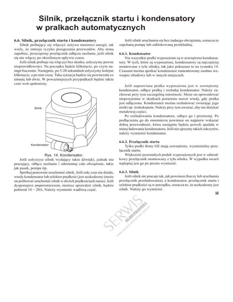 Silnik, przełącznik startu i kondensatory w pralkach automatycznych 6.6. Silnik, przełącznik startu i kondensatory Jeśli silnik uruchamia się bez żadnego obciążenia, oznacza to zapchaną pompę lub zablokowaną przekładnię. Silnik próbujący się włączyć zużywa mnóstwo energii, tak wiele, że istnieje ryzyko przegrzania przewodów. Aby temu zapobiec, przeciążony przełącznik odłącza zasilanie, jeśli silnik się nie włączy po określonym upływie czasu. Jeśli silnik próbuje się włączyć bez skutku, usłyszymy pewne nieprawidłowości. Na początku będzie kliknięcie, po czym nastąpi buczenie. Następnie, po 5-20 sekundach usłyszymy kolejne kliknięcie, a po nim ciszę. Taka sytuacja będzie się powtarzała co minutę lub dwie. W poważniejszych przypadkach będzie także czuć woń spalenizny. 6.6.1. Kondensator Nie wszystkie pralki wyposażone są w zewnętrzne kondensatory. W tych, które są wyposażone, kondensatory są najczęściej montowane z tyłu silnika, tak jako pokazano to na rysunku 14. Czasami można spotkać kondensator zamontowany osobno wewnątrz obudowy lub w innych miejscach. Jeśli naprawiana pralka wyposażona jest w zewnętrzny kondensator, odłącz pralkę i rozładuj kondensator. Należy zachować przy tym szczególną ostrożność. Może on spowodować nieprzyjemne w skutkach porażenie nawet wtedy, gdy pralka jest odłączona. Kondensator można rozładować zwierając jego nóżki np. śrubokrętem. Należy przy tym uważać, aby nie dotykać metalowej części. Po rozładowaniu kondensatora, odłącz go i przetestuj. Po podłączeniu go do omomierza powinien on najpierw wskazać dobrą przewodność, która następnie będzie powoli spadała w miarę ładowania kondensatora. Jeśli nie ujrzymy takich odczytów, należy wymienić kondensator. Silnik 6.6.2. Przełącznik startu Tylko pralki firmy GE mają zewnętrzny, wymienialny przełącznik startu. Większość pozostałych pralek wyposażonych jest w odśrodkowy przełącznik montowany z tyłu silnika. W wypadku awarii najlepiej jest go po prostu wymienić. Kondensator Rys. 14. Kondensator. Jeśli usłyszysz silnik wydający takie dźwięki, jednak nie pracujący, odłącz zasilanie i zdemontuj całe obciążenie, takie jak pasek, pompa itp. Spróbuj ponownie uruchomić silnik. Jeśli cały czas nie działa, wtedy kondensator lub selektor prędkości jest uszkodzony (może on próbować uruchomić silnik w dwóch prędkościach naraz). Jeśli dysponujesz amperomierzem, możesz sprawdzić silnik, będzie pobierał 10 ÷ 20A. Należy wymienić wadliwą część. LE E le -e is w er w .s w w kt K T ro R ni O ki N .c om IK .p I l 6.6.3. Silnik Jeśli silnik nie pracuje tak, jak powinien (buczy lub uruchamia przełącznik przeładowania), a kondensator, przełącznik startu i selektor prędkości są w porządku, oznacza to, że uszkodzony jest silnik. Należy go wymienić. }