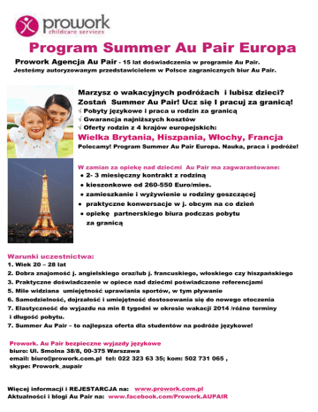 Program Summer Au Pair Europa Prowork Agencja Au Pair - 15 lat doświadczenia w programie Au Pair. Jesteśmy autoryzowanym przedstawicielem w Polsce zagranicznych biur Au Pair. Marzysz o wakacyjnych podróżach i lubisz dzieci? Zostań Summer Au Pair! Ucz się I pracuj za granicą! √ Pobyty językowe i praca u rodzin za granicą √ Gwarancja najniższych kosztów √ Oferty rodzin z 4 krajów europejskich: Wielka Brytania, Hiszpania, Włochy, Francja Polecamy! Program Summer Au Pair Europa. Nauka, praca i podróże! W zamian za opiekę nad dziećmi Au Pair ma zagwarantowane: ● 2- 3 miesięczny kontrakt z rodziną ● kieszonkowe od 260-550 Euro/mies. ● zamieszkanie i wyżywienie u rodziny goszczącej ● praktyczne konwersacje w j. obcym na co dzień ● opiekę partnerskiego biura podczas pobytu za granicą Warunki uczestnictwa: 1. Wiek 20 – 28 lat 2. Dobra znajomość j. angielskiego oraz/lub j. francuskiego, włoskiego czy hiszpańskiego 3. Praktyczne doświadczenie w opiece nad dziećmi poświadczone referencjami 5. Mile widziana umiejętność uprawiania sportów, w tym pływanie 6. Samodzielność, dojrzałość i umiejętność dostosowania się do nowego otoczenia 7. Elastyczność do wyjazdu na min 8 tygodni w okresie wakacji 2014 /różne terminy i długość pobytu. 7. Summer Au Pair – to najlepsza oferta dla studentów na podróże językowe! Prowork. Au Pair bezpieczne wyjazdy językowe biuro: Ul. Smolna 38/8, 00-375 Warszawa email: [email protected] tel: 022 323 63 35; kom: 502 731 065 , skype: Prowork_aupair Więcej informacji i REJESTARCJA na: www.prowork.com.pl Aktualności i blogi Au Pair na: www.facebook.com/Prowork.AUPAIR