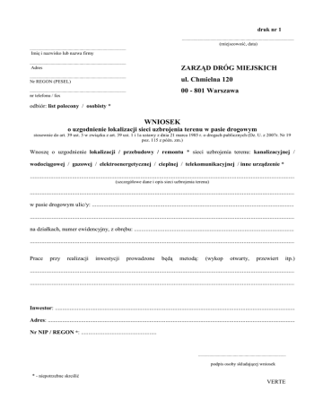 druk nr 1 .......................................................................................................... (miejscowość, data) ........................................................................................... Imię i nazwisko lub nazwa firmy ........................................................................................... Adres ZARZĄD DRÓG MIEJSKICH ........................................................................................... Nr REGON (PESEL) ul. Chmielna 120 ........................................................................................... 00 - 801 Warszawa nr telefonu / fax odbiór: list polecony / osobisty * WNIOSEK o uzgodnienie lokalizacji sieci uzbrojenia terenu w pasie drogowym stosownie do art. 39 ust. 3 w związku z art. 39 ust. 1 i 1a ustawy z dnia 21 marca 1985 r. o drogach publicznych (Dz. U. z 2007r. Nr 19 poz. 115 z późn. zm.) Wnoszę o uzgodnienie lokalizacji / przebudowy / remontu * sieci uzbrojenia terenu: kanalizacyjnej / wodociągowej / gazowej / elektroenergetycznej / cieplnej / telekomunikacyjnej / inne urządzenie * ...................................................................................................................................................................................... (szczegółowe dane i opis sieci uzbrojenia terenu) ...................................................................................................................................................................................... w pasie drogowym ulic/y: ........................................................................................................................................... ...................................................................................................................................................................................... na działkach, numer ewidencyjny, z obrębu: .............................................................................................................. ...................................................................................................................................................................................... Prace przy realizacji inwestycji prowadzone będą metodą: (wykop otwarty, przewiert itp.) ...................................................................................................................................................................................... ...................................................................................................................................................................................... Inwestor: ..................................................................................................................................................................... Adres: .......................................................................................................................................................................... Nr NIP / REGON *: .................................................... ................................................................................... podpis osoby składającej wniosek * - niepotrzebne skreślić VERTE ZAŁĄCZNIKI: 1. Opinia ZUDP Nr. ................................z dnia .................................wraz z czytelnym załącznikiem mapowym. * 2. Wyrys i wypis z ewidencji gruntów z naniesioną wnioskowaną siecią uzbrojenia terenu. 3. Decyzję o warunkach zabudowy lub decyzję o lokalizacji inwestycji celu publicznego (w przypadku braku obowiązującego Miejscowego Planu Zagospodarowania Przestrzennego). * 4. Przekrój poprzeczny przez pas drogowy przedstawiający lokalizację projektowanej lub istniejącej sieci uzbrojenia terenu (w przypadku przejścia pod jezdnią projekt przekraczania jezdni). 5. Warunki techniczne przyłączenia wydane przez gestora sieci uzbrojenia terenu. * 6. Aktualna na dzień składania wniosku, potwierdzona za zgodność z oryginałem kopia odpisu aktualnego z Rejestru Przedsiębiorców (KRS Wnioskodawcy) – w przypadku, gdy wnioskodawca jest przedsiębiorcą. * 7. Pełnomocnictwo udzielone przez inwestora do reprezentowania go przez osobę trzecią w sprawach związanych z uzyskaniem zezwolenia na lokalizację urządzenia infrastruktury technicznej w pasie drogowym. Zgodnie z art. 1 ust. 1 pkt. 1 lit. A w związku z częścią IV załącznika do ustawy z dnia 16 listopada 2006 r. o opłacie skarbowej (Dz. U. z 2006 r. Nr 225 poz. 1635 z późn. zm.) od złoŜonego dokumentu stwierdzającego udzielenie pełnomocnictwa lub prokury oraz jego odpis, wypis lub kopia – od kaŜdego stosunku pełnomocnictwa (prokury) pobierana jest opłata skarbowa w wysokości 17,00 zł. Zgodnie z częścią II załącznika do ustawy o opłacie skarbowej podlega opłacie skarbowej w wysokości 5,00 zł. poświadczenie zgodności duplikatu, odpisu, wyciągu wypisu lub kopii, dokonane przez organy administracji rządowej lub samorządowej lub archiwum państwowe, od kaŜdej pełnej lub zaczętej stronicy (w przypadku złoŜenia odpisu /wypisu/ lub kopii pełnomocnictwa naleŜy okazać jego oryginał celem poświadczenia za zgodność). Opłatę skarbową moŜna uiścić gotówką w kasie Zarządu Dróg Miejskich, ul. Chmielna 120 lub bezgotówkowo na rachunek Banku Handlowego S.A. w Warszawie nr 54 1030 1508 0000 0005 5003 6045. * 8. inne: ................................................................................................................................................................................. * - niepotrzebne skreślić. ZaleŜnie od charakteru zamierzonej inwestycji i potrzeb związanych z wydaniem decyzji deklaruję gotowość złoŜenia dodatkowych dokumentów lub informacji. Składane załączniki muszą być podpisane przez wnioskodawcę. Zgodnie z art. 23 ust. 1 ustawy z dnia 29 sierpnia 1997 r. o ochronie danych osobowych (tekst jednolity Dz. U. z 2002 r.