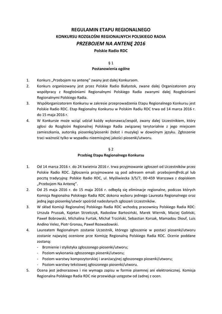 REGULAMIN ETAPU REGIONALNEGO KONKURSU ROZGŁOŚNI REGIONALNYCH POLSKIEGO RADIA PRZEBOJEM NA ANTENĘ 2016 Polskie Radio RDC §1 Postanowienia ogólne 1. 2. 3. 4. Konkurs „Przebojem na antenę” zwany jest dalej Konkursem. Konkurs organizowany jest przez Polskie Radio Białystok, zwane dalej Organizatorem przy współpracy z Rozgłośniami Regionalnymi Polskiego Radia zwanymi dalej Rozgłośniami Regionalnymi Polskiego Radia. Współorganizatorem Konkursu w zakresie przeprowadzenia Etapu Regionalnego Konkursu jest Polskie Radio RDC. Etap Regionalny Konkursu w Polskim Radiu RDC trwa od 14 marca 2016 r. do 15 maja 2016 r. W Konkursie może wziąd udział każdy wykonawca/zespół, zwany dalej Uczestnikiem, który zgłosi do Rozgłośni Regionalnej Polskiego Radia związanej terytorialnie z jego miejscem zamieszkania, autorską piosenkę/piosenki (tekst i muzykę) w dowolnym języku. Zgłoszenie traci ważnośd tylko w wypadku nieemisyjnej jakości piosenki/utworu. §2 Przebieg Etapu Regionalnego Konkursu 1. 2. 3. 4. 5. Od 14 marca 2016 r. do 24 kwietnia 2016 r. trwa przyjmowanie zgłoszeo od Uczestników przez Polskie Radio RDC. Zgłoszenia przyjmowane są pod adresem email: [email protected] lub pocztą tradycyjną: Polskie Radio RDC, ul. Myśliwiecka 3/5/7, 00-459 Warszawa z dopiskiem „Przebojem Na Antenę”. Od 25 maja 2016 r. do 15 maja 2016 r. odbędą się eliminacje regionalne, podczas których Komisja Regionalna Polskiego Radia RDC dokona wyboru jednego Laureata Regionalnego oraz jedną jego piosenkę/utwór spośród nadesłanych zgłoszeo Uczestników. W skład Komisji Regionalnej Polskiego Radia RDC wchodzą pracownicy Polskiego Radia RDC: Urszula Prussak, Kajetan Strzelczyk, Radosław Bartosioski, Marek Wiernik, Maciej Golioski, Paweł Bobrowski, Michalina Furtak, Michał Trzcioski, Sebastian Korsak, Mamadou Diouf, Luis Andino Velez, Piotr Gronau, Paweł Rozwadowski. Laureatem Regionalnym zostanie Uczestnik, którego zgłoszenie w postaci piosenki/utworu zostanie najwyżej ocenione prze Komisję Regionalną Polskiego Radia RDC. Ocenie poddane zostaną: - Brzmienie i stylistyka zgłoszonego piosenki/utworu; - Poziom wykonania zgłoszonego piosenki/utworu; - Poziom warstwy kompozytorskiej i aranżacyjnej zgłoszonego piosenki/utworu; - Poziom warstwy tekstowej zgłoszonego piosenki/utworu. Ocena jest jednorazowa i nie wymaga zapisu w formie pisemnej ani elektronicznej. Komisja Regionalna Polskiego Radia RDC nie przewiduje ustępstw od żadnej z ocen. 6. Wybrany Laureat Regionalny przechodzi do Etapu Ogólnopolskiego Konkursu i będzie reprezentował Polskie Radio RDC podczas Finału Konkursu. Przebieg Etapu Ogólnopolskiego Konkursu reguluje Regulamin Ogólny Konkursu. §3 Obowiązki i prawa Uczestnika 1. 2. 3. 4. 5. 6. Zgłoszenie się wykonawcy/zespołu do udziału w Konkursie oznacza, że akceptuje on Regulamin Etapu Regionalnego Konkursu oraz Regulamin Ogólny Konkursu. Wykonawca może nadesład swoje zgłoszenie tylko do jednej Rozgłośni Regionalnej Polskiego Radia. Termin nadsyłania piosenek/utworów mija 24 kwietnia 2016 r. (w przypadku zgłoszeo nadesłanych pocztą tradycyjną decyduje data stempla pocztowego). Wraz z piosenką/utworem należy dostarczyd: 4.1. Wypełniony Załącznik nr 1 Regulaminu Ogólnego Konkursu zawierający tytuł piosenki/utworu, dane personalne autora tekstu, muzyki, wykonawców oraz wskazanie osoby do kontaktu. 4.2. Wypełniony Załącznik nr 2 Regulaminu Ogólnego Konkursu zawierający oświadczenia autora muzyki i tekstu o udzieleniu na rzecz Organizatora i Rozgłośni Regionalnych Polskiego Radia i Polskiego Radia RDC licencji na wykorzystanie piosenki/utworu w związku z udziałem w Konkursie na następujących polach eksploatacji: 4.2.1. publiczne odtworzenie, 4.2.2. wielokrotne nadawanie za pomocą fonii przewodowej i bezprzewodowej, 4.2.3. rejestracja oraz emisja w systemie przewodowym, bezprzewodowym, w Internecie oraz przez satelitę, prawo do utrwalenia utworu na dostępnych w radiu środkach technicznych, w tym również do wprowadzenia do pamięci komputera, 4.2.4. umieszczenie utworów w Internecie z prawem do wielokrotnego odtworzenia, 4.2.5. wykorzystanie utworu do celów reklamy, promocji, oznaczenia lub identyfikacji Rozgłośni Regionalnych Polskiego Radia, jego programów audycji, wydawnictw i publikacji, 4.2.6. wprowadzenie do obrotu na rzecz innych stacji radiowych, 4.2.7. zwielokrotnianie drukiem lub techniką cyfrową, 4.2.8. zwielokrotnienie i wyprodukowanie do obiegu na nośnikach CD i DVD Uczestnik udziela Organizatorowi i Rozgłośniom Regionalnym Polskiego Radia, w tym Polskiemu Radiu RDC, nieodpłatnej licencji na wykorzystanie zgłoszonej piosenki/utworu w zakresie praw pokrewnych (wykonawczych) w związku z udziałem w Konkursie na polach eksploatacji wymienionych w pkt. 4.2. W tym celu wraz z piosenką/utworem składa oświadczenie w tym przedmiocie. Uczestnik wyraża zgodę na wykorzystanie swojego wizerunku do celów reklamy, promocji, oznaczenia lub identyfikacji Rozgłośni Regionalnych Polskiego Radia, ich programów, audycji, wydawnictw i publikacji. 7. 8. 9. 10. 11. 12. 13. 14. 15. 1. 2. 3. Laureat Regionalny zobowiązany jest do uczestnictwa w próbach do finału w sobotę 25 czerwca 2016 r. oraz w finale Konkursu w niedzielę 26 czerwca 2016 r. i wykonad zgłoszoną i wybraną do Konkursu piosenkę/utwór. Laureat Regionalny zobowiązany jest do dostarczenia piosenki/utworu do Rozgłośni Regionalnej Polskiego Radia, której jest reprezentantem, tj. do Polskiego Radia RDC. Przystąpienie do Konkursu jest równoznaczne z wyrażeniem zgody Uczestnika Konkursu na podanie do publicznej wiadomości jego danych osobowych. Uczestnik Konkursu oświadcza także, że wyraża zgodę na opublikowanie jego danych osobowych zgodnie z ustawę z dnia 29 sierpnia 1997 r. o ochronie danych osobowych (tj. z dnia 17 czerwca 2002 r. Dz. U. z 2002 r. Nr 101 poz. 926 z późn. zm.). Polskie Radio RDC oświadcza, że pod