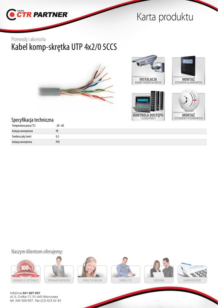 Przewody i akcesoria Kabel komp-skrętka UTP 4x2/0 5CCS INSTALACJA KAMER PRZEMYSŁOWYCH KONTROLA DOSTĘPU I CZASU PRACY Specyfikacja techniczna Temperatura pracy [°C] -20 - 60 Izolacja wewnętrzna PE Średnica żyły [mm] 0,5 Izolacja zewnętrzna PVC MONTAŻ SYSTEMÓW ALARMOWYCH MONTAŻ SYSTEMÓW P.POŻAROWYCH Naszym klientom oferujemy: GWARANCJA SATYSFAKCJI PROGRAM PARTNERSKI POMOC TECHNICZNA SERWIS CCTV SZKOLENIA GENERATOR OFERT
