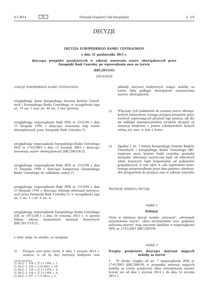 PL 8.1.2014 Dziennik Urzędowy Unii Europejskiej L 3/9 DECYZJE DECYZJA EUROPEJSKIEGO BANKU CENTRALNEGO z dnia 22 października 2013 r. dotycząca przepisów przejściowych w zakresie stosowania rezerw obowiązkowych przez Europejski Bank Centralny po wprowadzeniu euro na Łotwie (EBC/2013/41) (2014/4/UE) oddziały instytucji kredytowych mające siedzibę na Łotwie będą podlegać obowiązkowi utrzymywania rezerwy obowiązkowej. ZARZĄD EUROPEJSKIEGO BANKU CENTRALNEGO, uwzględniając Statut Europejskiego Systemu Banków Central nych i Europejskiego Banku Centralnego, w szczególności jego art. 19 ust. 1 oraz art. 46 ust. 2 tiret pierwsze, (2) Włączenie tych podmiotów do systemu rezerw obowiąz kowych Eurosystemu wymaga przyjęcia przepisów przej ściowych zapewniających płynność tego procesu, tak aby nie nakładać nieproporcjonalnie wysokich obciążeń na instytucje kredytowe z państw członkowskich, których walutą jest euro, w tym z Łotwy. (3) Zgodnie z art. 5 Statutu Europejskiego Systemu Banków Centralnych i Europejskiego Banku Centralnego EBC, wspierany przez krajowe banki centralne, gromadzi niezbędne informacje statystyczne bądź od właściwych władz krajowych, bądź bezpośrednio od podmiotów gospodarczych, w tym także w celu zapewnienia termi nowego przeprowadzenia przez dane państwo członkow skie przygotowań do przyjęcia euro w zakresie statystyki, uwzględniając rozporządzenie Rady (WE) nr 2531/98 z dnia 23 listopada 1998 r. dotyczące stosowania stóp rezerw obowiązkowych przez Europejski Bank Centralny (1), uwzględniając rozporządzenie Europejskiego Banku Centralnego (WE) nr 1745/2003 z dnia 12 września 2003 r. dotyczące stosowania rezerw obowiązkowych (EBC/2003/9) (2), uwzględniając rozporządzenie Rady (WE) nr 2532/98 z dnia 23 listopada 1998 r. dotyczące kompetencji Europejskiego Banku Centralnego do nakładania sankcji (3), uwzględniając rozporządzenie Rady (WE) nr 2533/98 z dnia 23 listopada 1998 r. dotyczące zbierania informacji statystycz nych przez Europejski Bank Centralny (4), w szczególności jego art. 5 ust. 1 i art. 6 ust. 4, PRZYJMUJE NINIEJSZĄ DECYZJĘ: Artykuł 1 uwzględniając rozporządzenie Europejskiego Banku Centralnego (UE) nr 1071/2013 z dnia 24 września 2013 r. w sprawie bilansu sektora monetarnych instytucji finansowych (EBC/2013/33) (5), Definicje Użyte w niniejszej decyzji terminy „instytucja”, „obowiązek utrzymywania rezerw”, „okres utrzymywania” oraz „podstawa naliczania rezerwy” mają znaczenie określone w rozporządzeniu (WE) nr 1745/2003 (EBC/2003/9). a także mając na uwadze, co następuje: Artykuł 2 (1) (1 ) (2 ) (3 ) (4 ) (5 ) Przyjęcie euro przez Łotwę w dniu 1 stycznia 2014 r. oznacza, iż od tej daty instytucje kredytowe oraz Dz.U. Dz.U. Dz.U. Dz.U. Dz.U. L L L L L 318 250 318 318 297 z z z z z 27.11.1998, s. 1. 2.10.2003, s. 10. 27.11.1998, s. 4. 27.11.1998, s. 8. 7.11.2013, s. 1. Przepisy przejściowe dotyczące instytucji siedzibę na Łotwie mających 1. W drodze wyjątku od art. 7 rozporządzenia (WE) nr 1745/2003 (EBC/2003/9) w przypadku instytucji mających siedzibę na Łotwie przejściowy okres utrzymywania rezerwy liczony jest od dnia 1 stycznia 2014 r. do dnia 14 stycznia 2014 r. L 3/10 PL Dziennik Urzędowy Unii Europejskiej 2. Podstawa naliczania rezerwy za przejściowy okres utrzy mywania rezerwy zostanie określona dla każdej instytucji mającej siedzibę na Łotwie w oparciu o składniki bilansu danej instytucji na dzień 31 października 2013 r. Instytucje mające siedzibę na Łotwie zgłaszają Latvijas Banka swoją podstawę naliczania rezerwy zgodnie z zasadami EBC dotyczą cymi sprawozdawczości w zakresie statystyki pieniężnej i bankowej określonymi w rozporządzeniu (UE) nr 1071/2013 (EBC/2013/33). Instytucje mające siedzibę na Łotwie, które korzystają z wyłączenia przewidzianego w art. 8 ust. 1 rozporządzenia (UE) nr 1071/2013 (EBC/2013/33), obliczają podstawę naliczania rezerwy za przejściowy okres utrzymy wania rezerwy na podstawie swojego bilansu sporządzonego na dzień 30 września 2013 r. 3. W zakresie dotyczącym przejściowego okresu utrzymy wania rezerwy rezerwa obowiązkowa instytucji mającej siedzibę na Łotwie naliczana jest przez tę instytucję bądź przez Latvijas Banka. Strona naliczająca rezerwę obowiązkową przekazuje dokonane obliczenia drugiej stronie, pozostawiając jej odpo wiednią ilość czasu na sprawdzenie obliczeń i wniesienie popra wek. Naliczona rezerwa obowiązkowa, z uwzględnieniem nanie sionych poprawek, podlega zatwierdzeniu przez obydwie strony w terminie do dnia 10 grudnia 2013 r. Jeżeli do dnia 10 grudnia 2013 r. strona zawiadomiona o naliczeniu nie potwierdzi wyso kości rezerwy obowiązkowej, przyjmuje się, że uznaje ona zastosowanie naliczonej wysokości w przejściowym okresie utrzymywania rezerwy. 4. Postanowienia art. 3 ust. 2–4 stosuje się odpowiednio do instytucji mających siedzibę na Łotwie, tak by w początkowych okresach utrzymywania rezerwy instytucje te mogły pomniej szyć podstawę naliczania rezerwy o kwotę wszelkich zobo wiązań w stosunku do instytucji mających siedzibę na Łotwie, mimo że w momencie naliczenia rezerwy obowiązkowej insty tucje takie nie będą znajdowały się na liście instytucji podlega jących obowiązkowi utrzymywania rezerwy wskazanemu w art. 2 ust. 3 rozporządzenia (WE) nr 1745/2003 (EBC/2003/9). Artykuł 3 Przepisy przejściowe dotyczące instytucji z siedzibą w innych państwach członkowskich, których walutą jest euro 1. Istnienie przejściowego okresu utrzymywania rezerwy w stosunku do instytucji mających siedzibę na Łotwie nie uchybia okresowi utrzymywania rezerwy mającemu zastoso wanie zgodnie z art. 7 rozporządzenia (WE) nr 1745/2003 (EBC/2003/9) do instytucji mających siedzibę w innych państwach członkowskich, których walutą jest euro. 2. Instytucje mające siedzibę w innych państwach członkow skich, k