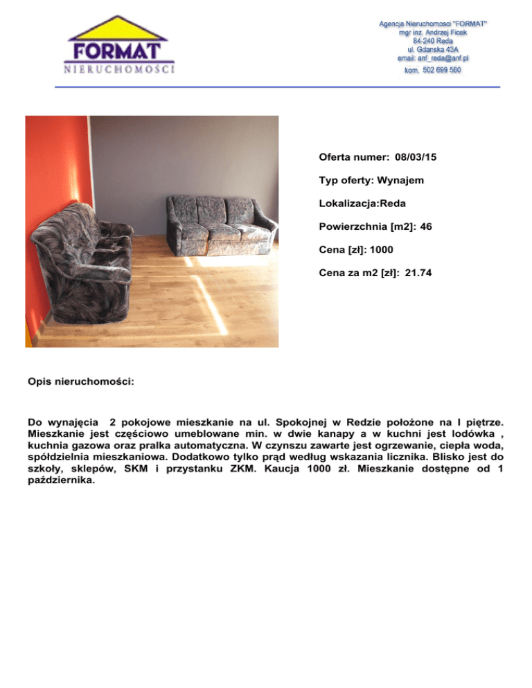 Oferta numer: 08/03/15 Typ oferty: Wynajem Lokalizacja:Reda Powierzchnia [m2]: 46 Cena [zł]: 1000 Cena za m2 [zł]: 21.74 Opis nieruchomości: Do wynajęcia 2 pokojowe mieszkanie na ul. Spokojnej w Redzie położone na I piętrze. Mieszkanie jest częściowo umeblowane min. w dwie kanapy a w kuchni jest lodówka , kuchnia gazowa oraz pralka automatyczna. W czynszu zawarte jest ogrzewanie, ciepła woda, spółdzielnia mieszkaniowa. Dodatkowo tylko prąd według wskazania licznika. Blisko jest do szkoły, sklepów, SKM i przystanku ZKM. Kaucja 1000 zł. Mieszkanie dostępne od 1 października.