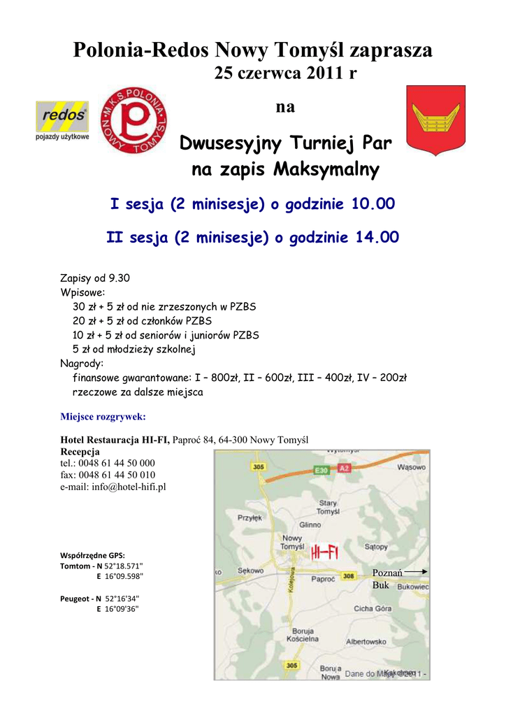Polonia-Redos Nowy Tomyśl zaprasza 25 czerwca 2011 r na Dwusesyjny Turniej Par na zapis Maksymalny I sesja (2 minisesje) o godzinie 10.00 II sesja (2 minisesje) o godzinie 14.00 Zapisy od 9.30 Wpisowe: 30 zł + 5 zł od nie zrzeszonych w PZBS 20 zł + 5 zł od członków PZBS 10 zł + 5 zł od seniorów i juniorów PZBS 5 zł od młodzieŜy szkolnej Nagrody: finansowe gwarantowane: I – 800zł, II – 600zł, III – 400zł, IV – 200zł rzeczowe za dalsze miejsca Miejsce rozgrywek: Hotel Restauracja HI-FI, Paproć 84, 64-300 Nowy Tomyśl Recepcja tel.: 0048 61 44 50 000 fax: 0048 61 44 50 010 e-mail: [email protected] Współrzędne GPS: Tomtom - N 52°18.571" E 16°09.598" Peugeot - N 52°16'34" E 16°09'36" Poznań Buk