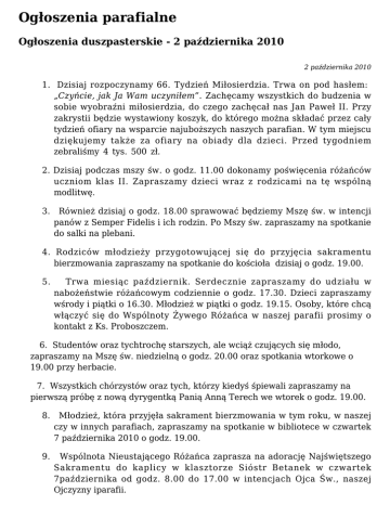 Ogłoszenia parafialne Ogłoszenia duszpasterskie - 2 października 2010 2 października 2010 1. Dzisiaj rozpoczynamy 66. Tydzień Miłosierdzia. Trwa on pod hasłem: „Czyńcie, jak Ja Wam uczyniłem”. Zachęcamy wszystkich do budzenia w sobie wyobraźni miłosierdzia, do czego zachęcał nas Jan Paweł II. Przy zakrystii będzie wystawiony koszyk, do którego można składać przez cały tydzień ofiary na wsparcie najuboższych naszych parafian. W tym miejscu dziękujemy także za ofiary na obiady dla dzieci. Przed tygodniem zebraliśmy 4 tys. 500 zł. 2. Dzisiaj podczas mszy św. o godz. 11.00 dokonamy poświęcenia różańców uczniom klas II. Zapraszamy dzieci wraz z rodzicami na tę wspólną modlitwę. 3. Również dzisiaj o godz. 18.00 sprawować będziemy Mszę św. w intencji panów z Semper Fidelis i ich rodzin. Po Mszy św. zapraszamy na spotkanie do salki na plebani. 4. Rodziców młodzieży przygotowującej się do przyjęcia sakramentu bierzmowania zapraszamy na spotkanie do kościoła dzisiaj o godz. 19.00. 5. Trwa miesiąc październik. Serdecznie zapraszamy do udziału w nabożeństwie różańcowym codziennie o godz. 17.30. Dzieci zapraszamy wśrody i piątki o 16.30. Młodzież w piątki o godz. 19.15. Osoby, które chcą włączyć się do Wspólnoty Żywego Różańca w naszej parafii prosimy o kontakt z Ks. Proboszczem. 6. Studentów oraz tychtrochę starszych, ale wciąż czujących się młodo, zapraszamy na Mszę św. niedzielną o godz. 20.00 oraz spotkania wtorkowe o 19.00 przy herbacie. 7. Wszystkich chórzystów oraz tych, którzy kiedyś śpiewali zapraszamy na pierwszą próbę z nową dyrygentką Panią Anną Terech we wtorek o godz. 19.00. 8. Młodzież, która przyjęła sakrament bierzmowania w tym roku, w naszej czy w innych parafiach, zapraszamy na spotkanie w bibliotece w czwartek 7 października 2010 o godz. 19.00. 9. Wspólnota Nieustającego Różańca zaprasza na adorację Najświętszego Sakramentu do kaplicy w klasztorze Sióstr Betanek w czwartek 7października od godz. 8.00 do 17.00 w intencjach Ojca Św., naszej Ojczyzny iparafii. 10. W najbliższy czwartek przypada pierwszy czwartek miesiąca. Podczas różańca modlić się będziemy o liczne i święte powołania kapłańskie i zakonne. 11. Eucharystyczny Ruch Młodych zaprasza na jesienny Dzień Wspólnoty, który odbędzie się w naszej parafii w sobotę 9 października. Początek o godz. 10.00. 12. Po wakacyjnej przerwie wznawiamy działalność Uniwersytetu Biblijnego dla Dzieci. Wszystkich dotychczasowych słuchaczy, jak i nowych adeptów pragnących zgłębiać tajniki słowa Bożego, zapraszamy na spotkanie w przyszłą niedzielę, 10 października o godz. 10.00 do biblioteki parafialnej. 13. W przyszłą niedzielę obchodzić będziemy w Kościele Polskim dzień wspólnotowej refleksji nad dziełem, którego dokonał w czasie swojego pontyfikatu nasz rodak czyli tzw.DZIEŃ PAPIESKI. Hasłem tegorocznego dnia jest zawołanie „Jan Paweł II – odwaga świętości”. Przy wyjściu z Kościoła będzie można złożyć ofiarę na stypendia dla dzieci i młodzieży przyznawane przez Fundację Dzieło Nowego Tysiąclecia. O 21.00 odprawimy Apel Jasnogórski połączony z czuwaniem modlitewnym. W przyszłą niedzielę podczas Mszy św. o godz. 9.30 otworzymy także wystawę prac naszego parafianina Waldemara Cieślaka poświęconą osobie Ojca Św. Jana Pawła II. 14. Pragniemy poinformować iż przygotowaliśmy kalendarz parafialny na rok 2011. Znajdują się w nim, artystycznie wykonane i przygotowane do druku, małe skarby z wnętrzanaszego kościoła jak również krzyż misyjny i kapliczka maryjna. Chcielibyśmy,aby nasz kalendarz dotarł do wielu parafian jak również do osób kiedyś mieszkających na Przymorzu. Można go nabyć dzisiaj przed kościołem oraz w kiosku parafialnym. Ofiary zbierane przy rozprowadzaniu kalendarza będą przeznaczone na pierwszy witraż w kościele. 15. Bardzo serdecznie dziękujemy za ofiary składane na potrzeby parafii. W przyszłą niedzielę przypada druga niedziela miesiąca a zatem taca będzie przeznaczona na celeinwestycyjne. W najbliższym czasie rozpoczynamy zapowiadane prace w prezbiterium. Aktualnie gromadzimy potrzebne materiały. 16. Do wieczności odeszli w minionym tygodniu nasi parafianie: Śp. Feliksa Jagiełło z ul. Rzeczypospolitej l. 86 Śp. Jan Chmielewski z ul. Kołobrzeskiej l. 81 Śp. Kazimierz Cendrowski z ul. Rzeczypospolitej l. 75 Śp. Marta Labuda z ul. Opolskiej l. 82 Wieczny odpoczynek racz im dać Panie…