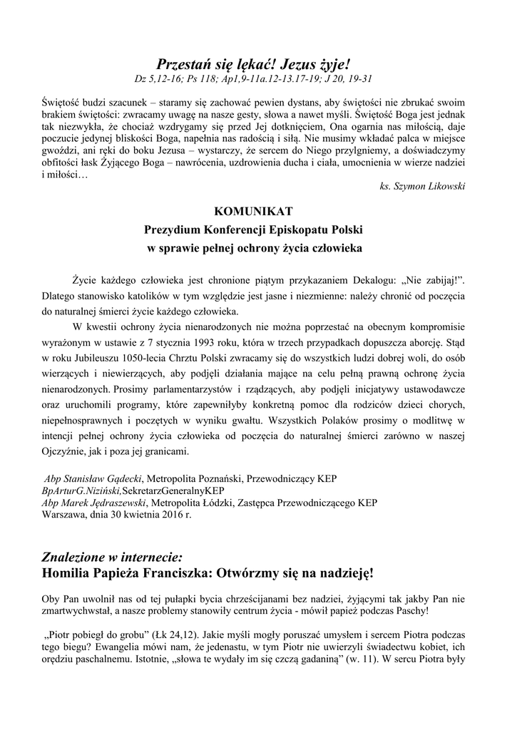 Przestań się lękać! Jezus żyje! Dz 5,12-16; Ps 118; Ap1,9-11a.12-13.17-19; J 20, 19-31 Świętość budzi szacunek – staramy się zachować pewien dystans, aby świętości nie zbrukać swoim brakiem świętości: zwracamy uwagę na nasze gesty, słowa a nawet myśli. Świętość Boga jest jednak tak niezwykła, że chociaż wzdrygamy się przed Jej dotknięciem, Ona ogarnia nas miłością, daje poczucie jedynej bliskości Boga, napełnia nas radością i siłą. Nie musimy wkładać palca w miejsce gwoździ, ani ręki do boku Jezusa – wystarczy, że sercem do Niego przylgniemy, a doświadczymy obfitości łask Żyjącego Boga – nawrócenia, uzdrowienia ducha i ciała, umocnienia w wierze nadziei i miłości… ks. Szymon Likowski KOMUNIKAT Prezydium Konferencji Episkopatu Polski w sprawie pełnej ochrony życia człowieka Życie każdego człowieka jest chronione piątym przykazaniem Dekalogu: „Nie zabijaj!”. Dlatego stanowisko katolików w tym względzie jest jasne i niezmienne: należy chronić od poczęcia do naturalnej śmierci życie każdego człowieka. W kwestii ochrony życia nienarodzonych nie można poprzestać na obecnym kompromisie wyrażonym w ustawie z 7 stycznia 1993 roku, która w trzech przypadkach dopuszcza aborcję. Stąd w roku Jubileuszu 1050-lecia Chrztu Polski zwracamy się do wszystkich ludzi dobrej woli, do osób wierzących i niewierzących, aby podjęli działania mające na celu pełną prawną ochronę życia nienarodzonych. Prosimy parlamentarzystów i rządzących, aby podjęli inicjatywy ustawodawcze oraz uruchomili programy, które zapewniłyby konkretną pomoc dla rodziców dzieci chorych, niepełnosprawnych i poczętych w wyniku gwałtu. Wszystkich Polaków prosimy o modlitwę w intencji pełnej ochrony życia człowieka od poczęcia do naturalnej śmierci zarówno w naszej Ojczyźnie, jak i poza jej granicami. Abp Stanisław Gądecki, Metropolita Poznański, Przewodniczący KEP BpArturG.Niziński,SekretarzGeneralnyKEP Abp Marek Jędraszewski, Metropolita Łódzki, Zastępca Przewodniczącego KEP Warszawa, dnia 30 kwietnia 2016 r. Znalezione w internecie: Homilia Papieża Franciszka: Otwórzmy się na nadzieję! Oby Pan uwolnił nas od tej pułapki bycia chrześcijanami bez nadziei, żyjącymi tak jakby Pan nie zmartwychwstał, a nasze problemy stanowiły centrum życia - mówił papież podczas Paschy! „Piotr pobiegł do grobu” (Łk 24,12). Jakie myśli mogły poruszać umysłem i sercem Piotra podczas tego biegu? Ewangelia mówi nam, że jedenastu, w tym Piotr nie uwierzyli świadectwu kobiet, ich orędziu paschalnemu. Istotnie, „słowa te wydały im się czczą gadaniną” (w. 11). W sercu Piotra były zatem wątpliwości, którym towarzyszyło wiele myśli negatywnych: smutek po śmierci umiłowanego Mistrza i zawód z powodu zaparcia się Go trzykrotnie w czasie Męki. Pojawia się jednak szczegół, który zaznacza jego przełom: Piotr, po wysłuchaniu kobiet i nie uwierzywszy im, jednakże „wybrał się” (w. 12). Nie został siedząc i myśląc, nie pozostał zamknięty w domu, jak inni. Nie dał się uwięzić w pułapce przez mroczną atmosferę tamtych dni, ani też przytłoczyć swoimi wątpliwościami; nie dał się pochłonąć wyrzutami sumienia, lękiem i nieustannymi plotkami, które prowadzą donikąd. Poszukiwał Jezusa, a nie samego siebie. Wolał drogę spotkania i zaufania. Tak jak był powstał i pobiegł do grobu, skąd później powrócił „dziwiąc się temu, co się stało” (w. 12). To był początek zmartwychwstania Piotra, zmartwychwstania jego serca. Nie popadając w smutek i ciemności, uczynił miejsce dla głosu nadziei: pozwolił aby światło Boga weszło w jego serce, nie przytłumiając go. Również kobiety, które wyszły wcześnie rano, aby wypełnić dzieło miłosierdzia, aby zanieść do grobu wonności, przeżywały to samo doświadczenie. Były „przestraszone i pochyliły twarze ku ziemi”, ale były wstrząśnięte słysząc słowa anioła: „Dlaczego szukacie żyjącego wśród umarłych?” (w. 5). Również my, podobnie jak Piotr i kobiety, nie możemy odnaleźć życia pozostając smutni i bez nadziei. Nie trwajmy uwięzionymi w sobie, ale otwórzmy dla Pana nasze zapieczętowane groby, aby wszedł Jezus i obdarzył nas życiem; zanieśmy do Niego kamienie uraz i głazy przeszłości, ciężkie skały słabości i upadków. On chce przyjść i wziąć nas za rękę, aby nas wyrwać z lęku. Ale pierwszym kamieniem, jaki trzeba odsunąć tej nocy jest brak nadziei, zamykający nas w sobie samych. Oby Pan uwolnił nas od tej pułapki bycia chrześcijanami bez nadziei, żyjącymi tak jakby Pan nie zmartwychwstał, a nasze problemy stanowiły centrum życia. Widzimy i nieustannie będziemy widzieli problemy wokół nas i w nas samych. Będą one zawsze, ale tej nocy trzeba rozjaśnić takie problemy światłem Zmartwychwstałego, w pewnym sensie je „ewangelizując”. Nie pozwólmy, aby ciemności i lęki przyciągały wzrok duszy i zawładnęły sercem, ale głośmy Pana „nie ma Go tutaj; zmartwychwstał” (w. 6); On jest naszą największą radością, jest zawsze obok nas i nigdy nas nie zawiedzie. To jest fundament nadziei, która nie jest zwykłym optymizmem, ani też postawą psychologiczną czy życzliwą zachętą, by dodać sobie odwagi. Nadzieja chrześcijańska jest darem, jakim obdarza nas Bóg, jeśli wyjdziemy z naszych ograniczeń i otworzymy się na Niego. Ta nadzieja jesz niezawodna ponieważ Duch Święty został rozlany w naszych sercach (por. Rz 5,5). Pocieszyciel nie sprawia, że wszystko ładnie wygląda, nie eliminuje zła za pomocą magicznej różdżki, ale wzbudza prawdziwą siłę życia, która nie jest brakiem problemów, ale pewnością, że jesteśmy kochani i zawsze otrzymujemy przebaczenie od Chrystusa, który dla nas zwyciężył grzech, śmierć i lęk. Dzisiaj jest święto naszej nadziei, celebracja tej pewności: nikt i nic nie mo