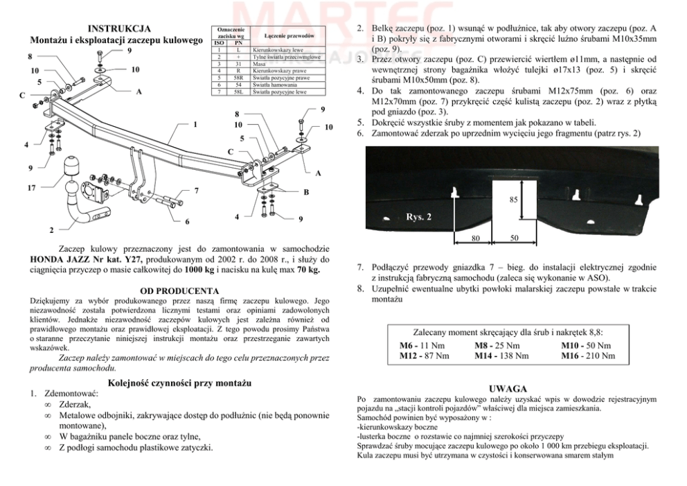 INSTRUKCJA MontaŜu i eksploatacji zaczepu kulowego 9 8 10 10 5 A C Oznaczenie zacisku wg ISO PN 1 L 2 + 3 31 4 R 5 58R 6 54 7 58L Łączenie przewodów Kierunkowskazy lewe Tylne światła przeciwmgłowe Masa Kierunkowskazy prawe Światła pozycyjne prawe Światła hamowania Światła pozycyjne lewe 9 8 10 1 10 5 4 2. Belkę zaczepu (poz. 1) wsunąć w podłuŜnice, tak aby otwory zaczepu (poz. A i B) pokryły się z fabrycznymi otworami i skręcić luźno śrubami M10x35mm (poz. 9). 3. Przez otwory zaczepu (poz. C) przewiercić wiertłem ø11mm, a następnie od wewnętrznej strony bagaŜnika włoŜyć tulejki ø17x13 (poz. 5) i skręcić śrubami M10x50mm (poz. 8). 4. Do tak zamontowanego zaczepu śrubami M12x75mm (poz. 6) oraz M12x70mm (poz. 7) przykręcić część kulistą zaczepu (poz. 2) wraz z płytką pod gniazdo (poz. 3). 5. Dokręcić wszystkie śruby z momentem jak pokazano w tabeli. 6. Zamontować zderzak po uprzednim wycięciu jego fragmentu (patrz rys. 2) C 9 A 17 7 B 85 6 4 9 Rys. 2 2 80 Zaczep kulowy przeznaczony jest do zamontowania w samochodzie HONDA JAZZ Nr kat. Y27, produkowanym od 2002 r. do 2008 r., i słuŜy do ciągnięcia przyczep o masie całkowitej do 1000 kg i nacisku na kulę max 70 kg. OD PRODUCENTA Dziękujemy za wybór produkowanego przez naszą firmę zaczepu kulowego. Jego niezawodność została potwierdzona licznymi testami oraz opiniami zadowolonych klientów. JednakŜe niezawodność zaczepów kulowych jest zaleŜna równieŜ od prawidłowego montaŜu oraz prawidłowej eksploatacji. Z tego powodu prosimy Państwa o staranne przeczytanie niniejszej instrukcji montaŜu oraz przestrzeganie zawartych wskazówek. Zaczep naleŜy zamontować w miejscach do tego celu przeznaczonych przez producenta samochodu. Kolejność czynności przy montaŜu 1. Zdemontować: • Zderzak, • Metalowe odbojniki, zakrywające dostęp do podłuŜnic (nie będą ponownie montowane), • W bagaŜniku panele boczne oraz tylne, • Z podłogi samochodu plastikowe zatyczki. 50 7. Podłączyć przewody gniazdka 7 – bieg. do instalacji elektrycznej zgodnie z instrukcją fabryczną samochodu (zaleca się wykonanie w ASO). 8. Uzupełnić ewentualne ubytki powłoki malarskiej zaczepu powstałe w trakcie montaŜu Zalecany moment skręcający dla śrub i nakrętek 8,8: M6 - 11 Nm M8 - 25 Nm M10 - 50 Nm M12 - 87 Nm M14 - 138 Nm M16 - 210 Nm UWAGA Po zamontowaniu zaczepu kulowego naleŜy uzyskać wpis w dowodzie rejestracyjnym pojazdu na „stacji kontroli pojazdów” właściwej dla miejsca zamieszkania. Samochód powinien być wyposaŜony w : -kierunkowskazy boczne -lusterka boczne o rozstawie co najmniej szerokości przyczepy Sprawdzać śruby mocujące zaczepu kulowego po około 1 000 km przebiegu eksploatacji. Kula zaczepu musi być utrzymana w czystości i konserwowana smarem stałym PPUH AUTO-HAK S.J. WyposaŜenie zaczepu: Produkcja Zaczepów Kulowych Henryk & Zbigniew Nejman 76-200 SŁUPSK ul. Słoneczna 16K tel/fax (059) 8-414-414; 8-414-413 E-mail: [email protected] www. autohak.com.pl Zaczep kulowy bez wyposaŜenia elektrycznego Y27 Klasa: A50-X Nr kat. Przeznaczony do zamontowania w samochodzie: Producent: HONDA Model: JAZZ produkowanego od 2002 r. do 2008 r. Dane techniczne: Wartość siły D : 5,84 kN maksymalna masa przyczepy: 1000 kg maksymalny nacisk na kulę: 70 kg Numer homologacji zgodnie z Dyrektywą 94/20/WE: e20*94/20*0655*00 KARTA GWARANCYJNA Producent udziela gwarancji niniejszą kartą gwarancyjną na okres 24 miesięcy licząc od dnia zakupu zaczepu kulowego do samochodu: HONDA JAZZ produkowanego od 2002 r. do 2008 r. Data produkcji .............................. Data zakupu............................................ Zakres gwarancji obejmuje wyłącznie wady jakościowe wynikające z winy producenta. Gwarancja nie obejmuje natomiast uszkodzeń zawinionych przez nabywcę, wynikających z niewłaściwego montaŜu, uŜytkowania lub konserwacji, uszkodzeń mechanicznych, normalnego zuŜycia podczas eksploatacji itp. Gwarancja udzielona na zakupiony towar nie wyłącza, nie ogranicza ani nie zawiesza uprawnień kupującego wynikających z niezgodności towaru z umową. Reklamacje naleŜy zgłaszać w punkcie sprzedaŜy, składając jednocześnie kartę gwarancyjną. Usunięcie "wady" następuje po stwierdzeniu przez punkt sprzedaŜy wspólnie z producentem słuszności złoŜonej reklamacji. Reklamacja powinna być załatwiona w ciągu 14 dni od dnia uznania reklamacji. Karta gwarancyjna jest niewaŜna jeŜeli nie jest wypełniona i podpisana. INFORMACJA WSTĘPNA Zaczep kulowy jest skonstruowany zgodnie z zasadami bezpieczeństwa ruchu drogowego. Zaczep kulowy jest elementem wpływającym na bezpieczeństwo jazdy i moŜe zostać zainstalowany wyłącznie przez personel wyspecjalizowany. Niedopuszczalne jest dokonywanie jakichkolwiek zmian w konstrukcji zaczepu. Powoduje to wygaśniecie dopuszczenia do stosowania. W przypadku obecności masy izolacyjnej lub osłony podwozia w miejscu przylegania zaczepu, naleŜy ją usunąć. Nieosłonięte miejsca karoserii oraz wywiercone otwory naleŜy pomalować farbą antykorozyjną. Informacjami wiąŜącymi odnośnie wartości obciąŜeń są dane podawane przez producenta samochodu, względnie wartości maksymalnej masy przyczepy oraz maksymalnego nacisku na kulę, przy czym wartości parametrów zaczepu kulowego nie mogą być przekroczone. Wzór do obliczania wartości siły D: Maks. masa przyczepy [kg] x Maks. masa samochodu [kg] Maks. masa przyczepy [kg] + Maks. masa samochodu [kg] Data zgłoszenia reklamacji: ................................................................... X 9,81 = 1000 D [kN]