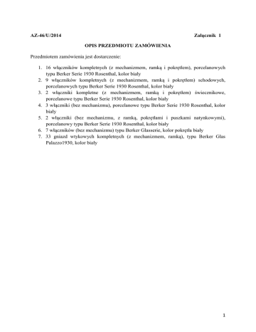 Załącznik 1 AZ-46/U/2014 OPIS PRZEDMIOTU ZAMÓWIENIA Przedmiotem zamówienia jest dostarczenie: 1. 16 włączników kompletnych (z mechanizmem, ramką i pokrętłem), porcelanowych typu Berker Serie 1930 Rosenthal, kolor biały 2. 9 włączników kompletnych (z mechanizmem, ramką i pokrętłem) schodowych, porcelanowych typu Berker Serie 1930 Rosenthal, kolor biały 3. 2 włączniki kompletne (z mechanizmem, ramką i pokrętłem) świecznikowe, porcelanowe typu Berker Serie 1930 Rosenthal, kolor biały 4. 3 włączniki (bez mechanizmu), porcelanowe typu Berker Serie 1930 Rosenthal, kolor biały 5. 2 włączniki (bez mechanizmu, z ramką, pokrętłami i puszkami natynkowymi), porcelanowy typu Berker Serie 1930 Rosenthal, kolor biały 6. 7 włączników (bez mechanizmu) typu Berker Glasserie, kolor pokrętła biały 7. 33 gniazd wtykowych kompletnych (z mechanizmem, ramką), typu Berker Glas Palazzo1930, kolor biały 1