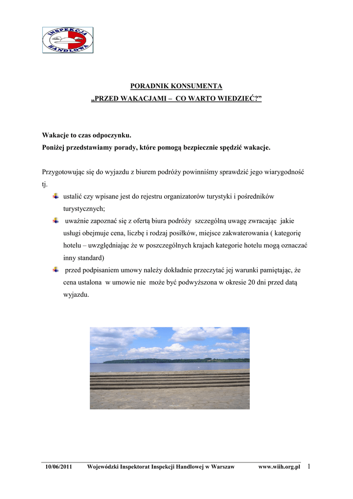 PORADNIK KONSUMENTA „PRZED WAKACJAMI – CO WARTO WIEDZIEĆ?” Wakacje to czas odpoczynku. Poniżej przedstawiamy porady, które pomogą bezpiecznie spędzić wakacje. Przygotowując się do wyjazdu z biurem podróży powinniśmy sprawdzić jego wiarygodność tj. ustalić czy wpisane jest do rejestru organizatorów turystyki i pośredników turystycznych; uważnie zapoznać się z ofertą biura podróży szczególną uwagę zwracając jakie usługi obejmuje cena, liczbę i rodzaj posiłków, miejsce zakwaterowania ( kategorię hotelu – uwzględniając że w poszczególnych krajach kategorie hotelu mogą oznaczać inny standard) przed podpisaniem umowy należy dokładnie przeczytać jej warunki pamiętając, że cena ustalona w umowie nie może być podwyższona w okresie 20 dni przed datą wyjazdu. 10/06/2011 Wojewódzki Inspektorat Inspekcji Handlowej w Warszaw www.wiih.org.pl 1 Kiedy już przebywamy na urlopie zażywając kąpieli wodnych i słonecznych PAMIĘTAJMY!, aby: korzystać z okularów przeciwsłonecznych chroniących przed olśnieniem słonecznym, które posiadają: trwałe oznakowanie znakiem CE, informację dotyczącą kategorii soczewek od 0-4 ( kategoria 4 oznacza ,że okularów nie wolno używać do prowadzenia pojazdów), instrukcję w której powinny się znaleźć uwagi dotyczące czyszczenia okularów oraz warunki ich przechowywania. korzystać z kąpielisk i miejsc do tego wyznaczonych na których zapewniono dyżury ratowników. Kąpielisko powinno być oznaczone przy użyciu tablicy informacyjnej widocznej i czytelnej zawierającej napis: „Kąpielisko” lub „ Miejsce wykorzystywane do kąpieli” oraz m.in. dane gminy odpowiedzialnej za wyznaczenie i prowadzenie ewidencji kąpielisk; dane organizatora kąpieliska. Ponadto w miejscu widocznym winien być umieszczony regulamin kąpielisk w szczególności zawierający zakaz wstępu osobom, których stan wskazuje na spożycie alkoholu, zakaz sprzedaży, podawania, wnoszenia i spożywania napojów alkoholowych; postanowienia, że: dzieci do lat 7 mogą przebywać na terenie kąpieliska oraz kąpać się wyłącznie pod opieką osób pełnoletnich, wszystkie osoby znajdujące się na terenie kąpieliska są obowiązane podporządkować się nakazom ratowników pełniących dyżur. Wypożyczając sprzęt pływający tj. kajaki, łodzie, rowery wodne koniecznie należy sprawdzić czy nie posiadają pęknięć poszycia, dziur, śladów korozji. 10/06/2011 Wojewódzki Inspektorat Inspekcji Handlowej w Warszaw www.wiih.org.pl 2 pływając kajakiem lub łódką, żaglówką trzeba pamiętać, że nasze bezpieczeństwo zwiększa korzystanie z środków asekuracyjnych i kamizelek ratunkowych Do tych wyrów powinny być załączone: informacja dotycząca zakresu wielkości np. zakres obwodu klatki piersiowej i masy ciała użytkownika, prosta instrukcja zakładania i regulacji ,użytkowania, przechowywania, nadzoru czyszczenia i konserwacji. ostrzeżenia o treści: „Nie używaj jako poduszki”, „Przeszkolić przed stosowaniem niniejszego urządzenia”, „Naucz dziecko, aby do wody wchodziło ze środkiem asekuracyjnym, jeśli jest przeznaczony dla dzieci”. 10/06/2011 Wojewódzki Inspektorat Inspekcji Handlowej w Warszaw www.wiih.org.pl 3 Latem częściej uprawiamy ruch na świeżym powietrzu - jeździmy na rowerach, rolkach, deskorolkach czy hulajnogach.. Kupując rower czy hulajnogę należy sprawdzić czy: wykonany jest w sposób zapewniający bezpieczeństwo użytkowania m.in. wszystkie wystające części i krawędzie, które mogą mieć kontakt z częściami ciała użytkownika są zaokrąglone lub stępione tak, aby zapobiegać urazom rower posiada co najmniej dwa niezależne układy hamulcowe ( jeden działający na przednie, drugi na tylne koło) działające bez zakleszczeń hulajnoga posiada koła wykonane z materiałów o właściwościach przeciwpoślizgowych, a jej mechanizm hamowania działa stopniowo nie powodując nagłego zatrzymania wyposażony jest w instrukcję sporządzoną w języku polskim zawierającą informacje niezbędne do bezpiecznego użytkowania m.in. rodzaj terenu, nawierzchni odpowiednimi dla danego rodzaju wyrobu, z ostrzeżeniem o niebezpieczeństwie w przypadku nieprawidłowego użytkowania; sposób przygotowania roweru lub hulajnogi do jazdy ( m.in. dopasowanie wysokości siodełka, kierownicy roweru); zasady działania układu hamulcowego i poprawnych technik hamowania ( w przypadku hulajnogi); zalecenia dotyczące bezpiecznej jazdy w tym: regularnego sprawdzania hamulców, układu kierowniczego, oraz poradę dla użytkownika dotyczącą stosowania sprzętu ochronnego m.in. kasku, ochraniaczy kolan, łokci. 10/06/2011 Wojewódzki Inspektorat Inspekcji Handlowej w Warszaw www.wiih.org.pl 4 Kupując wyrób stanowiący ochronę przed uszkodzeniami ciała należy sprawdzić czy jest on oznaczony znakiem CE i dopasować jego rozmiar do wielkości ciała, gdyż nawet najbezpieczniejsze ochraniacze są bezużyteczne, jeżeli nie są prawidłowo dopasowane do rozmiaru użytkownika. Wojewódzki Inspektorat Inspekcji Handlowej w Warszawie Sienkiewicza 3, 00-015 Warszawa [email protected] www.wiih.org.pl 10/06/2011 Wojewódzki Inspektorat Inspekcji Handlowej w Warszaw www.wiih.org.pl 5