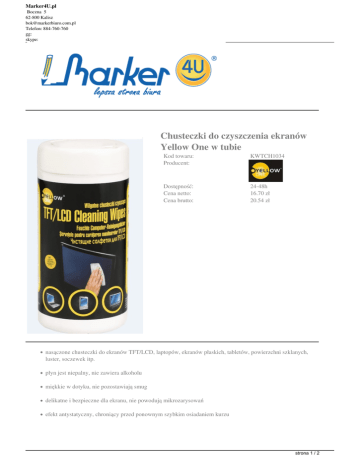 Marker4U.pl Boczna 5 62-800 Kalisz [email protected] Telefon: 884-760-760 gg: skype: Chusteczki do czyszczenia ekranów Yellow One w tubie Kod towaru: Producent: KWTCH1034 Dostępność: Cena netto: Cena brutto: 24-48h 16.70 zł 20.54 zł nasączone chusteczki do ekranów TFT/LCD, laptopów, ekranów płaskich, tabletów, powierzchni szklanych, luster, soczewek itp. płyn jest niepalny, nie zawiera alkoholu miękkie w dotyku, nie pozostawiają smug delikatne i bezpieczne dla ekranu, nie powodują mikrozarysowań efekt antystatyczny, chroniący przed ponownym szybkim osiadaniem kurzu strona 1 / 2 Marker4U.pl Boczna 5 62-800 Kalisz [email protected] Telefon: 884-760-760 gg: skype: opakowanie posiada plombę chroniącą przed wysychaniem nie żółkną na bazie papieru nie zawierają polipropylenu 100 sztuk w opakowaniu strona 2 / 2 Powered by TCPDF (www.tcpdf.org)