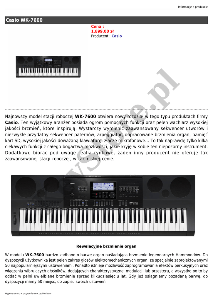 Informacje o produkcie Casio WK-7600 Cena : 1.899,00 zł or e. pl Producent : Casio K ey St Najnowszy model stacji roboczej WK-7600 otwiera nowy rozdział w tego typu produktach firmy Casio. Ten wyjątkowy aranżer posiada ogrom pomocnych funkcji oraz pełen wachlarz wysokiej jakości brzmień, które inspirują. Wystarczy wymienić zaawansowany sekwencer utworów i niezwykle przydatny sekwencer paternów, arpeggiator, dopracowane brzmienia organ, pamięć kart SD, wysokiej jakości doważaną klawiaturę, złącze mikrofonowe… To tak naprawdę tylko kilka ciekawych funkcji z całego bogactwa możliwości, jakie kryję w sobie ten niepozorny instrument. Dodatkowo biorąc pod uwagę realia rynkowe, żaden inny producent nie oferuję tak zaawansowanej stacji roboczej, w tak niskiej cenie. Rewelacyjne brzmienie organ W modelu WK-7600 bardzo zadbano o barwę organ naśladującą brzmienie legendarnych Hammondów. Do dyspozycji użytkownika jest pełen zakres głosów elektromechanicznych organ, ze specjalnie zaprojektowanymi 50 najpopularniejszymi ustawieniami. Ponadto istnieje możliwość zaprogramowania efektów perkusyjnych oraz włączenia wibrujących głośników, dodających charakterystycznej modulacji lub przesteru, a wszystko po to by oddać w pełni uwielbiane brzmienie sprzed kilkudziesięciu lat. Gdy już osiągniemy pożądaną barwę, do dyspozycji mamy 50 miejsc, do zapisu swoich ustawień. Wygenerowano w programie www.oscGold.com Edycja brzmień, o jakiej marzysz Dzięki rozbudowanemu edytorowi barw, mamy możliwość zmiany najważniejszych parametrów takich jak długość narastania dźwięku, długość wybrzmienia, zakończenie dźwięku, vibrato, reverb/chorus, efekty DSP oraz wbudowane, charakterystyczne dla danej barwy właściwości. Całość zmian możemy za każdym razem zapisać lub dodatkowo wzbogacić, o szereg wysokiej jakości ponad 100 różnych efektów. Konfiguracja ich może być również zapisana, co pozwala na eksperymentowanie z innymi barwami. Gdy powstałe brzmienie już nam odpowiada, pozostaje jedynie „podkręcić” je wbudowanym equalizerem by dodać np. świeżości, rozjaśniając barwę lub dodać basu, gdy całość brzmi zbyt płasko. Wysoka funkcjonalność dzięki pamięci ustawień oraz arpeggiatorowi or e. pl Po długich godzinach pracy w studiu, w domu lub na próbie, z pewnością przyda się duża pamięć na wszystkiego rodzaju ustawienia, jakich dokonuje użytkownik, po to by w łatwy sposób przywołać je w każdym momencie na scenie. Właśnie temu służy pamięć registracyjna, z 96 miejscami do zapisu każdego rodzaju zmian w brzmieniach, rytmach i w obsłudze instrumentu. Z filozofii firmy polegającej na produkcji instrumentów zbieżnych z obowiązującymi trendami, wynika również zainstalowanie w najnowszym Casio WK-7600 arpeggiatora. To niezwykle przydatne i inspirujące narzędzie, pozwala na automatyczne odtwarzanie zapętlonych fraz, po zaprogramowaniu ich poprzez klawisze oraz wyborze jednego ze 150 typów. Uchwyć każdy moment St Z najnowszym modelem Casio WK-7600 odkryjesz, jak proste i wygodne może być tworzenie własnych kompozycji. W przypływie natchnienia, żaden nowy utwór nie zostanie stracony dzięki pełnowartościowemu sekwencerowi. Jest on dostępny od ręki, pozwalając na szybki i łatwy zapis oraz edycję, aż do 17 ścieżek. Gotowe kompozycje możesz zapisać w postaci plików MIDI na przenośną kartę SDHC. To, czym Casio WK-7600 zdecydowanie wyróżnia się na rynku to możliwość zapisu na kartę utworów w postaci plików audio. Żaden inny produkt w podobnej cenie, nie posiada takich możliwości. Całość po zgraniu na komputer możemy skonwertować do plików WAV, dzięki darmowej aplikacji Casio Data Manager 6.1. Teraz możesz bez problemu podzielić się swoimi osiągnięciami muzycznymi z najbliższymi, bez zakupu dodatkowych sprzętów. Nagrywanie i komponowanie nigdy nie było tak proste. K ey Szerokie możliwości miksowania Ten model to wyjątkowo ciekawa propozycja dla każdego profesjonalnego muzyka, poszukującego przenośnej stacji roboczej o dużych możliwościach aranżacyjnych. Bez względu na to czy grasz na scenie, czy pracujesz w studiu, posiadasz pełną kontrole nad miksem utworu. Dzięki suwakom dostępnym na przednim panelu, model Casio WK-7600 staję się wysoce funkcjonalnym instrumentem, z łatwym dostępem do poziomu głośności ścieżek, rozłożenia stereofonii, wysyłki efektów dla każdego kanału, w tym również zewnętrznych źródeł dźwięku lub mikrofonu. Sekwencer paternów Ta niezwykle przydatna funkcja pozwala na kreowanie paternów akompaniamentu złożonych z ośmiu ścieżek (perkusja, instrumenty perkusyjne, bas, akordy od 1 do 5). Każdy z nich może być dowolnie zaprogramowany dzięki możliwości nagrywania poszczególnej partii osobno. Ponadto mamy możliwość kombinacji swoich kompozycji z paternami wbudowanymi w instrument oraz edycji każdej poszczególnej partii, poprzez zmianę głośności, pogłosu i innych parametrów, dzięki funkcji Easy Edit. Instrument posiada pełen wachlarz funkcji edycyjnych, takich jak programowanie szczegółowych wydarzeń, kopiowanie i kasowanie zdarzeń, kwantyzacja oraz wiele innych, potrzebnych do stworzenia podkładu dokładnie takiego, jaki zaplanował użytkownik. Informacje o produkcie Ponadto instrument CasioWK-7600 posiada 100 jednostek pamięci do zapisu swoich akompaniamentów, z możliwością łatwego przywołania z panelu użytkownika. Nagrywanie audio i pamięć SD or e. pl Najnowszy Casio WK-7600 posiada wbudowane wejścia mikrofonowe oraz instrumentalne pozwalające podłączyć do instrumentu zewnętrzne źródła dźwięku. Bardzo istotna jest również opcja nagrywania utworów w postaci plików audio, z wykorzystaniem zewnętrznego sygnału. Teraz nie musisz już podłączać komputera, interfejsu i monitorów by dokonać nagrań nowych kompozycji z wykorzystaniem mikro