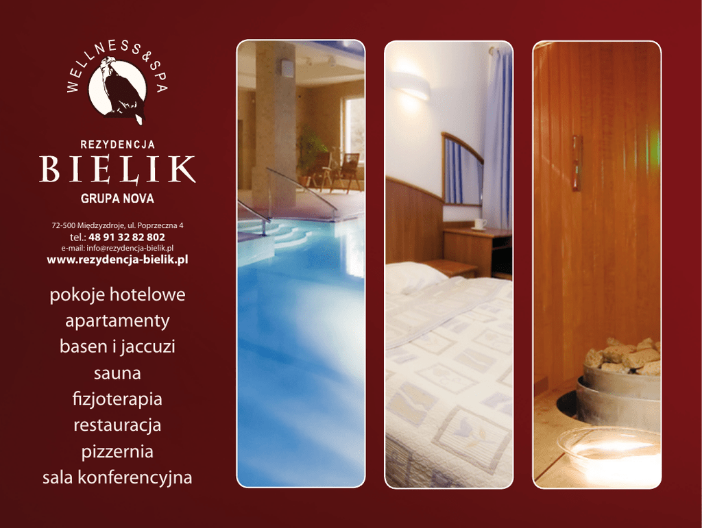 72-500 Międzyzdroje, ul. Poprzeczna 4 tel.: 48 91 32 82 802 e-mail: [email protected] www.rezydencja-bielik.pl pokoje hotelowe apartamenty basen i jaccuzi sauna fizjoterapia restauracja pizzernia sala konferencyjna