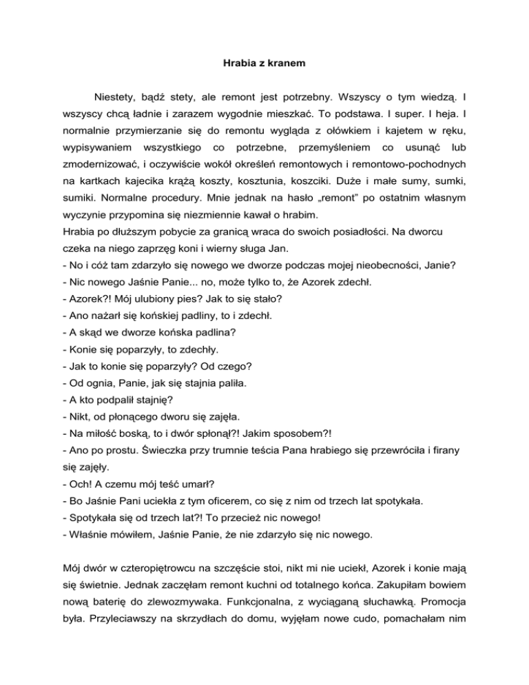 Hrabia z kranem Niestety, bądź stety, ale remont jest potrzebny. Wszyscy o tym wiedzą. I wszyscy chcą ładnie i zarazem wygodnie mieszkać. To podstawa. I super. I heja. I normalnie przymierzanie się do remontu wygląda z ołówkiem i kajetem w ręku, wypisywaniem wszystkiego co potrzebne, przemyśleniem co usunąć lub zmodernizować, i oczywiście wokół określeń remontowych i remontowo-pochodnych na kartkach kajecika krąŜą koszty, kosztunia, koszciki. DuŜe i małe sumy, sumki, sumiki. Normalne procedury. Mnie jednak na hasło „remont” po ostatnim własnym wyczynie przypomina się niezmiennie kawał o hrabim. Hrabia po dłuŜszym pobycie za granicą wraca do swoich posiadłości. Na dworcu czeka na niego zaprzęg koni i wierny sługa Jan. - No i cóŜ tam zdarzyło się nowego we dworze podczas mojej nieobecności, Janie? - Nic nowego Jaśnie Panie... no, moŜe tylko to, Ŝe Azorek zdechł. - Azorek?! Mój ulubiony pies? Jak to się stało? - Ano naŜarł się końskiej padliny, to i zdechł. - A skąd we dworze końska padlina? - Konie się poparzyły, to zdechły. - Jak to konie się poparzyły? Od czego? - Od ognia, Panie, jak się stajnia paliła. - A kto podpalił stajnię? - Nikt, od płonącego dworu się zajęła. - Na miłość boską, to i dwór spłonął?! Jakim sposobem?! - Ano po prostu. Świeczka przy trumnie teścia Pana hrabiego się przewróciła i firany się zajęły. - Och! A czemu mój teść umarł? - Bo Jaśnie Pani uciekła z tym oficerem, co się z nim od trzech lat spotykała. - Spotykała się od trzech lat?! To przecieŜ nic nowego! - Właśnie mówiłem, Jaśnie Panie, Ŝe nie zdarzyło się nic nowego. Mój dwór w czteropiętrowcu na szczęście stoi, nikt mi nie uciekł, Azorek i konie mają się świetnie. Jednak zaczęłam remont kuchni od totalnego końca. Zakupiłam bowiem nową baterię do zlewozmywaka. Funkcjonalna, z wyciąganą słuchawką. Promocja była. Przyleciawszy na skrzydłach do domu, wyjęłam nowe cudo, pomachałam nim tryumfalnie przed nosami domowników, odstawiłam wejście smoka do kuchennej jaskini i... No właśnie. Stary zlew – stary typ. Nie na takie novum. Jako rasowa blondynka spróbowałam racjonalnie pomyśleć: taaaak, mam do wyboru albo oddać baterię, wymyślając na poczekaniu coś zupełnie irracjonalnego, co jednak przełknąłby biedny sprzedawca, albo wymienić zlew. Nie muszę chyba dodawać, Ŝe niemal natychmiast rozmarzyłam się: widziałam taki piękny ostatnio i jakby pasował! Bo przecieŜ czy ja lubię robić z siebie idiotkę w miejscu publicznym, jakim niewątpliwie jest duŜy supersam? Chy-ba-ra-czej-na-pew-no-nie-za-bar-dzo. Ha! Udało mi się przemyśleć sprawę! I w miarę szybko, i usilnie. No więc, hmmm... Rozejrzałam się wokoło. Przydałoby się coś zrobić. A skoro i tak naruszyłabym konstrukcję kuchenną, to wypadałoby odmalować przy okazji ściany, rozejrzeć się za kuchenką, zmienić stół, blaty juŜ stare, szafki się sypią, lodówka płacze... Skoro i tak czeka mnie wyniesienie wszystkiego, grzechem by było nie wymienić glazury i terakoty, wstawić plastika w otwór okienny, a takŜe pochować zbędne rury. Nie ma to przecieŜ jak budownictwo sprzed dwudziestu lat! Zakasałam zatem rękawy, wysłałam towarzystwo na zieloną trawkę, zadzwoniłam po pana Zdzisia i rozpoczęłam wielkie dzieło małej osóbki. Tak między nami, pan Zdzisio stanowił niezły materiał socjologiczno-psychologiczny, opowiadając między jednym pociągnięciem farby a drugim tragiczne historie swojego Ŝycia, bądź, roztaczając wspaniałe wspomnienia wielu podróŜy własnych przy wielokrotnym przenoszeniu tych samych szafek z dobrego miejsca na lepsze. Lub teŜ będąc „enty” raz pasaŜerem mojego autka, zdołał wykrzyknąć niespodziewanie: Eureka! JuŜ wiem, skąd panią znam! Od początku naszej jakŜe miłej znajomości nie dawało mi to spokoju! Czytałem o pani!!! Nie muszę chyba dodawać, Ŝe w tym momencie swoim zachowaniem przyprawił mnie i innych uŜytkowników ruchu drogowego niemal o zawał. A więc stałam się jednostką totalnie aspołeczną na czas bliŜej nieokreślony. Na tym zakończę wątek samego remontu, bo to, poza drobiazgami, nic ciekawego, ani przyjemnego. Dodam tylko, Ŝe pan Zdzisio wykazał się iście pomocną dłonią i wrodzoną zapewne fachowością (twierdzę, Ŝe nie wszystko da się wyuczyć, czynnik wysysania zdolności z mlekiem matki działa przynajmniej w niektórych przypadkach). Owa dłoń i fachowość łączyła niemała tęŜyzna fizyczna, zwaŜywszy na stan faktyczny kwiecia wieku. Chwała za to, Ŝe oboje dotrwaliśmy do końca. Mam nadzieję, Ŝe pan Zdzisio wyszedł ode mnie ukontentowany w równym stopniu, co ja, chłonąc z zachwytem efekt końcowy. Tak więc pewnego pięknego poranka mogłam wreszcie wyjść, a raczej wypełznąć po zakupki i zacząć krzątać się po odremontowanej kuchni – jak za dawnych, dobrych czasów. Ciągnąc sprawunki niemal po ziemi, bo cięŜar udzielanej panu Zdzisiowi pomocy nadal dawał znać o sobie, usłyszałam za plecami: - Heeeeeeeeeeeeeeej. Co tam nowego słychać u ciebie? – Eeee, nic nowego... – wymsknęło mi się markotnie. Napotkana duszyczka, przyjrzała mi się baczniej: - Co ty? Co ci? Czemu taka zmęczona? W ogóle mizerna jakaś jesteś... Chora? MoŜe w ciąŜy?! - Nie tam! Od razu – w ciąŜy! Remont kuchni! Po pełnym zrozumienia „Aaaaaaaa...” na pytanie czy musiałam, przytaknęłam smętnie. Konieczność była. - A co? Sąsiedzi zalali? - Skąd! - Gaz wybuchł?! - Gdzie tam! - Kafelki odpadły? - Bez przesady. - Szafki spadły? - Nic mi nie wiadomo... - Rozumiem, zmieniłaś kuchenne „intérieur”? - Po co??? Meble jeszcze w porządku. Odnowiłam nieco. - Wiem! – tryumfowała – rura poszła?! - Uchowaj BoŜe! - To juŜ nic nie rozumiem... – duszyczka złoŜyła broń. Nie przyszło jej bowiem do głowy, Ŝe moŜna zabrać się za rzecz wielk