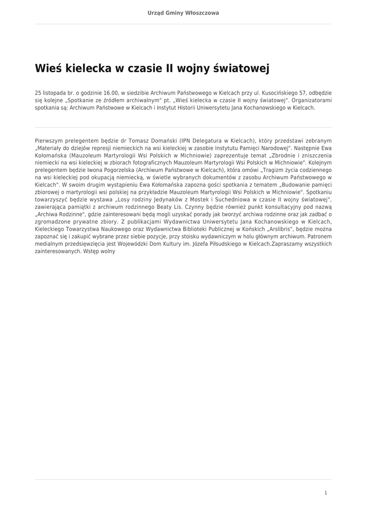 Urząd Gminy Włoszczowa Wieś kielecka w czasie II wojny światowej 25 listopada br. o godzinie 16.00, w siedzibie Archiwum Państwowego w Kielcach przy ul. Kusocińskiego 57, odbędzie się kolejne „Spotkanie ze źródłem archiwalnym" pt. „Wieś kielecka w czasie II wojny światowej". Organizatorami spotkania są: Archiwum Państwowe w Kielcach i Instytut Historii Uniwersytetu Jana Kochanowskiego w Kielcach. Pierwszym prelegentem będzie dr Tomasz Domański (IPN Delegatura w Kielcach), który przedstawi zebranym „Materiały do dziejów represji niemieckich na wsi kieleckiej w zasobie Instytutu Pamięci Narodowej". Następnie Ewa Kołomańska (Mauzoleum Martyrologii Wsi Polskich w Michniowie) zaprezentuje temat „Zbrodnie i zniszczenia niemiecki na wsi kieleckiej w zbiorach fotograficznych Mauzoleum Martyrologii Wsi Polskich w Michniowie". Kolejnym prelegentem będzie Iwona Pogorzelska (Archiwum Państwowe w Kielcach), która omówi „Tragizm życia codziennego na wsi kieleckiej pod okupacją niemiecką, w świetle wybranych dokumentów z zasobu Archiwum Państwowego w Kielcach". W swoim drugim wystąpieniu Ewa Kołomańska zapozna gości spotkania z tematem „Budowanie pamięci zbiorowej o martyrologii wsi polskiej na przykładzie Mauzoleum Martyrologii Wsi Polskich w Michniowie". Spotkaniu towarzyszyć będzie wystawa „Losy rodziny Jedynaków z Mostek i Suchedniowa w czasie II wojny światowej", zawierająca pamiątki z archiwum rodzinnego Beaty Lis. Czynny będzie również punkt konsultacyjny pod nazwą „Archiwa Rodzinne", gdzie zainteresowani będą mogli uzyskać porady jak tworzyć archiwa rodzinne oraz jak zadbać o zgromadzone prywatne zbiory. Z publikacjami Wydawnictwa Uniwersytetu Jana Kochanowskiego w Kielcach, Kieleckiego Towarzystwa Naukowego oraz Wydawnictwa Biblioteki Publicznej w Końskich „Arslibris", będzie można zapoznać się i zakupić wybrane przez siebie pozycje, przy stoisku wydawniczym w holu głównym archiwum. Patronem medialnym przedsięwzięcia jest Wojewódzki Dom Kultury im. Józefa Piłsudskiego w Kielcach.Zapraszamy wszystkich zainteresowanych. Wstęp wolny 1